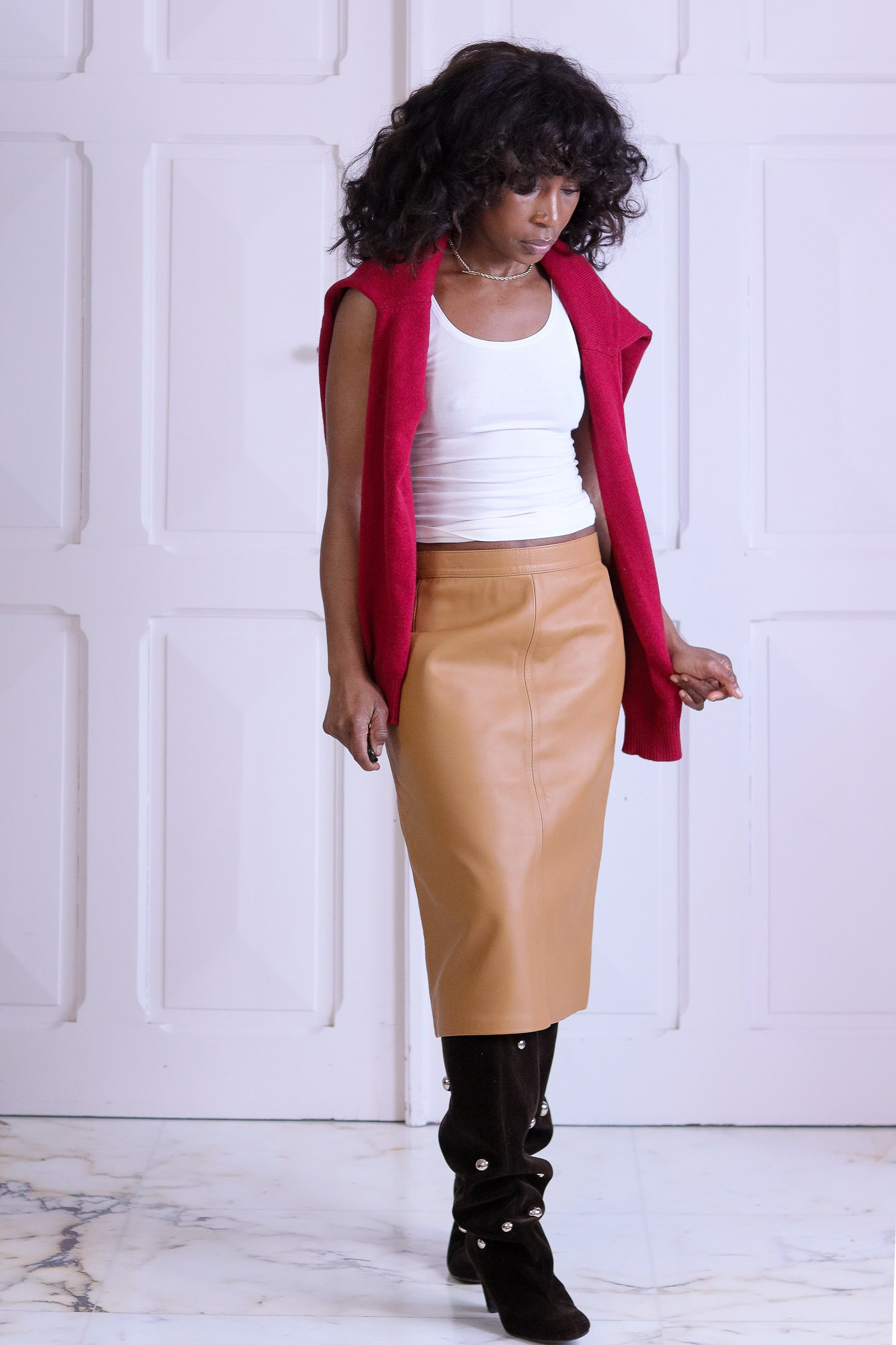 Jupe vintage des années 1980 en cuir véritable de couleur camel. Jupe taille haute , coupe droite, création Alixia Wouston et de fabrication française. On apprécie le charme des détails en cuir des boutons ajoutés au dos de la jupe.