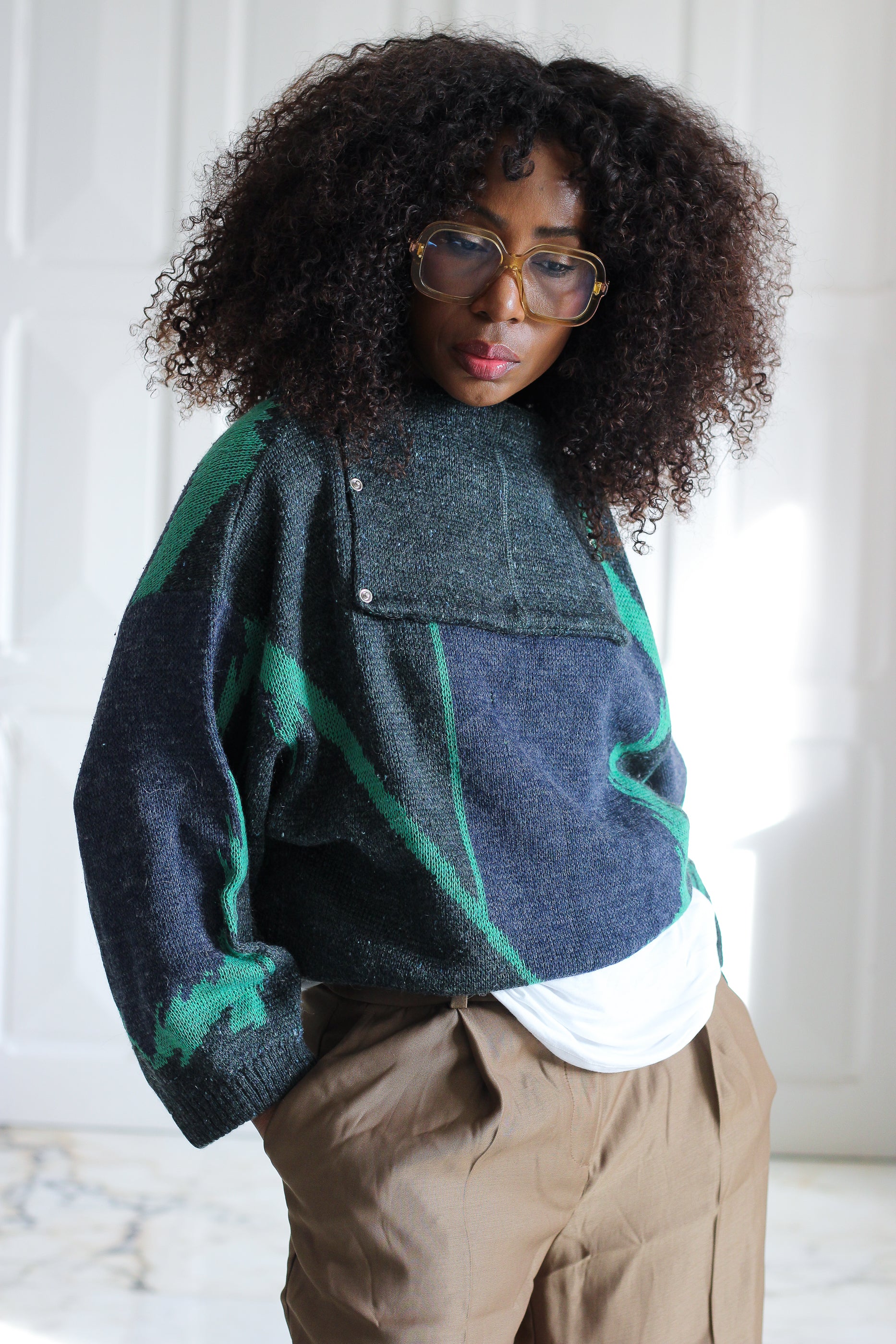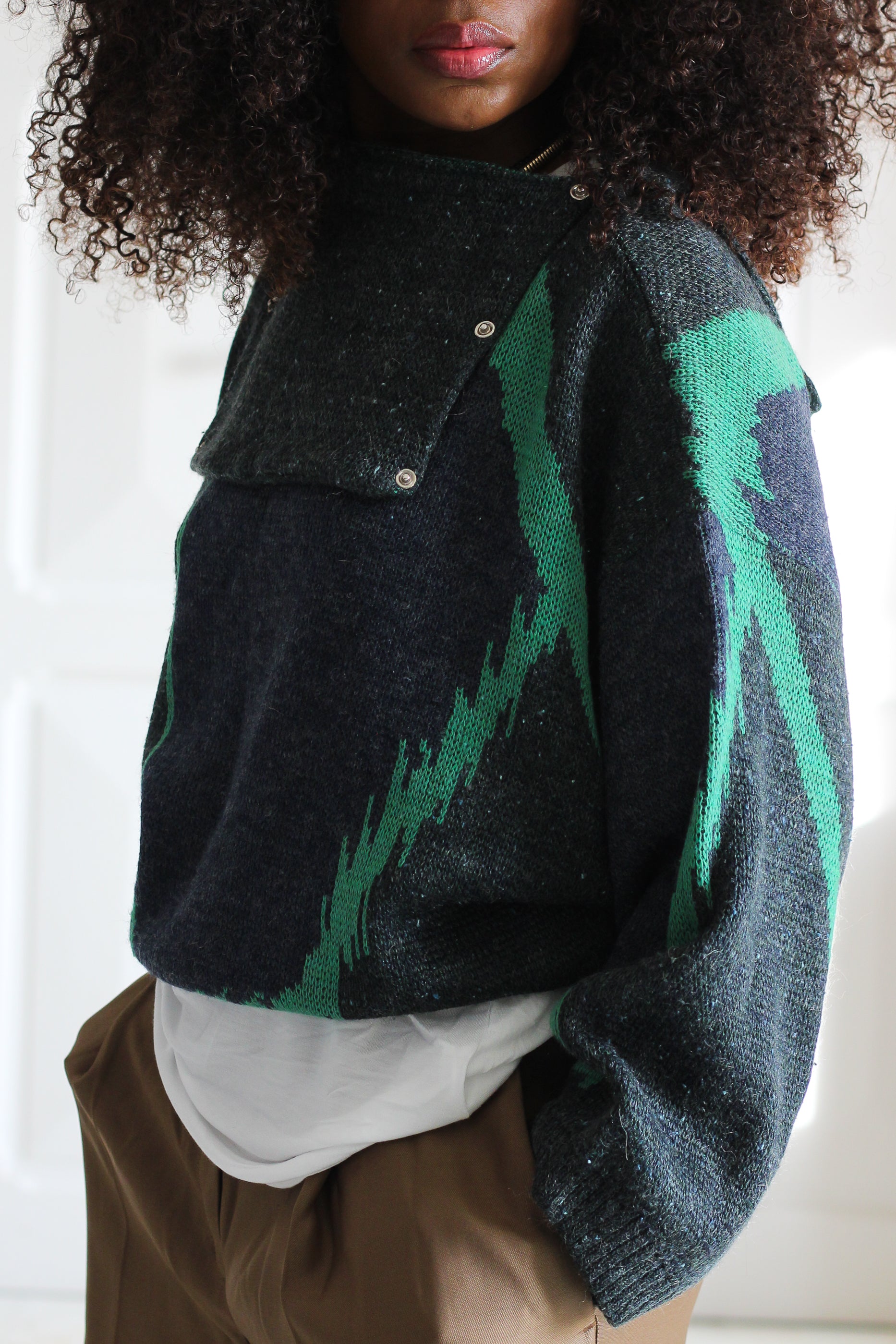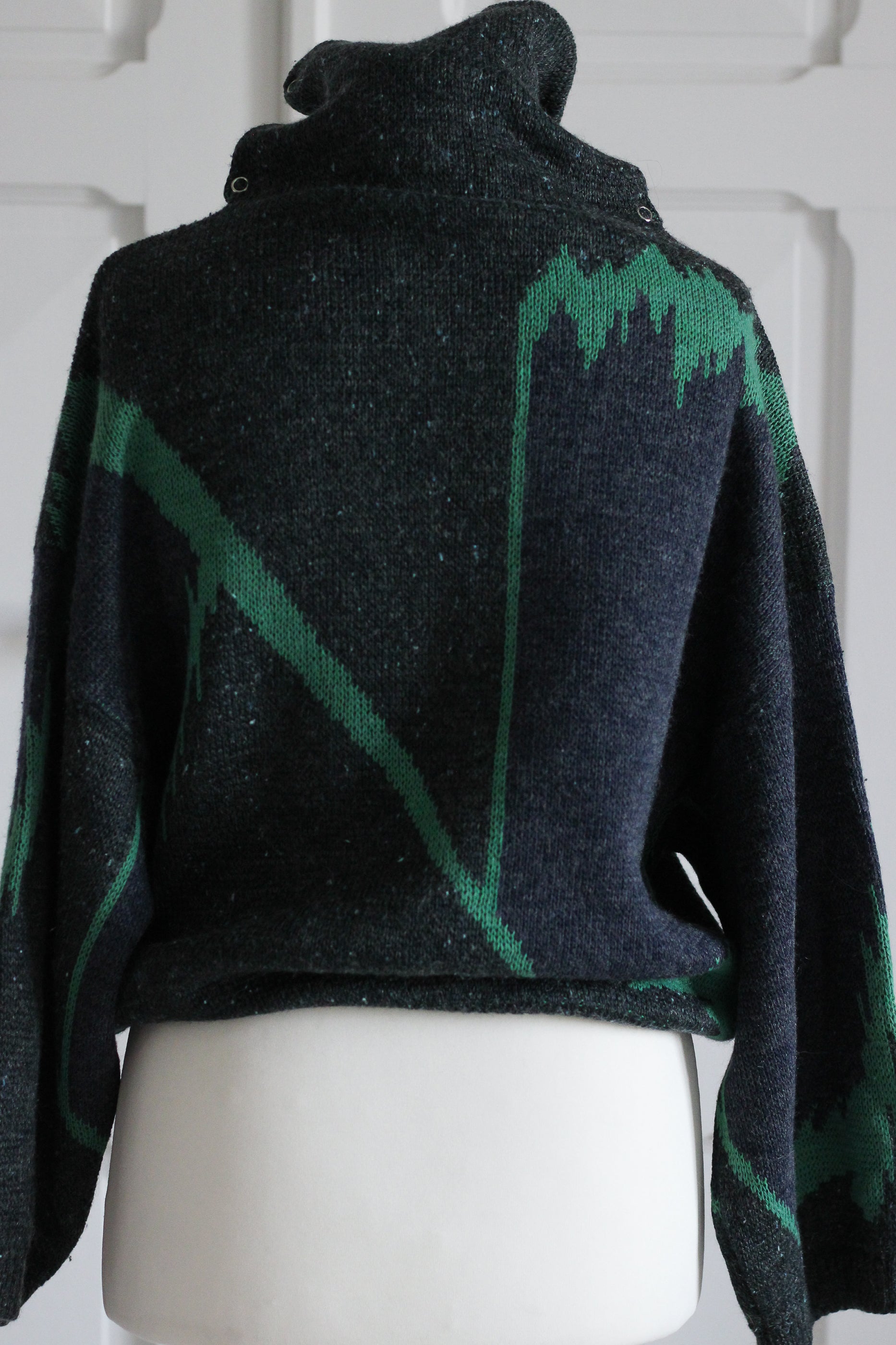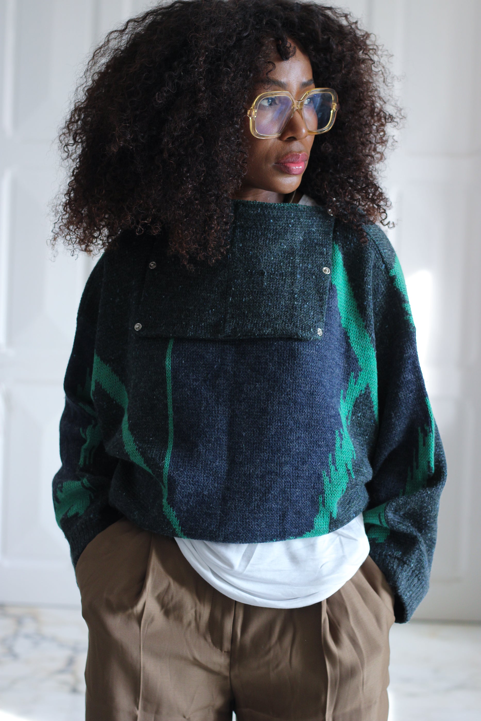 Un pull vintage original et affirmé, idéal pour apporter du relief et de la personnalité à une tenue sobre. Pull vintage à motif graphique à col maxi montant avec bouton à pression. Maille épaisse et chaleureuse composé de 70 % d'acrylique et de 30 % coton. Maille de fabrication d-française et création André Hayat. Belle pièce vintage datant des années 1980