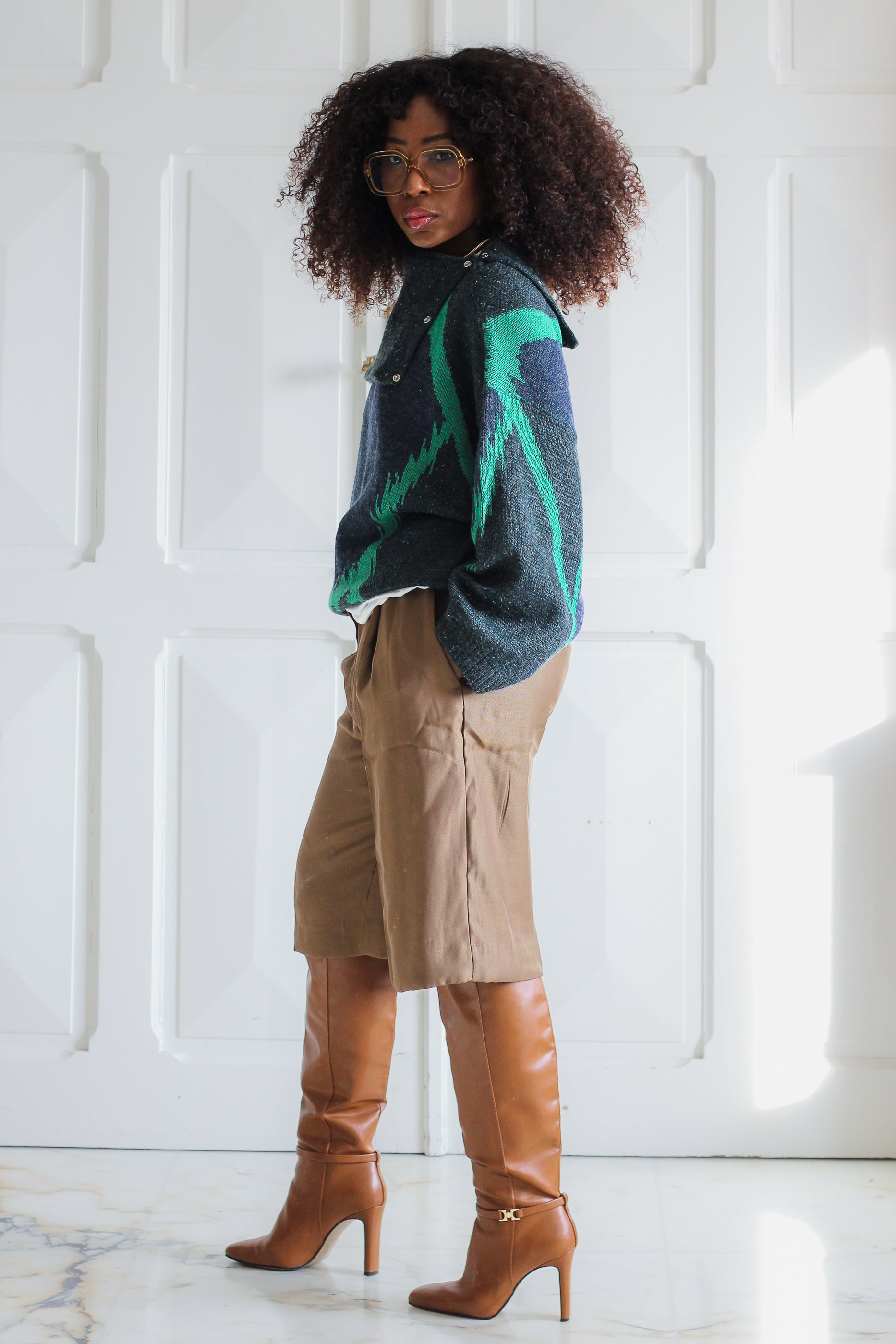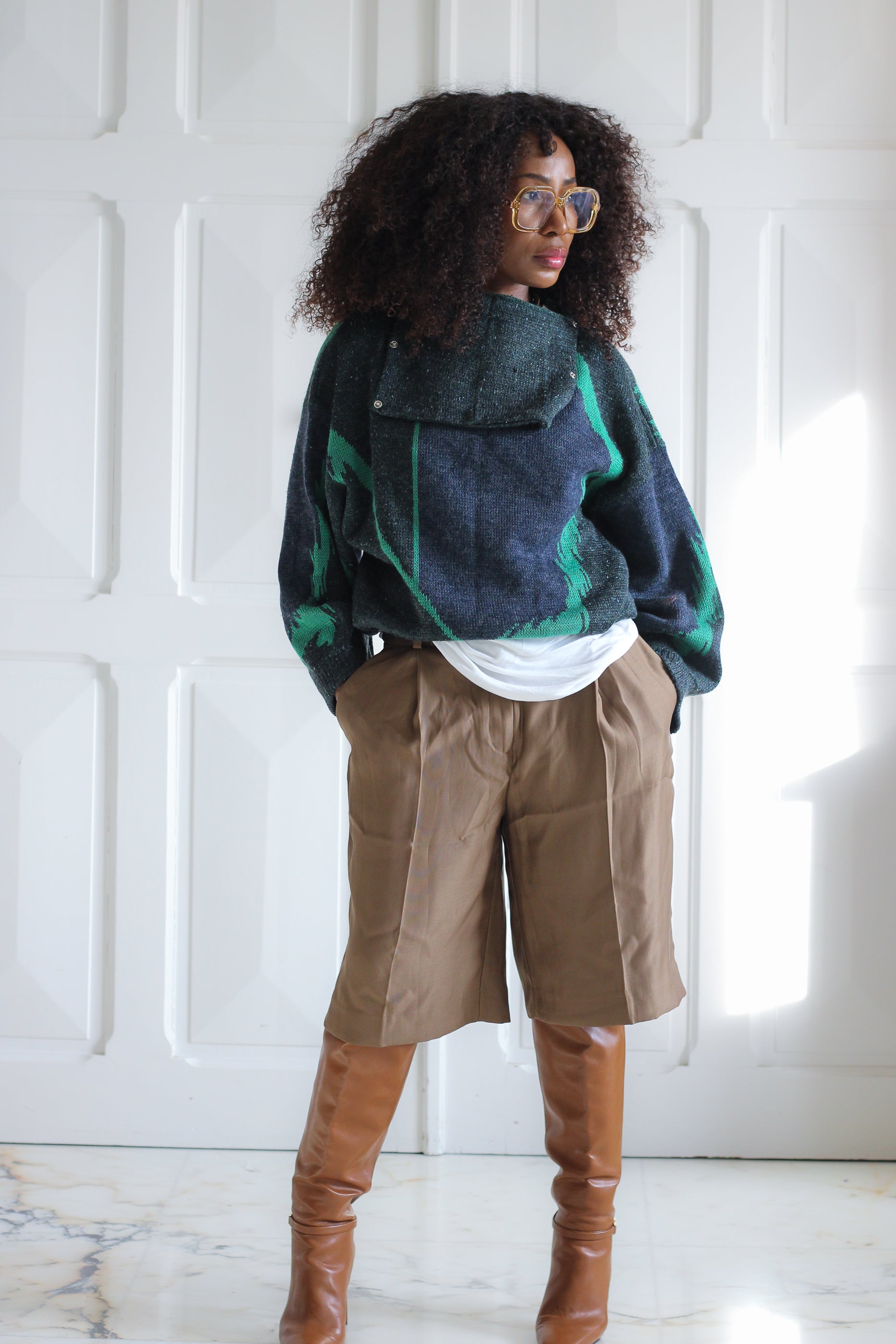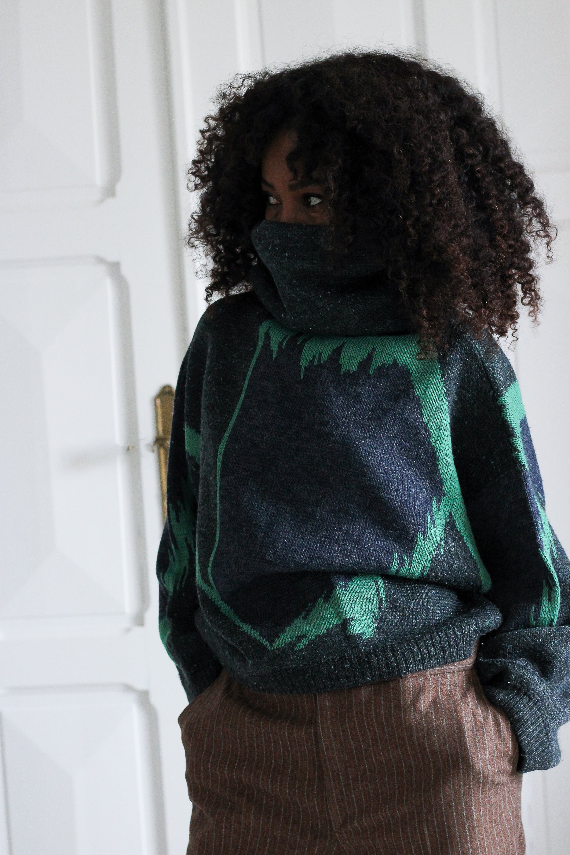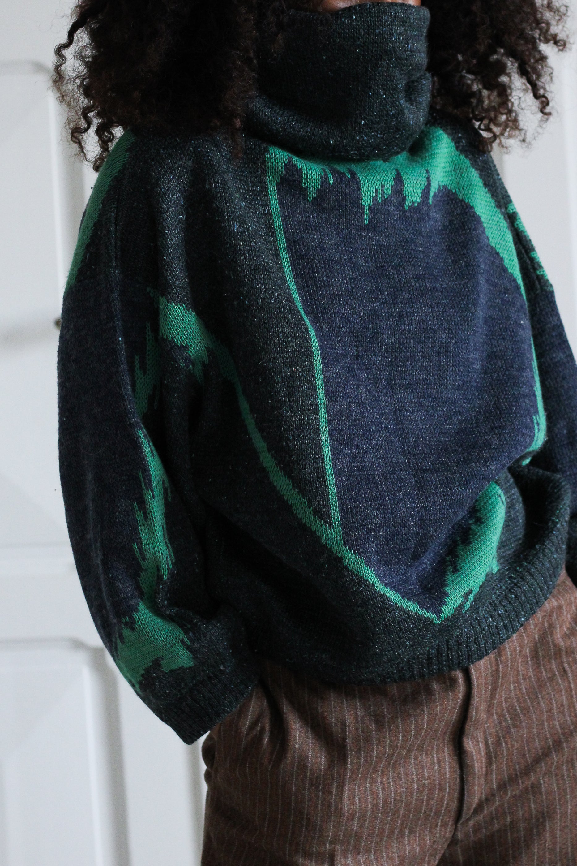 Un pull vintage original et affirmé, idéal pour apporter du relief et de la personnalité à une tenue sobre. Pull vintage à motif graphique à col maxi montant avec bouton à pression. Maille épaisse et chaleureuse composé de 70 % d'acrylique et de 30 % coton. Maille de fabrication d-française et création André Hayat. Belle pièce vintage datant des années 1980