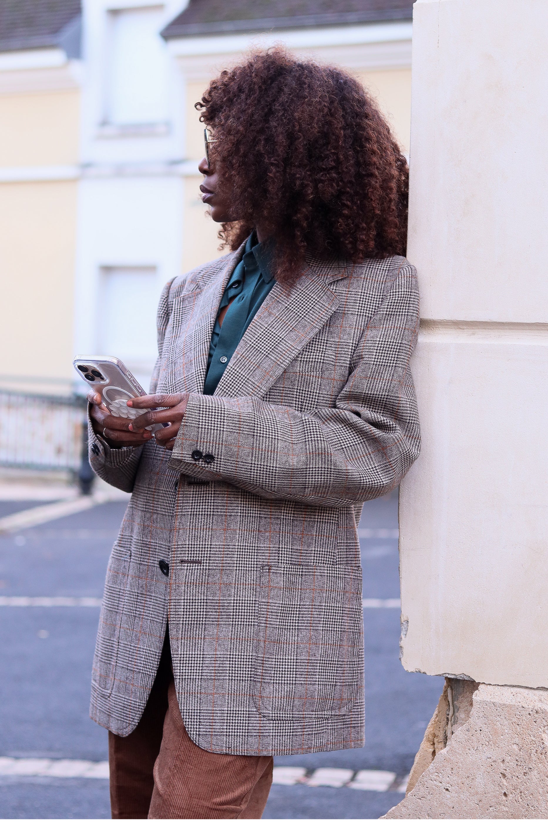 Blazer vintage en laine peignée et polyester signé Eural Tergal, une marque emblématique des années 70. Réalisé dans un tissu prince-de-galles.