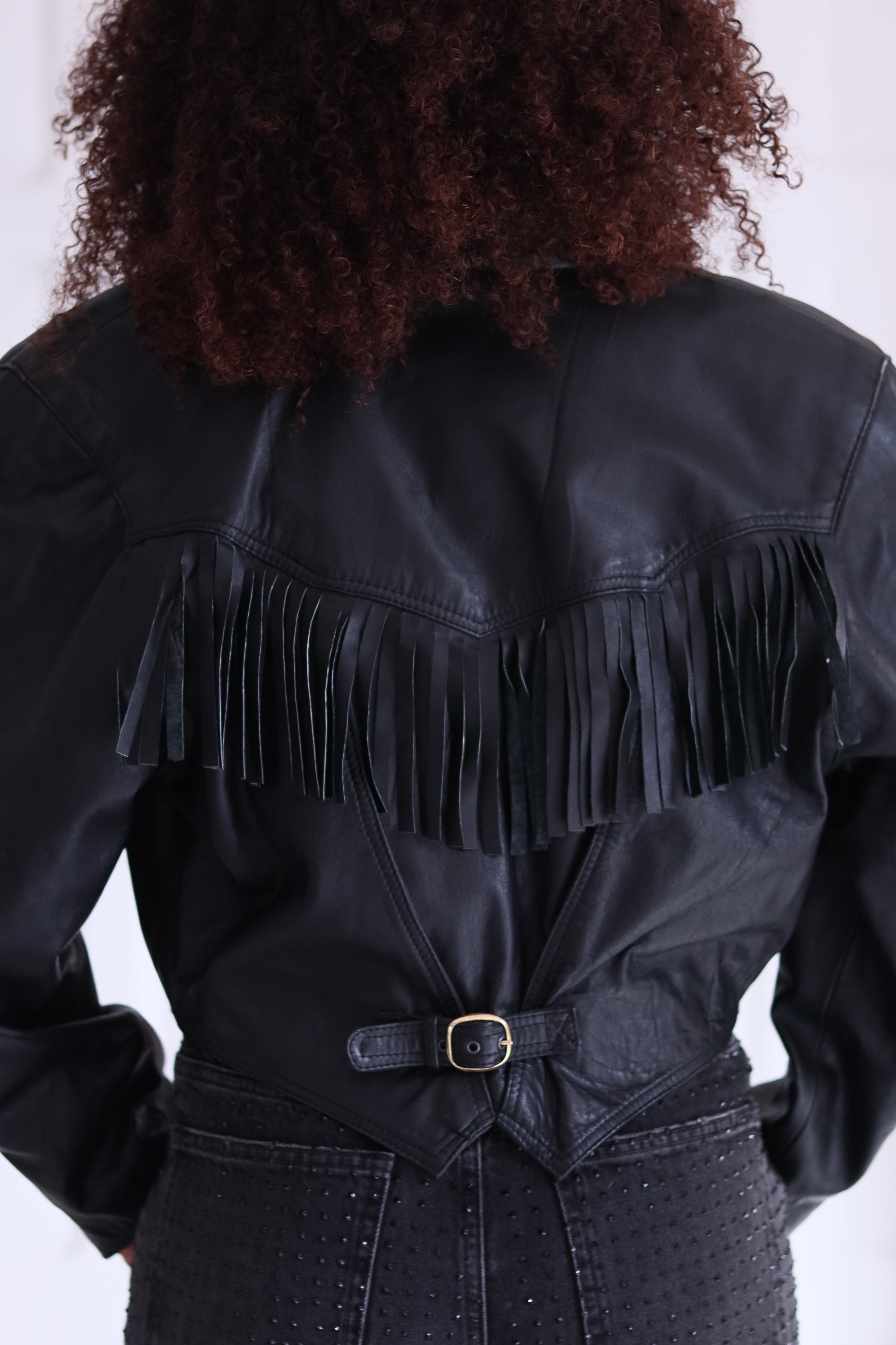 Pièce forte du vestiaire vintage, ce blouson en cuir véritable italien incarne à la perfection le style western glam des années 80. Sa coupe courte et structurée sublime la taille, tandis que les franges accentue son style bohème rock. Le bouton doré à l’avant et la petite ceinture au dos signent des finitions impeccables typiques de la Lavorazione Artigiana italienne.