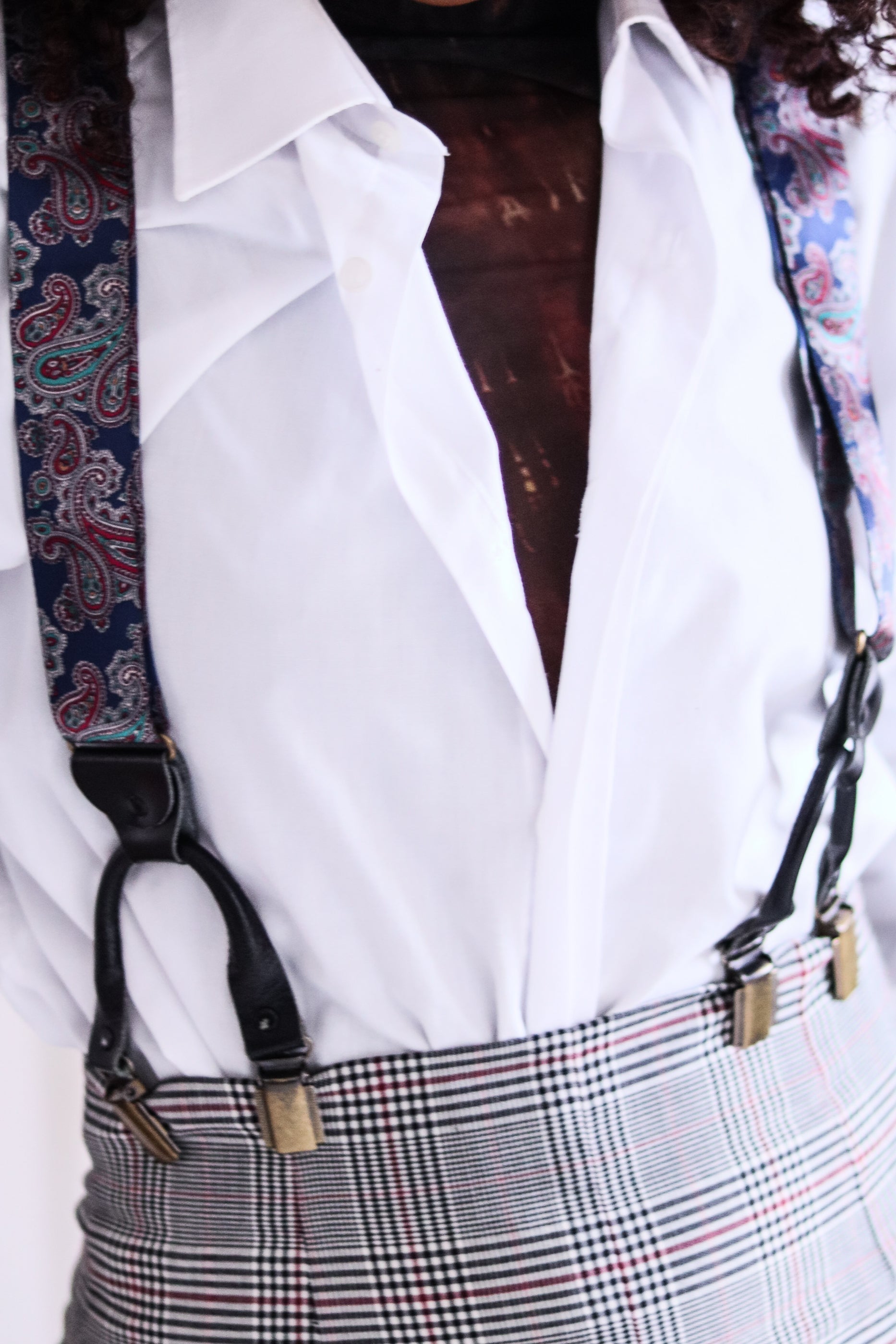 Apporte un twist dandy à ton look avec ces bretelles vintage des années 80, motif cachemire bleu profond. Bretelles à 6 pinces, attaches métalliques patinées et les finitions cuir noir
