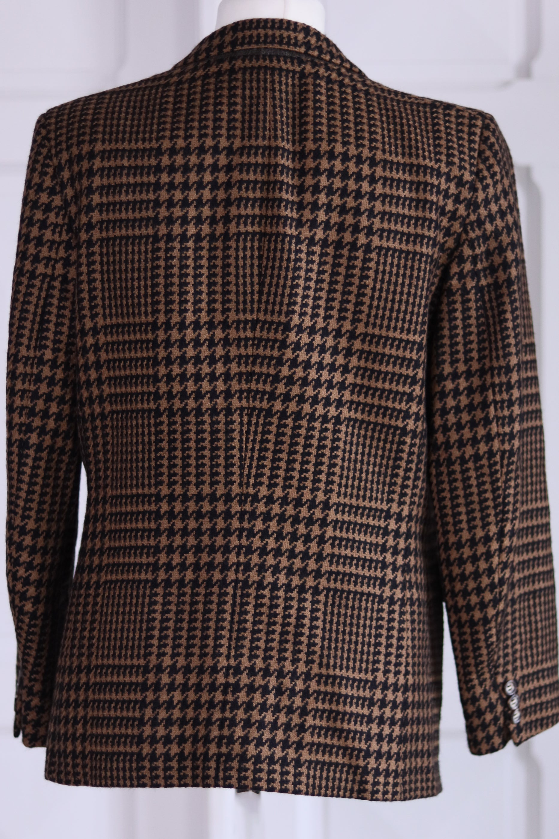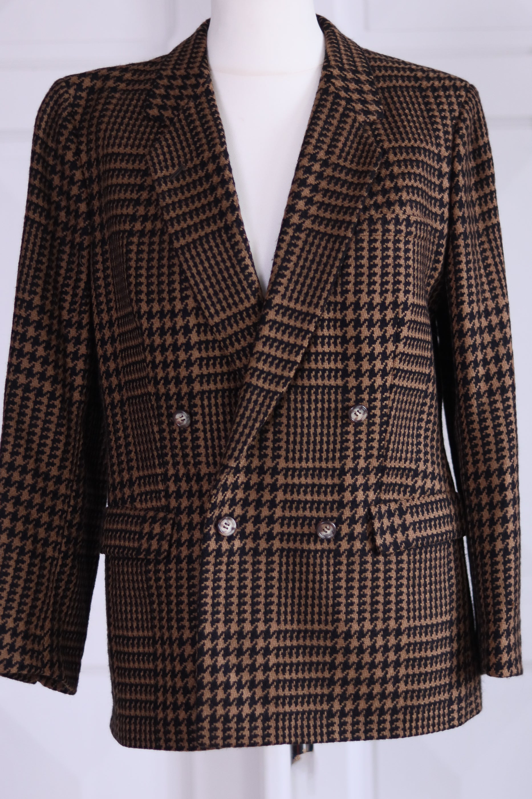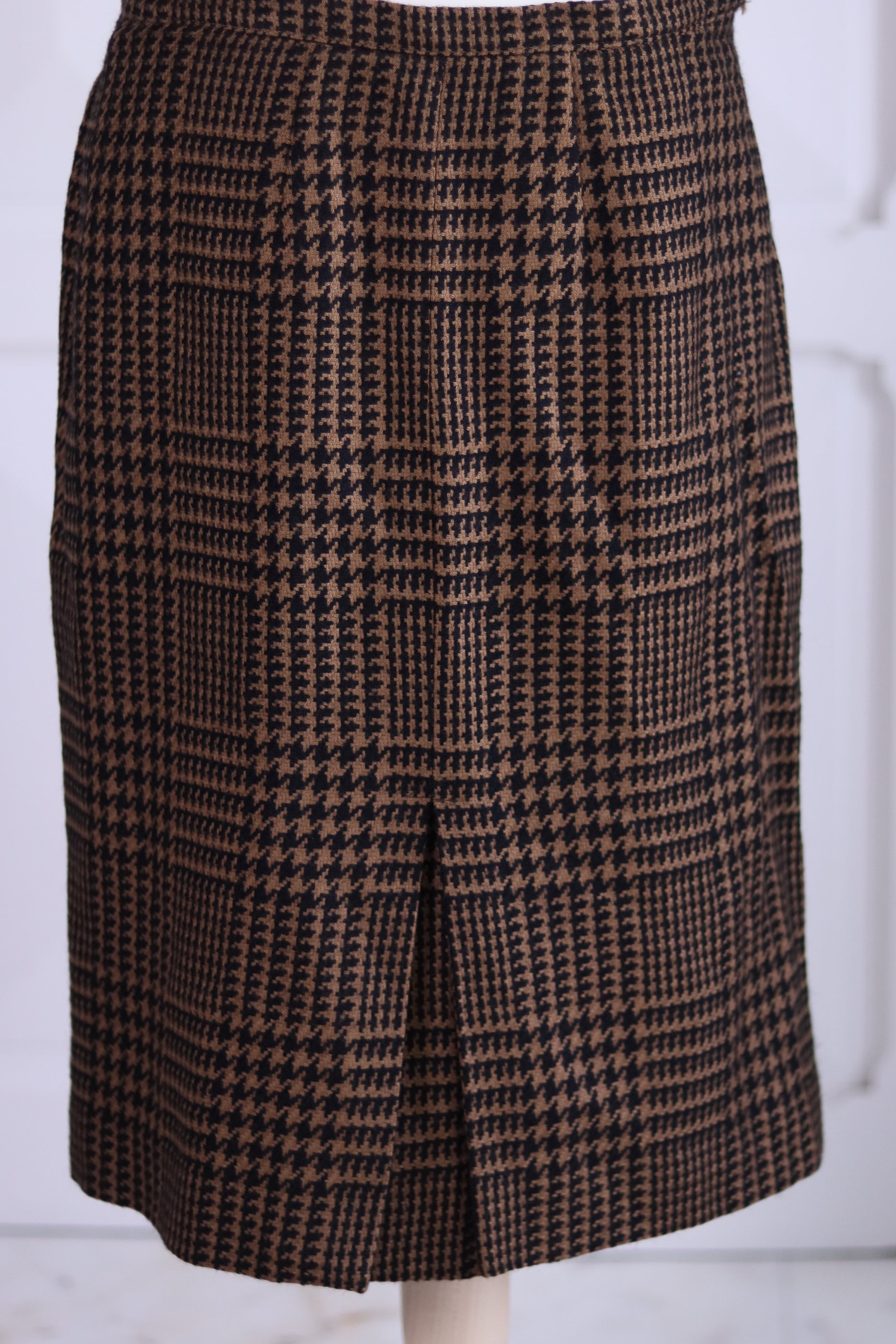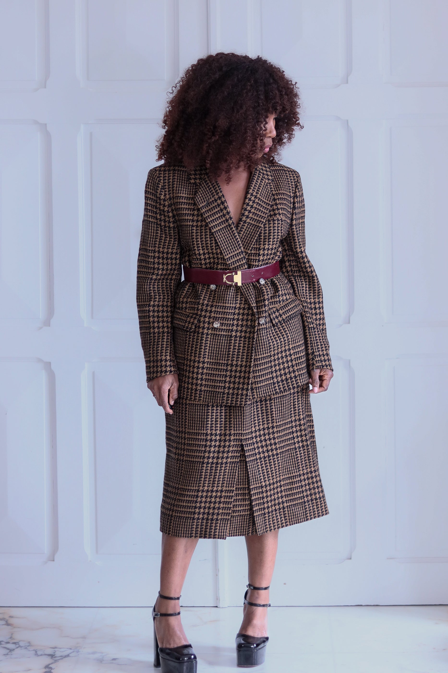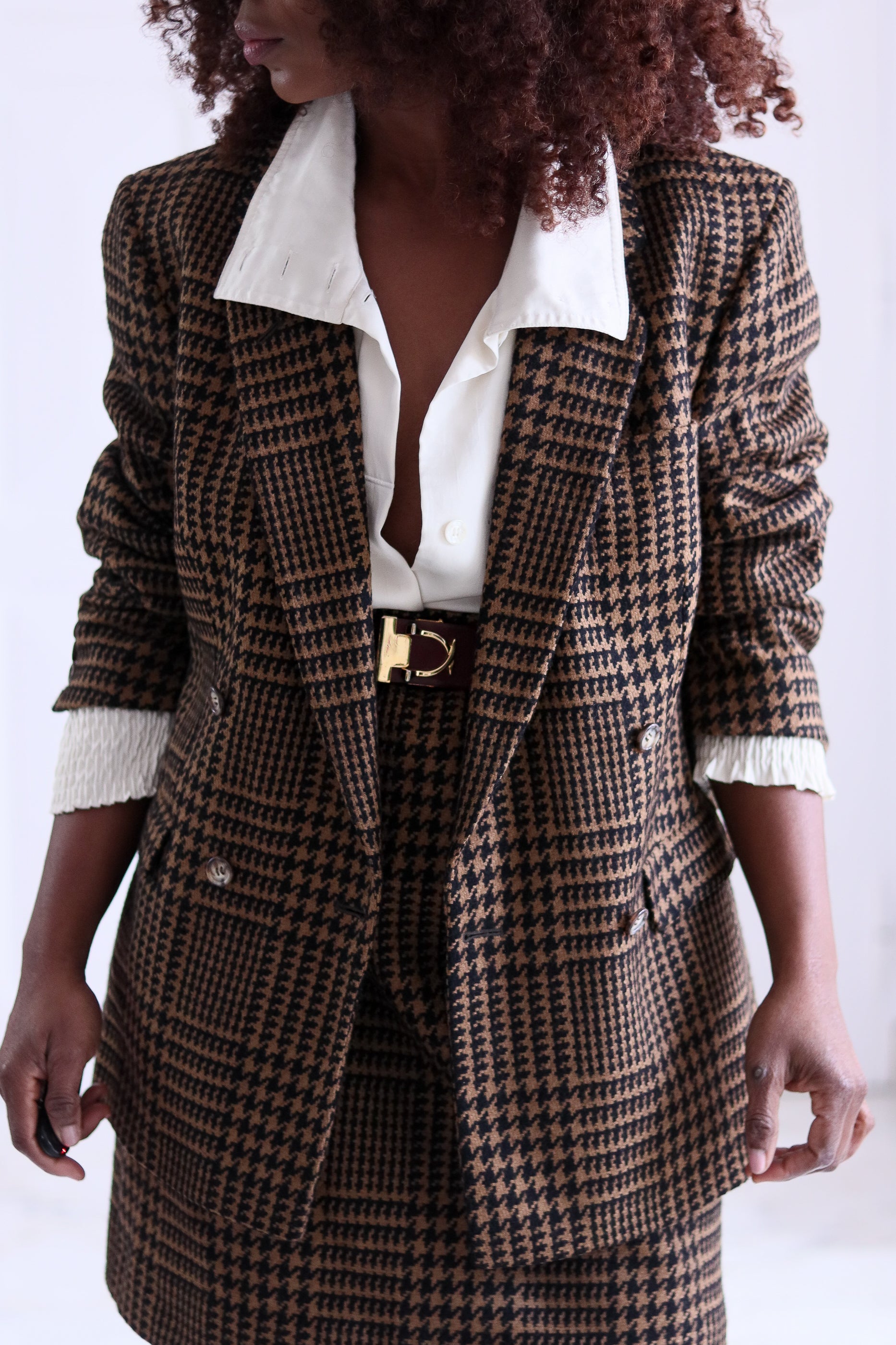 Réalisé en 100 % laine vierge, cet ensemble deux pièces composé de son blazer croisé et de sa jupe à pli creux affichent un motif pied-de-poule XXL brun et noir, typique du style londonien.