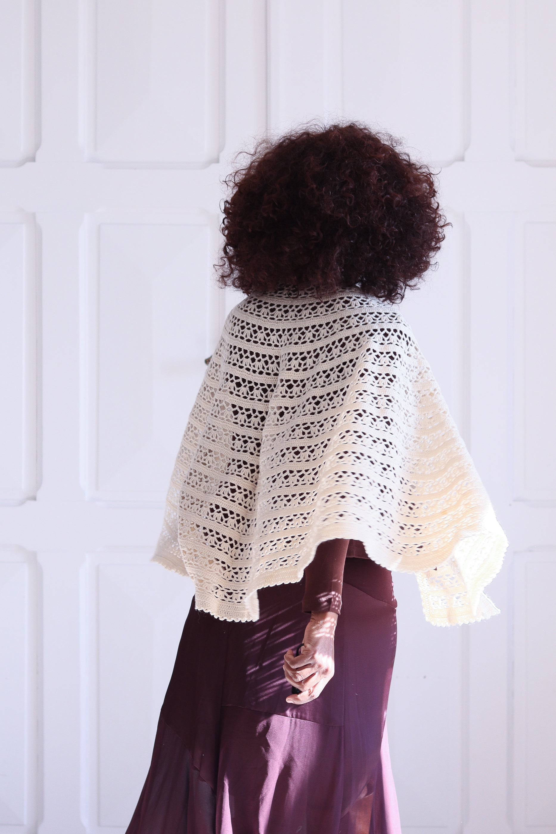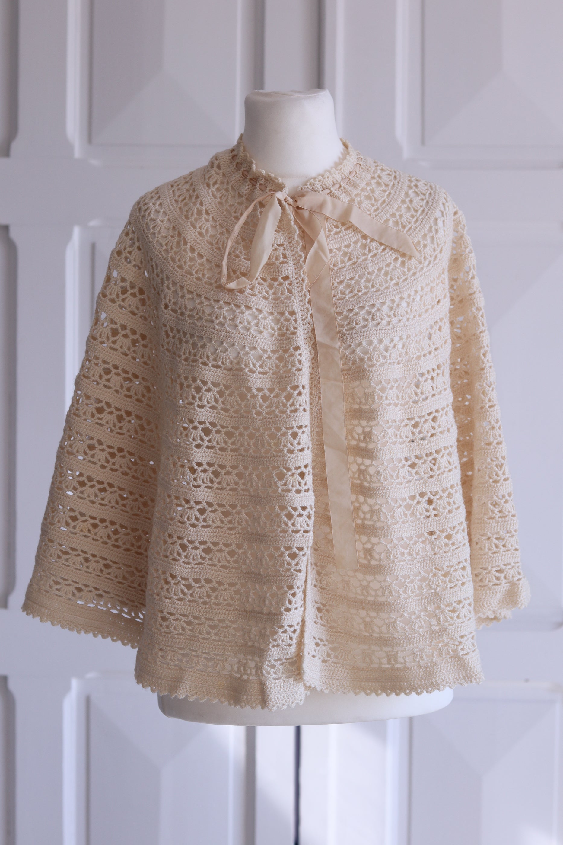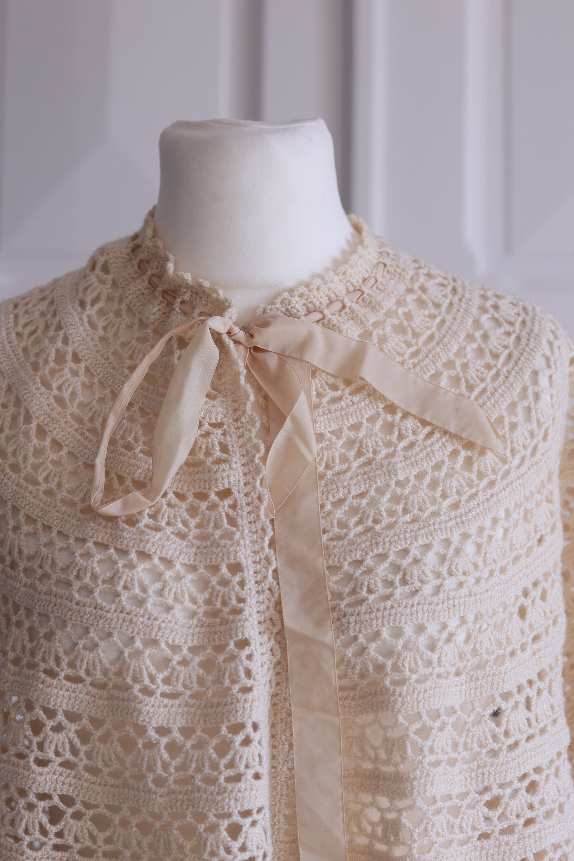 Charmante capeline en crochet ajouré, réalisée à la main dans les années 60. Sa maille crème délicatement travaillée alterne motifs ajourés. Fermeture au col par un ruban en satin ton sur ton, qui ajoute une touche féminine et douce.