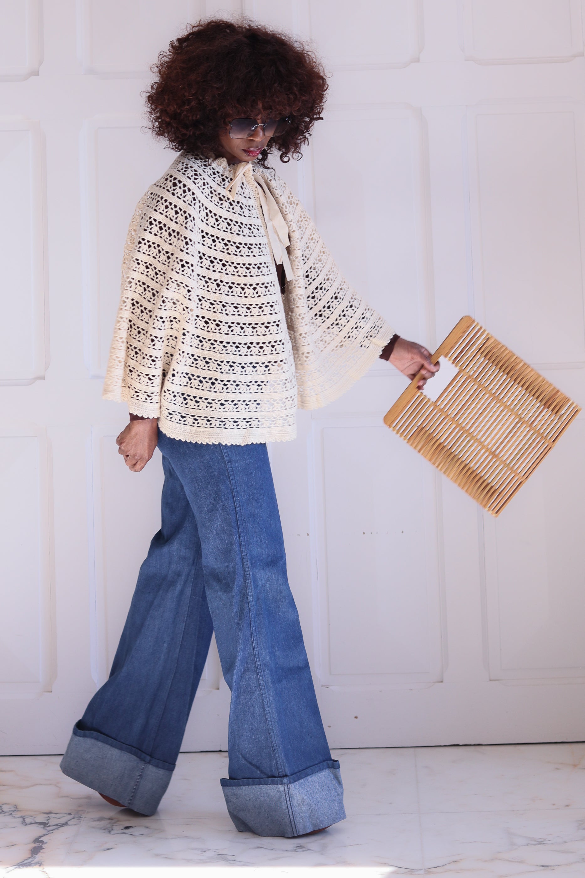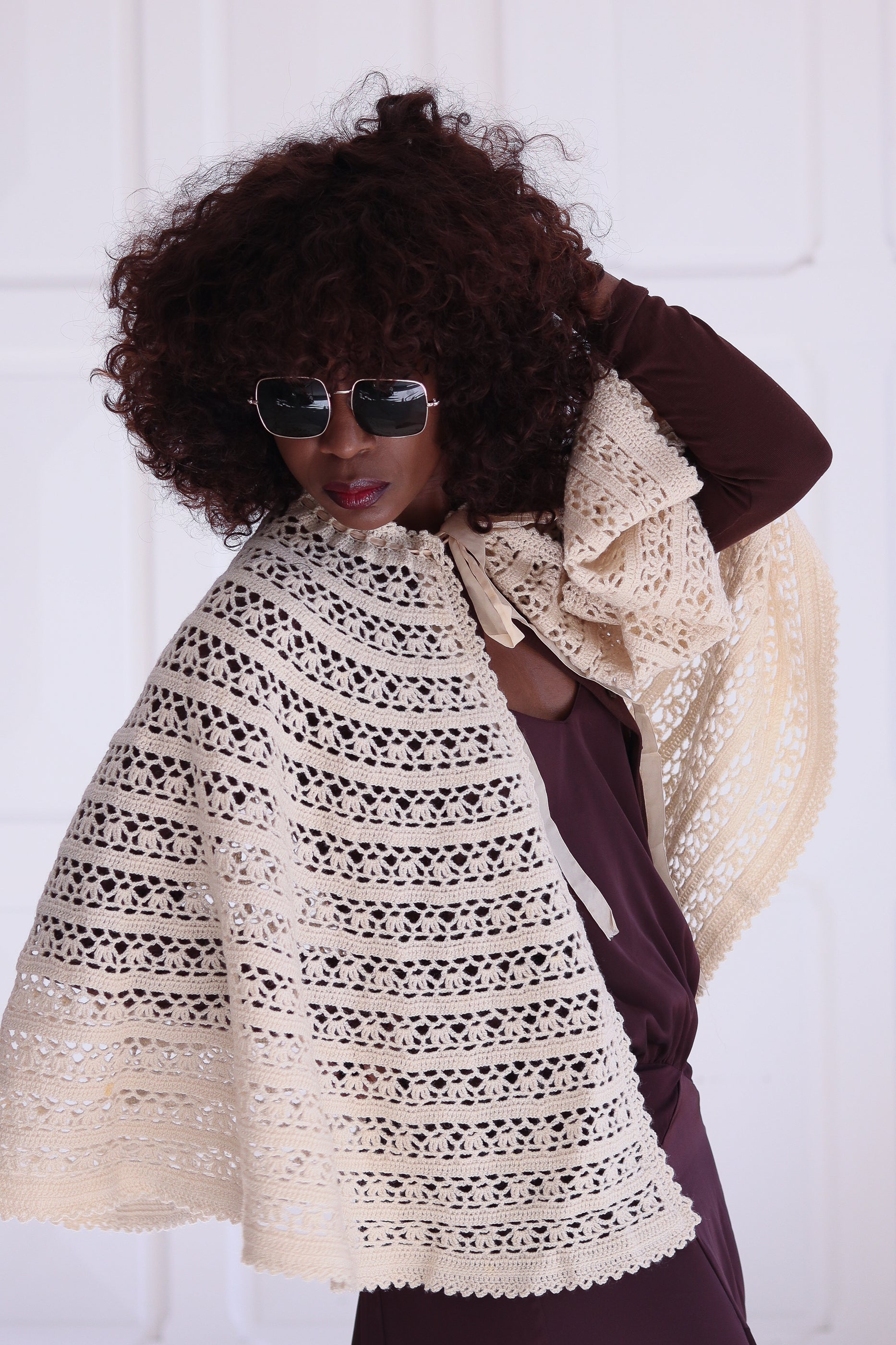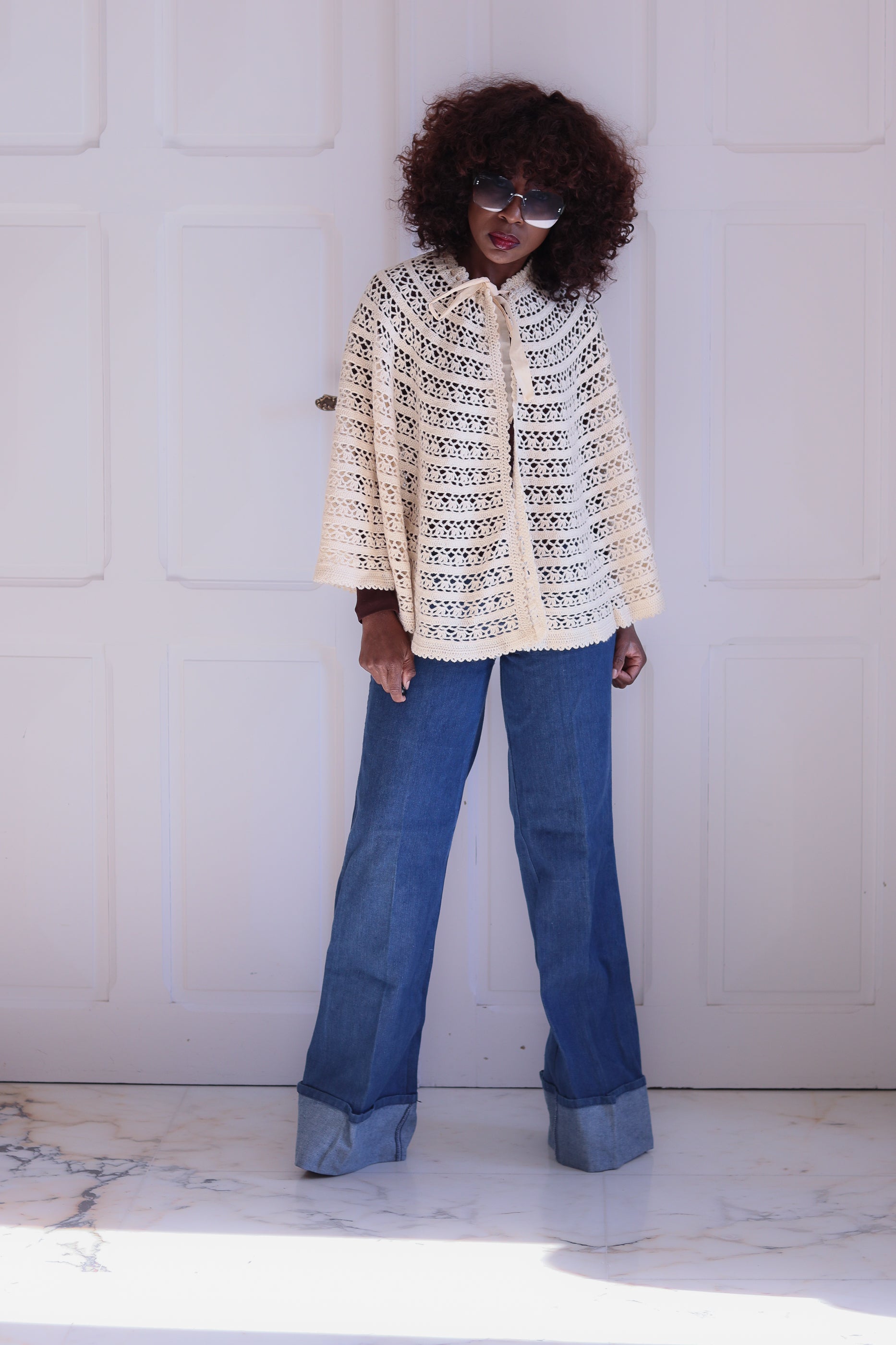 Charmante capeline en crochet ajouré, réalisée à la main dans les années 60. Sa maille crème délicatement travaillée alterne motifs ajourés. Fermeture au col par un ruban en satin ton sur ton, qui ajoute une touche féminine et douce.