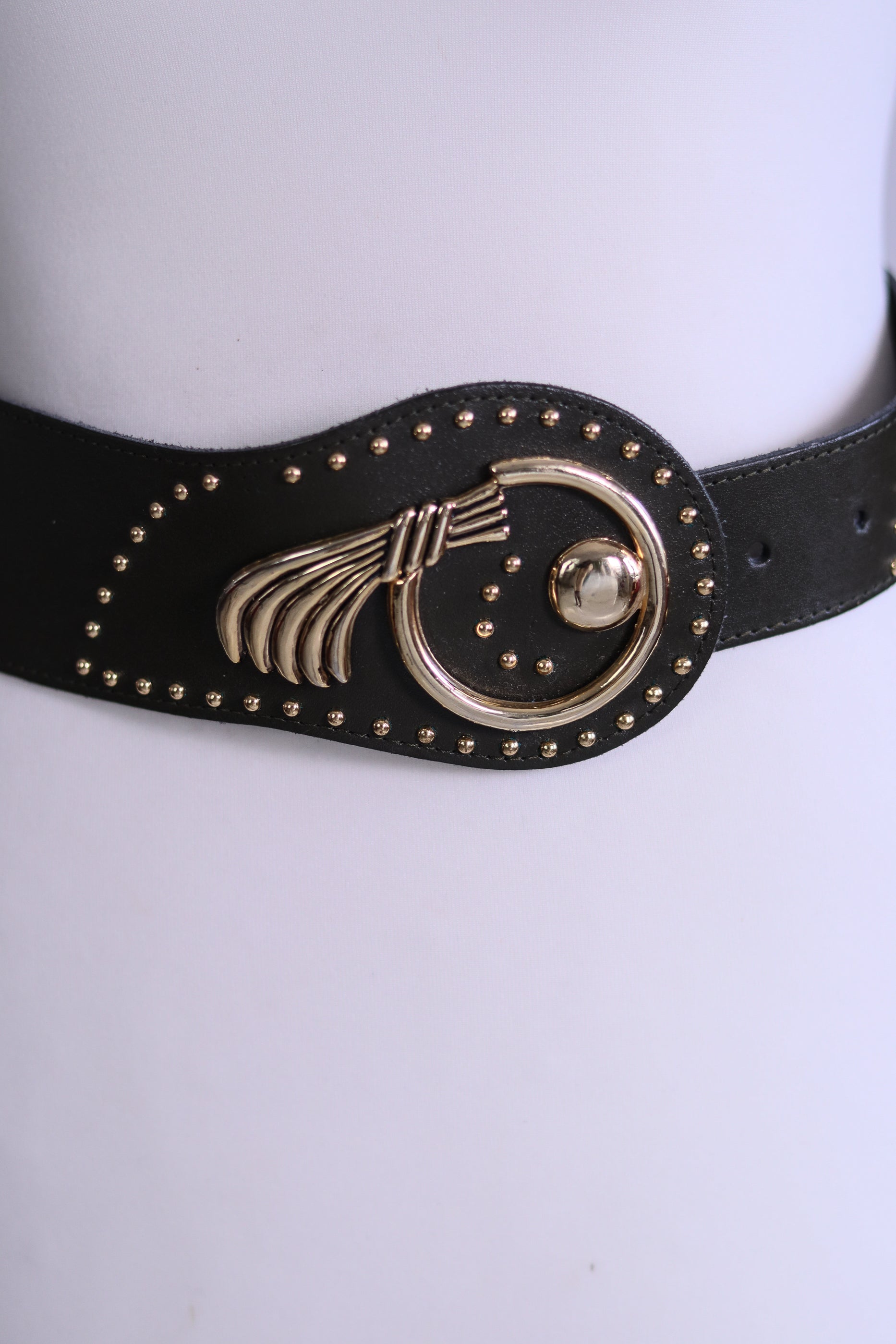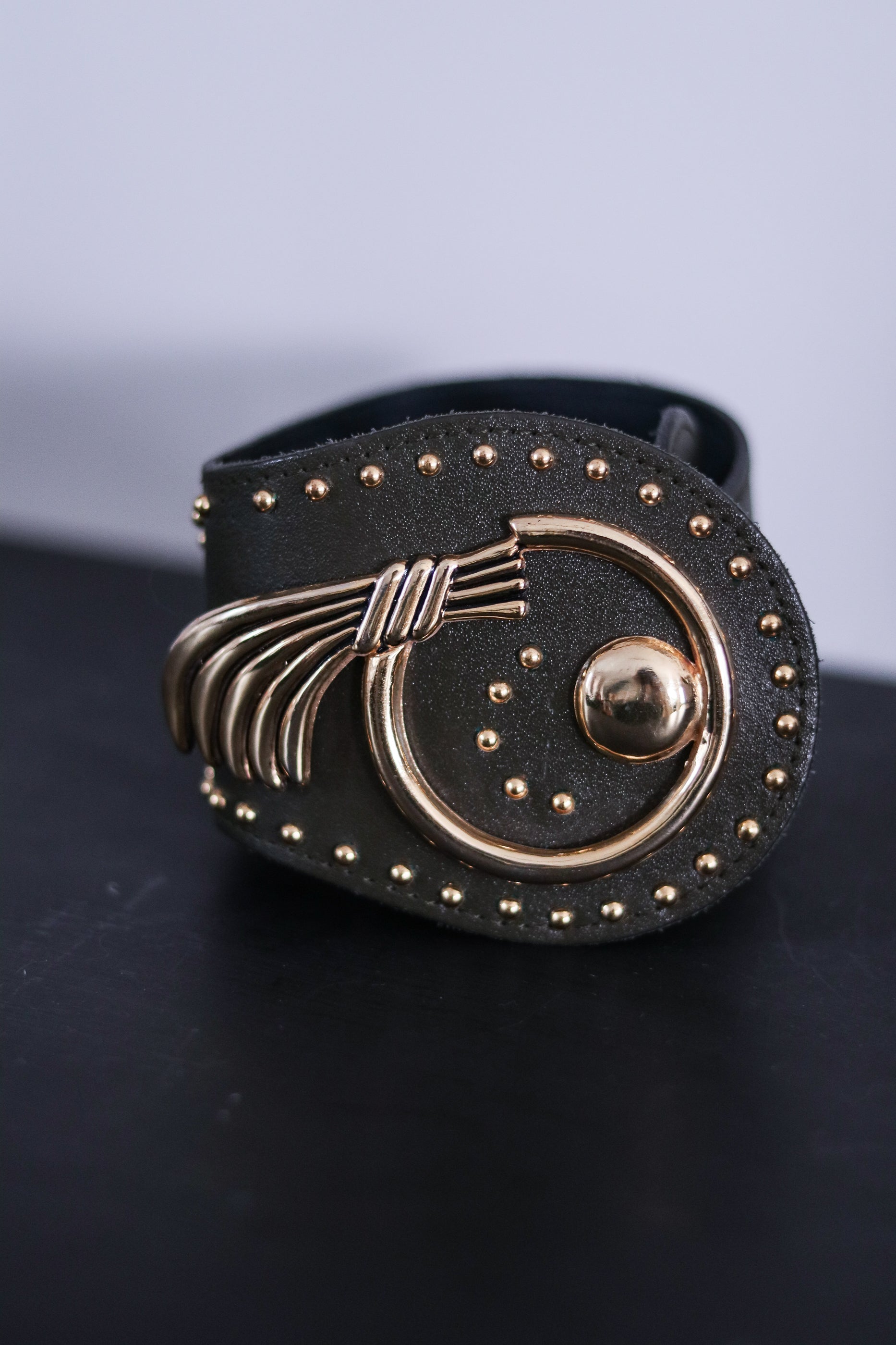 Ceinture large vintage en belle imitation de croute cuir vert foncé, typique des accessoires des années 80/90. Elle présente une boucle sculpturale dorée, composée d’un grand anneau orné d’un motif graphique en relief, et d’une finition cloutée qui apporte du caractère.