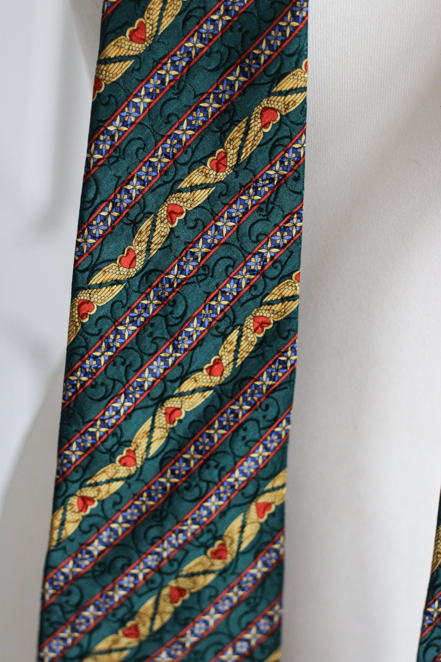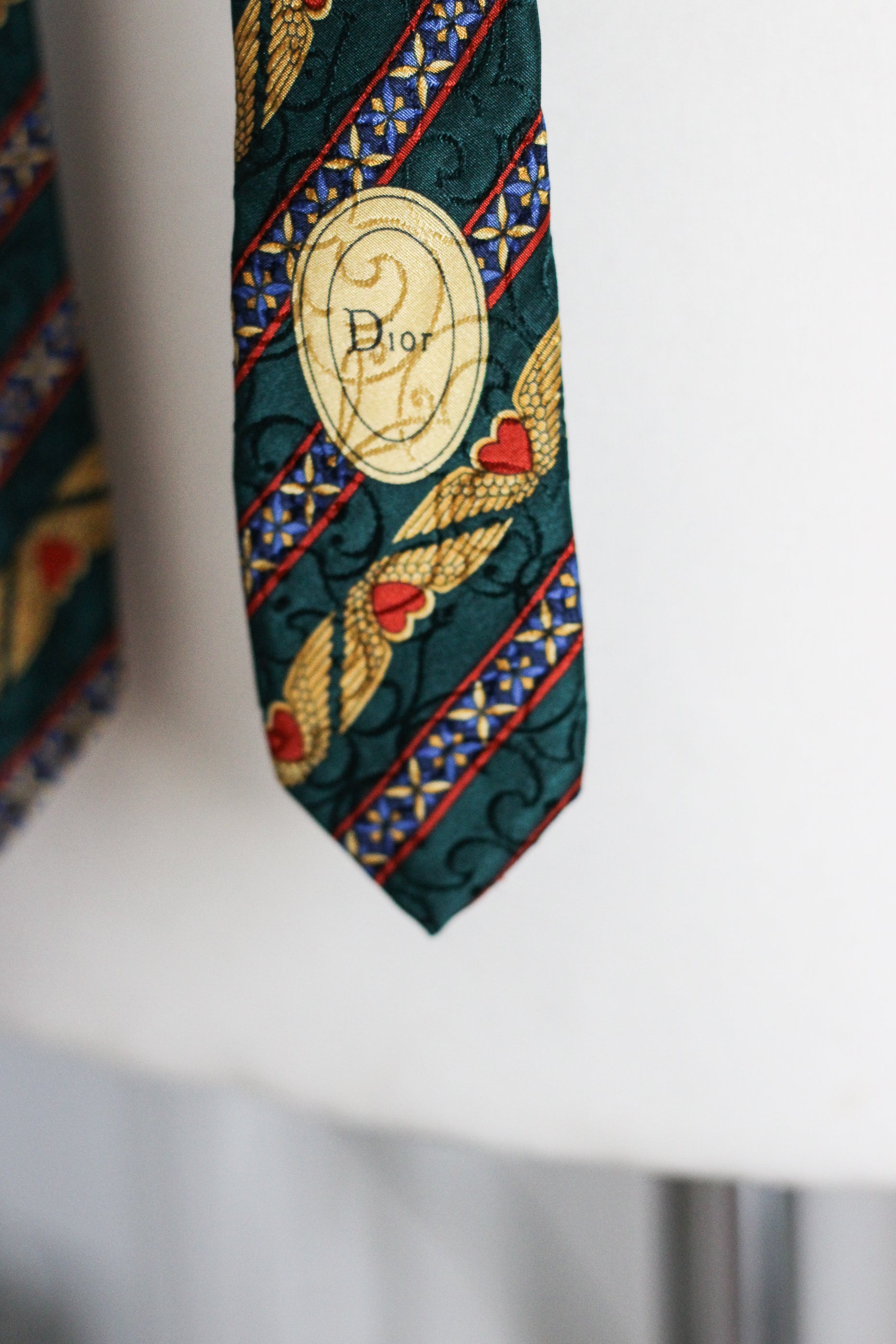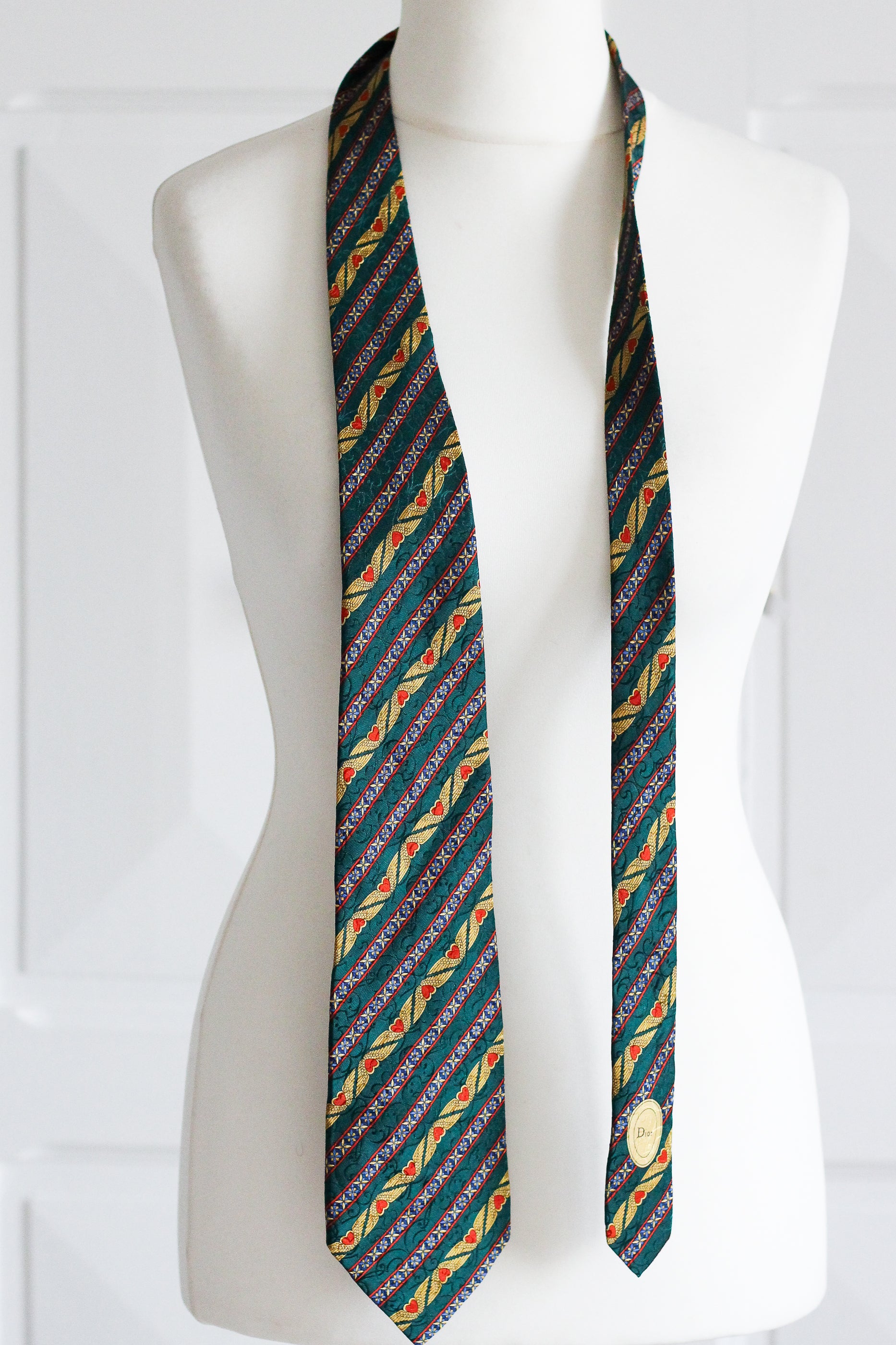 Cravate Christian Dior vintage, au motif graphique raffiné dans des tons élégants de vert, bleu et touches dorées. Une pièce emblématique du vestiaire masculin, signature de la maison Dior. Belle pièce vintage des années 1980