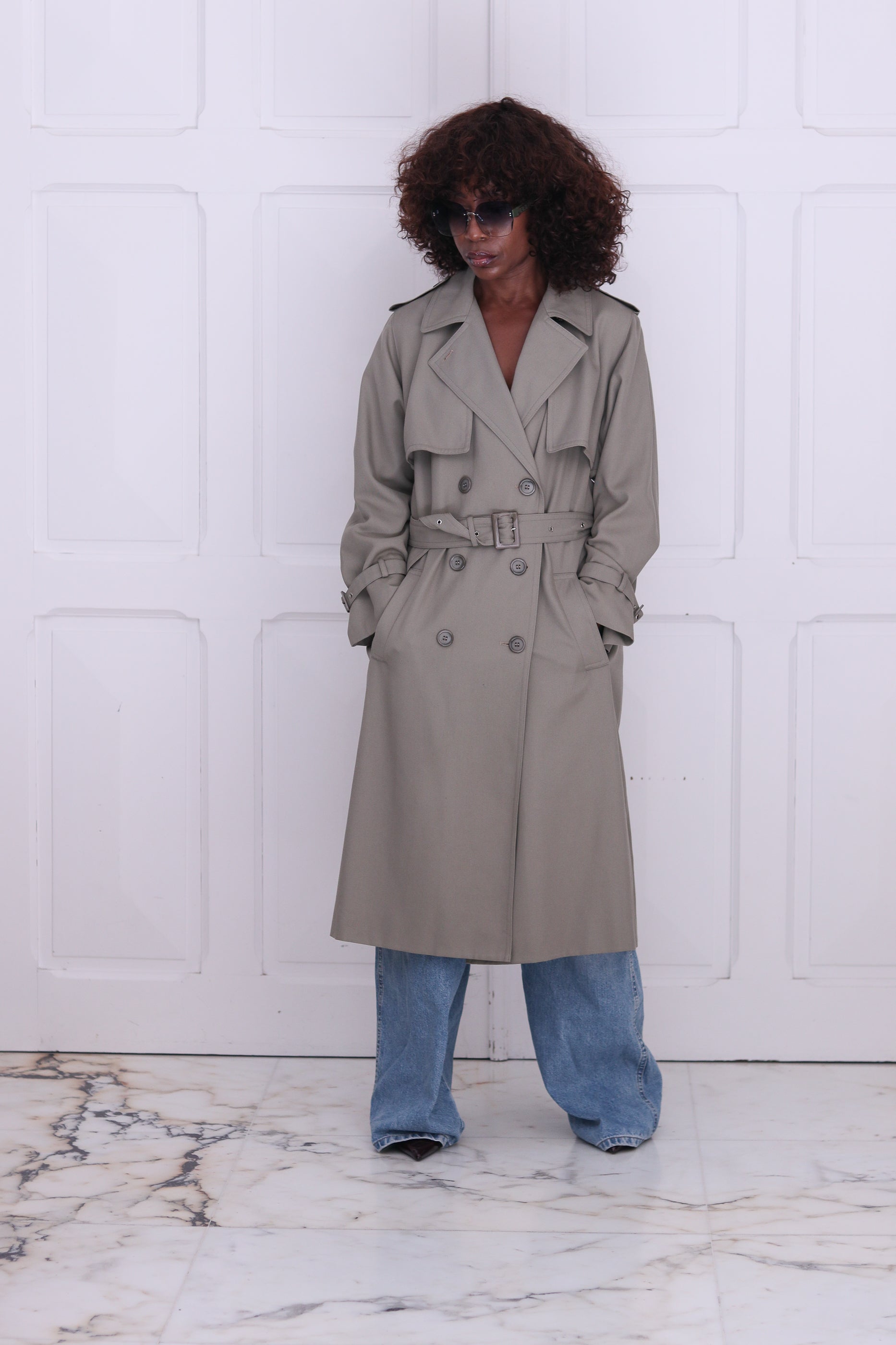 Trench long vintage Claude Havrey Paris, des années 1980. Une pièce iconique dans une teinte taupe-gris clair, à la coupe structurée et élégante. Double boutonnage croisé, ceinture assortie avec boucle, larges revers, pattes d’épaules et attaches réglables aux poignets