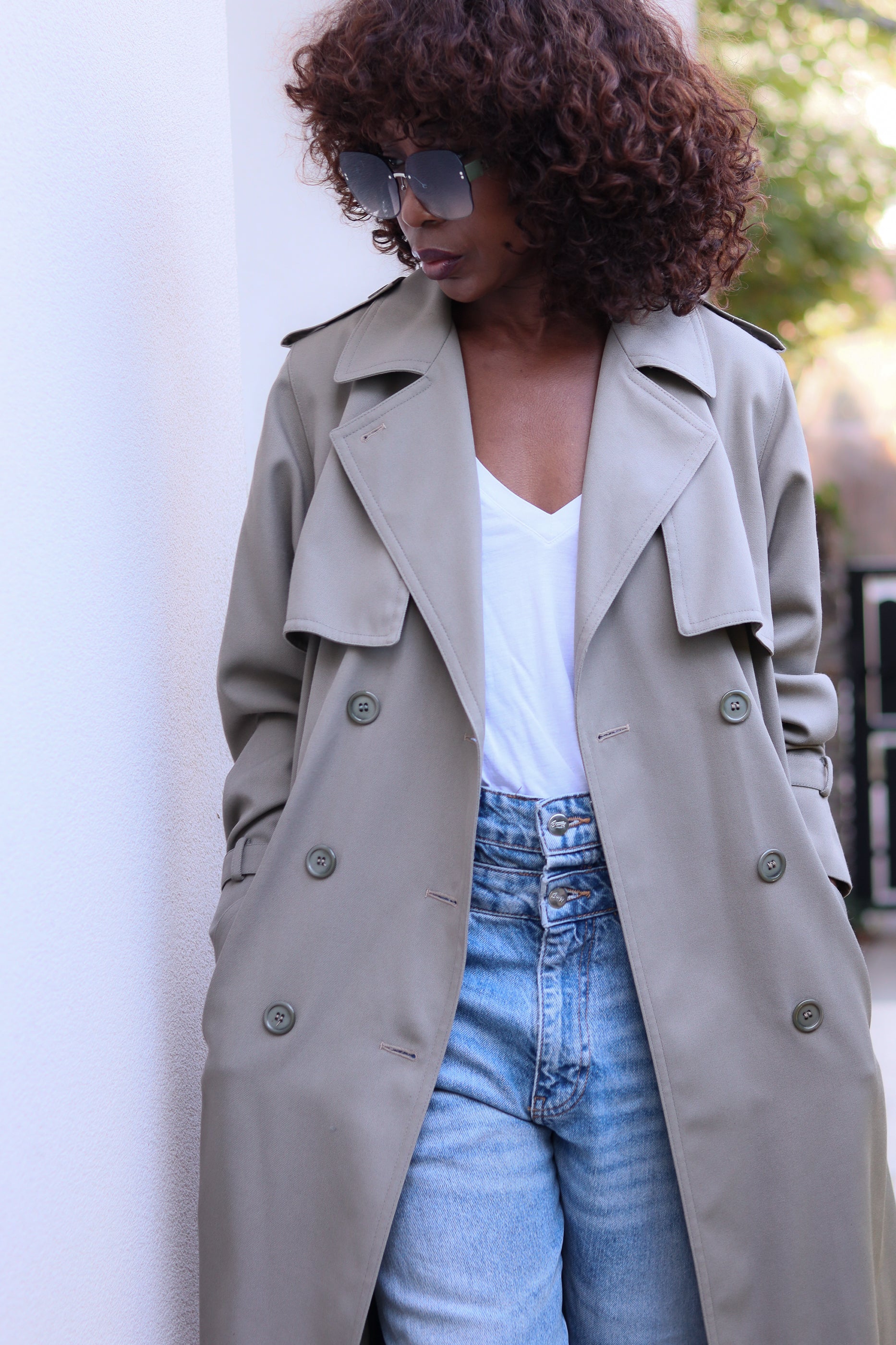 Mensurations prises à plat largeur épaule : 42 cm (16") largeur dessous poitrine : 49 cm (19") Longueur manche : 60 cm (23") longueur trench : 107 cm (42")