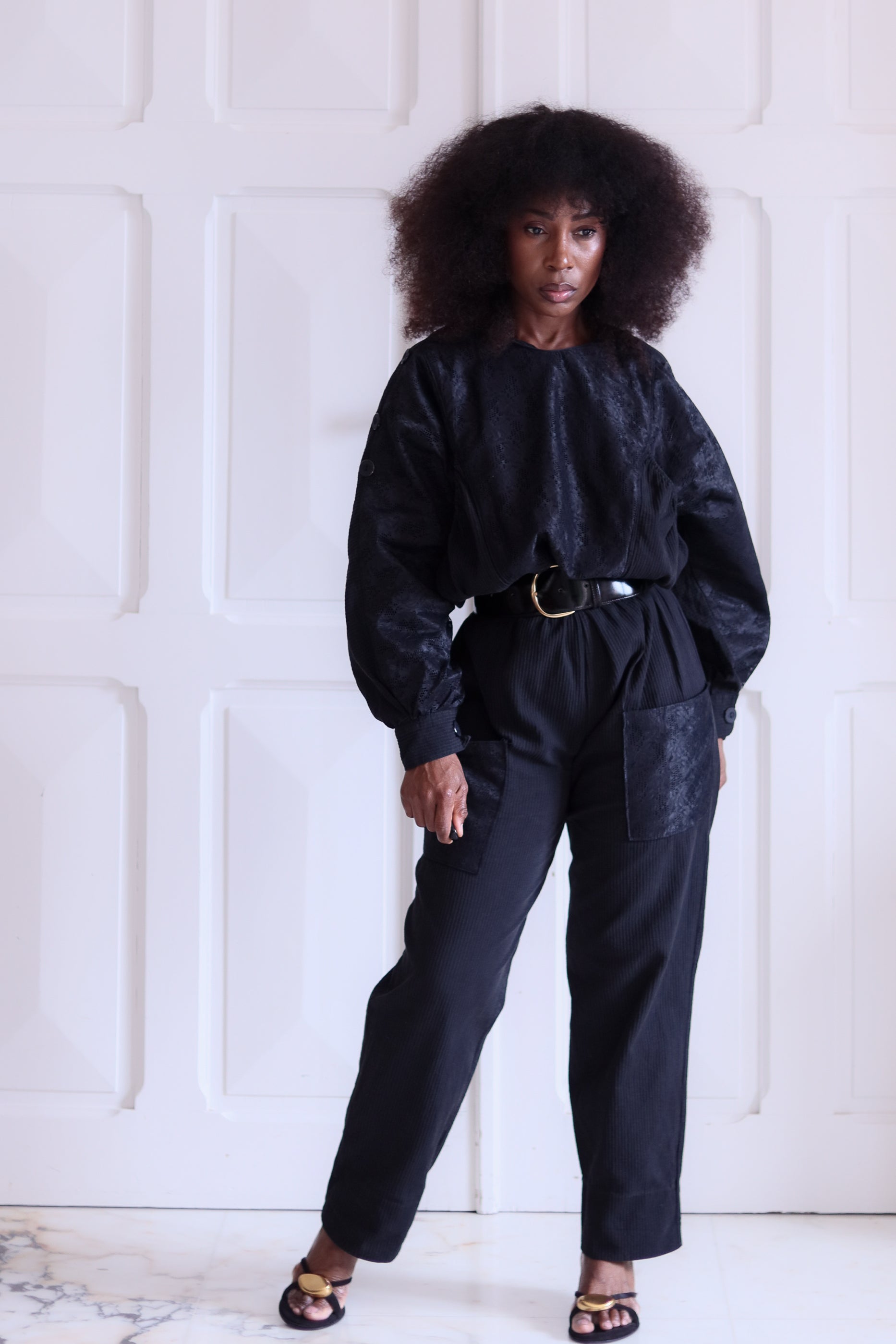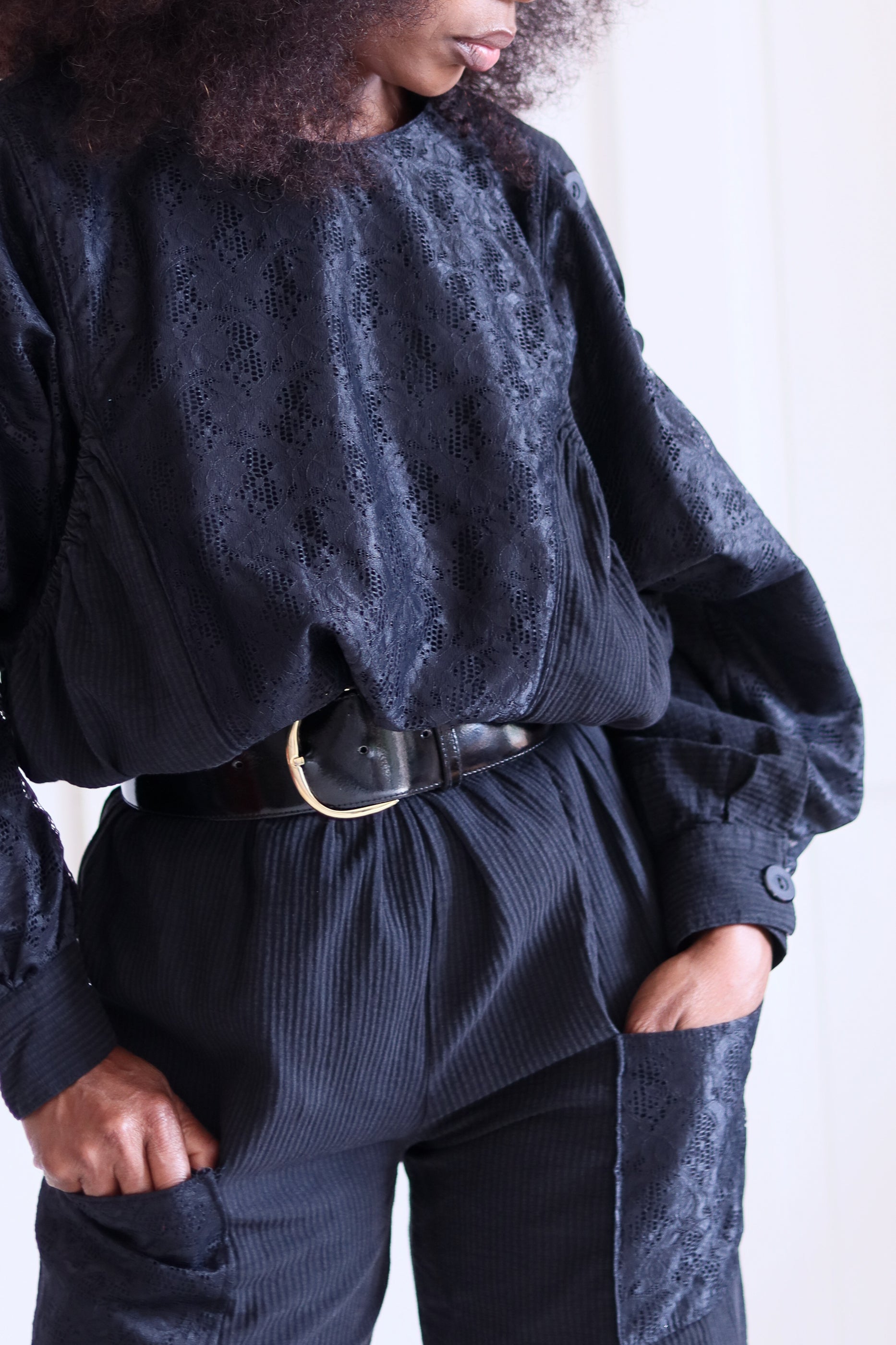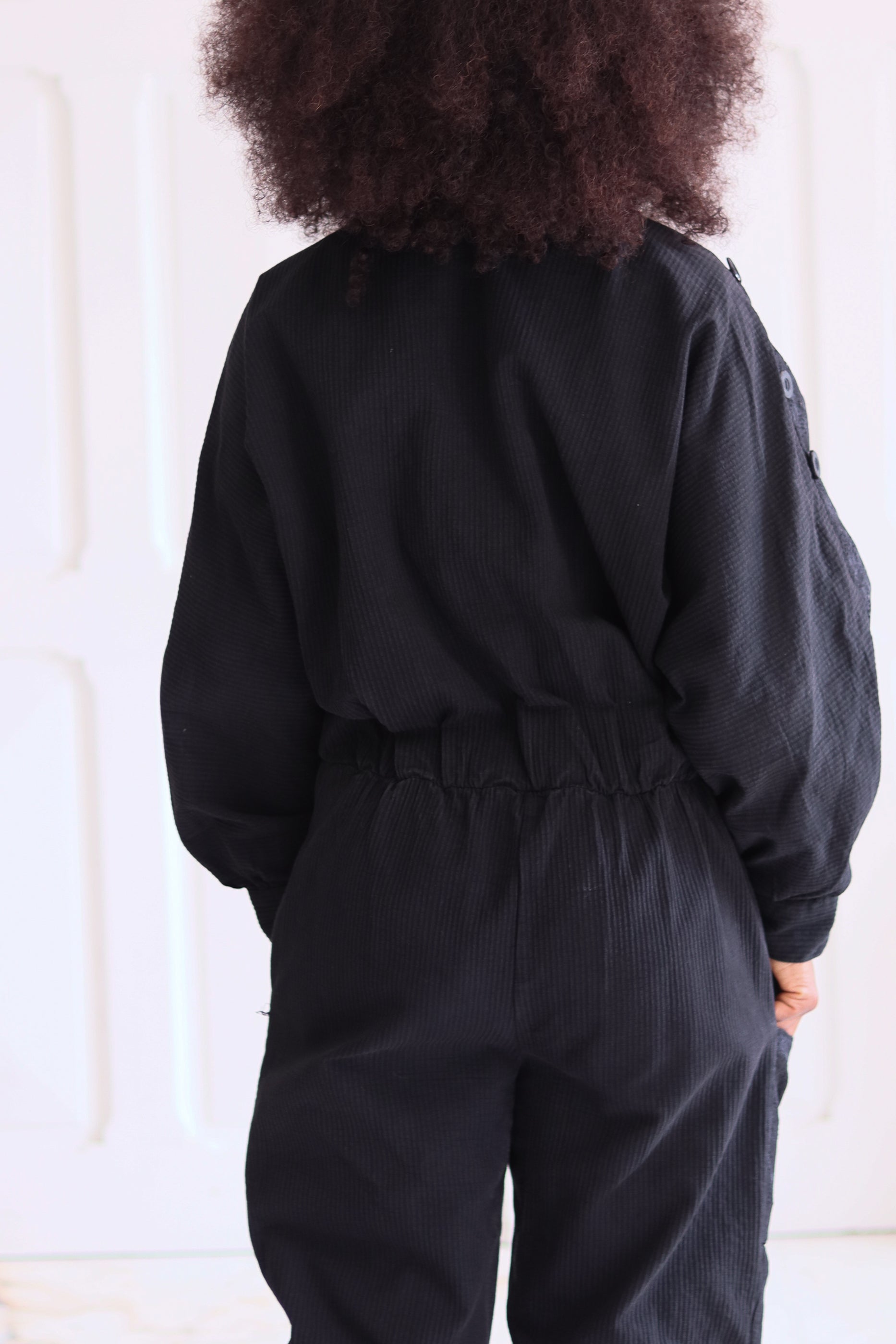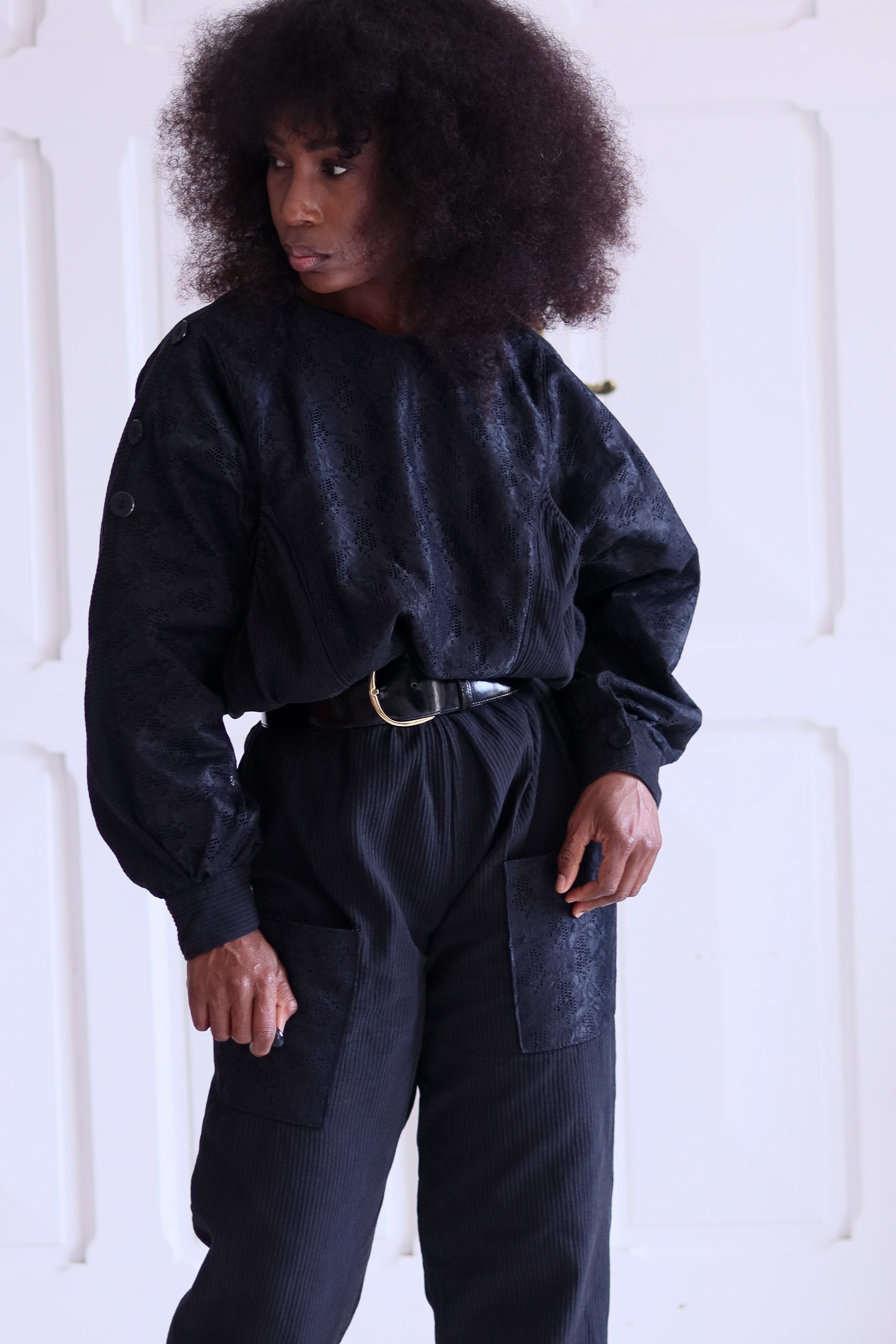 Combinaison vintage des années 1980 joue sur les contrastes entre matières et volumes pour un style unique. Combinaison en coton et empiècement en dentelle, large poche sur le devant et boutonnage sur l'épaule