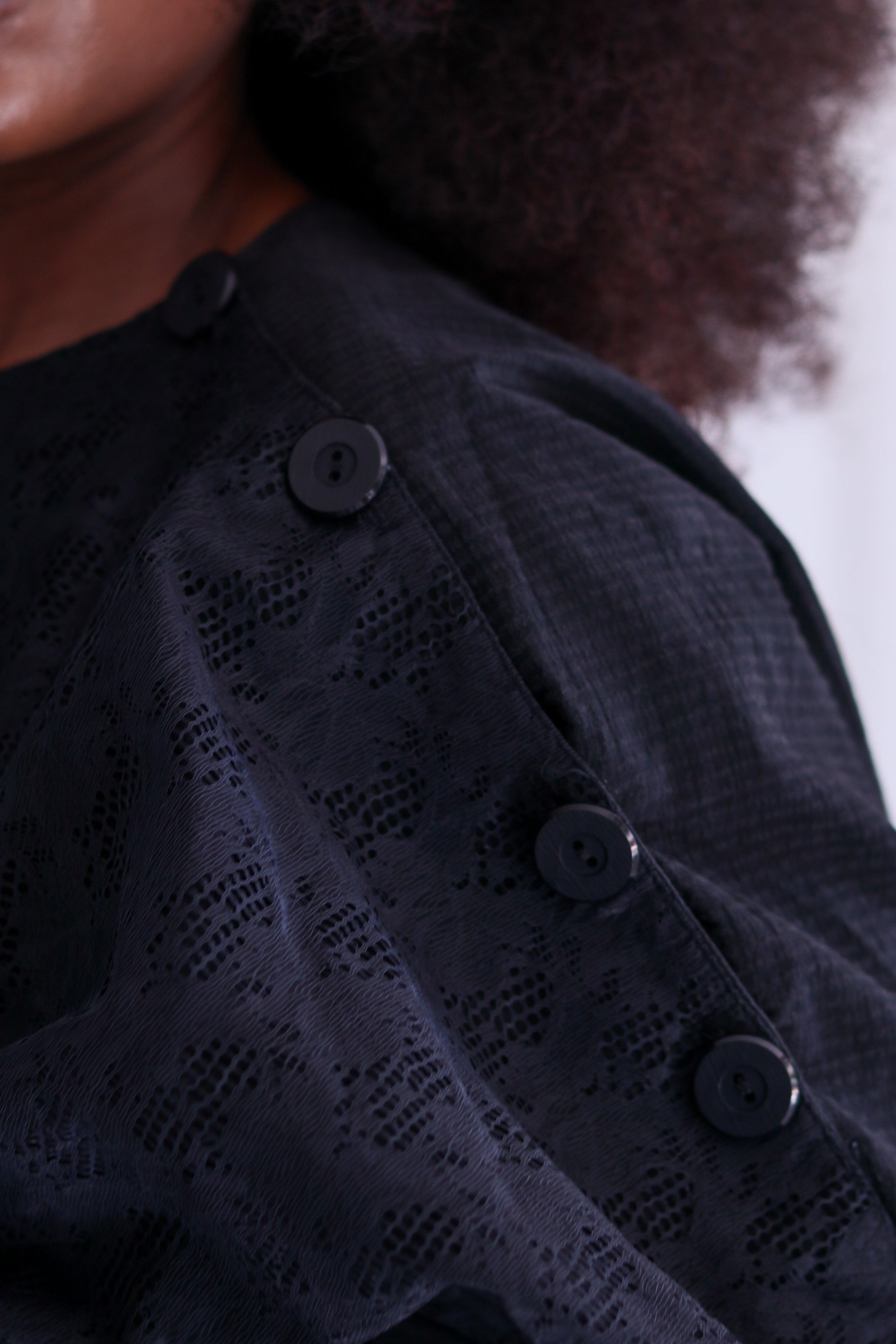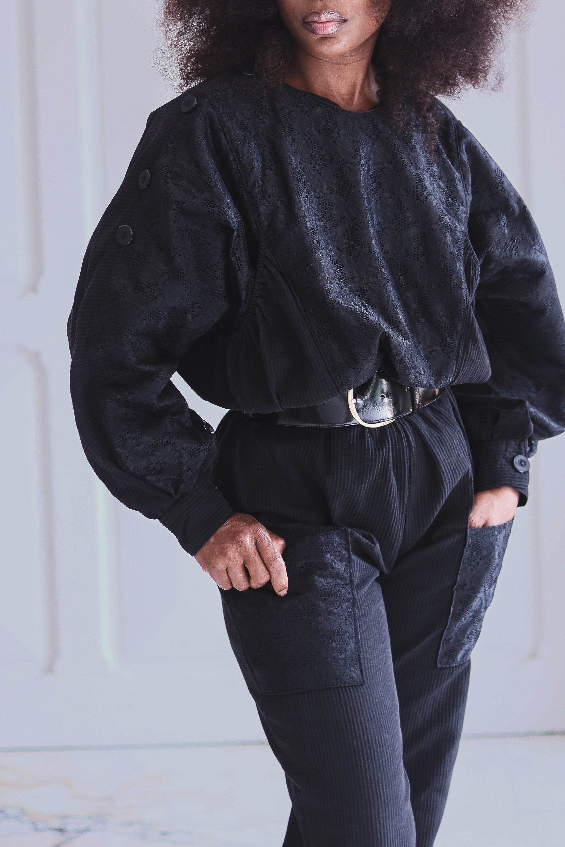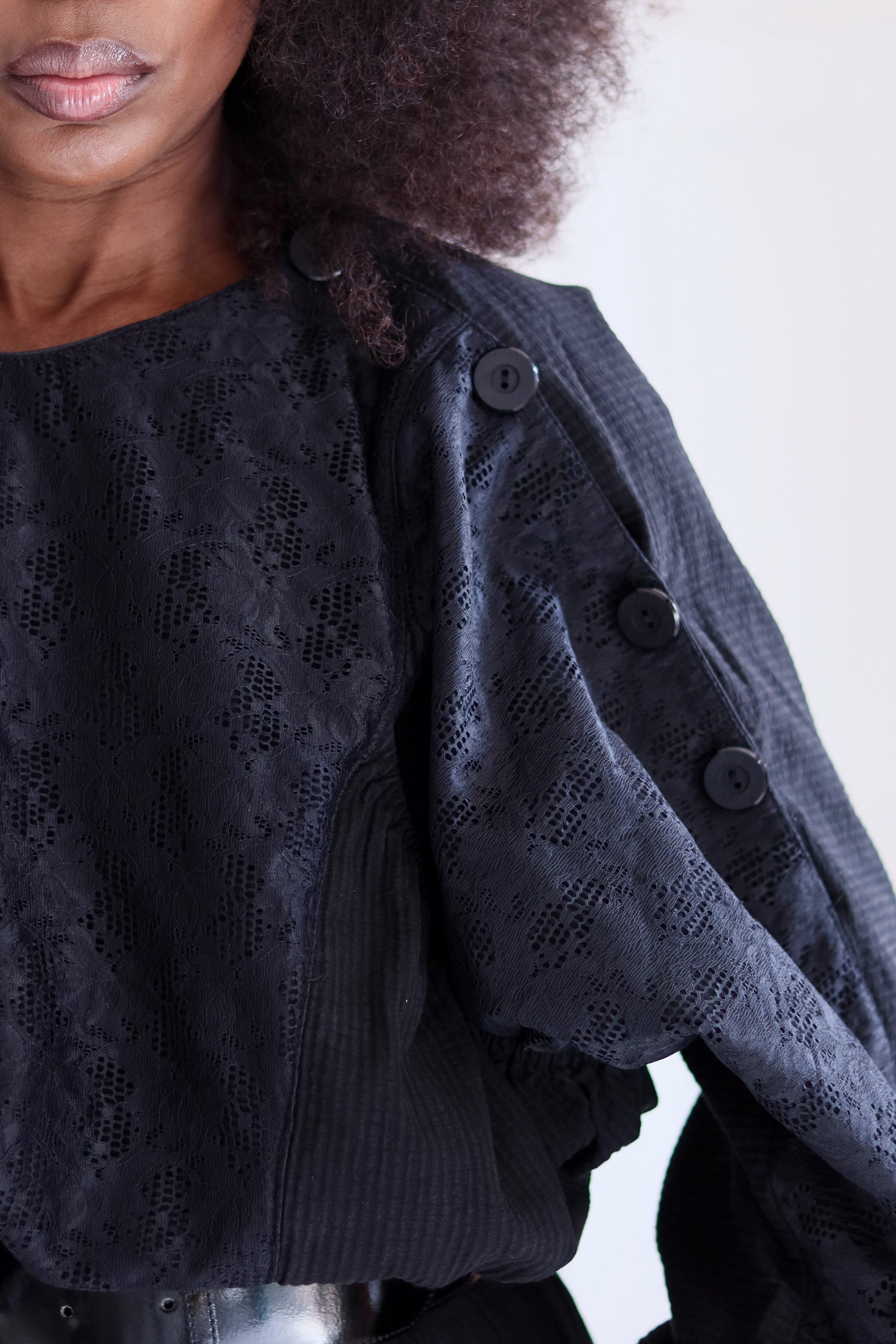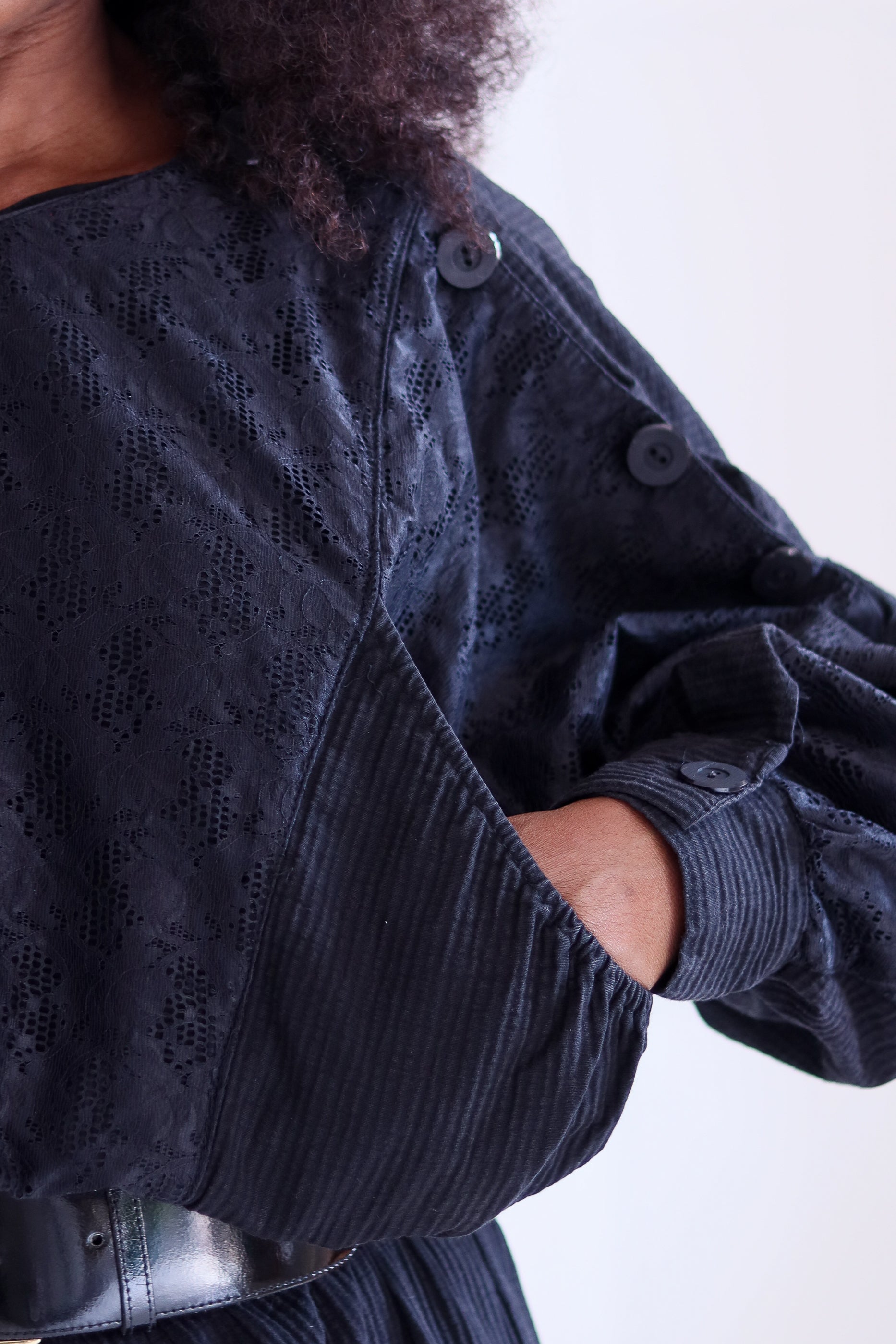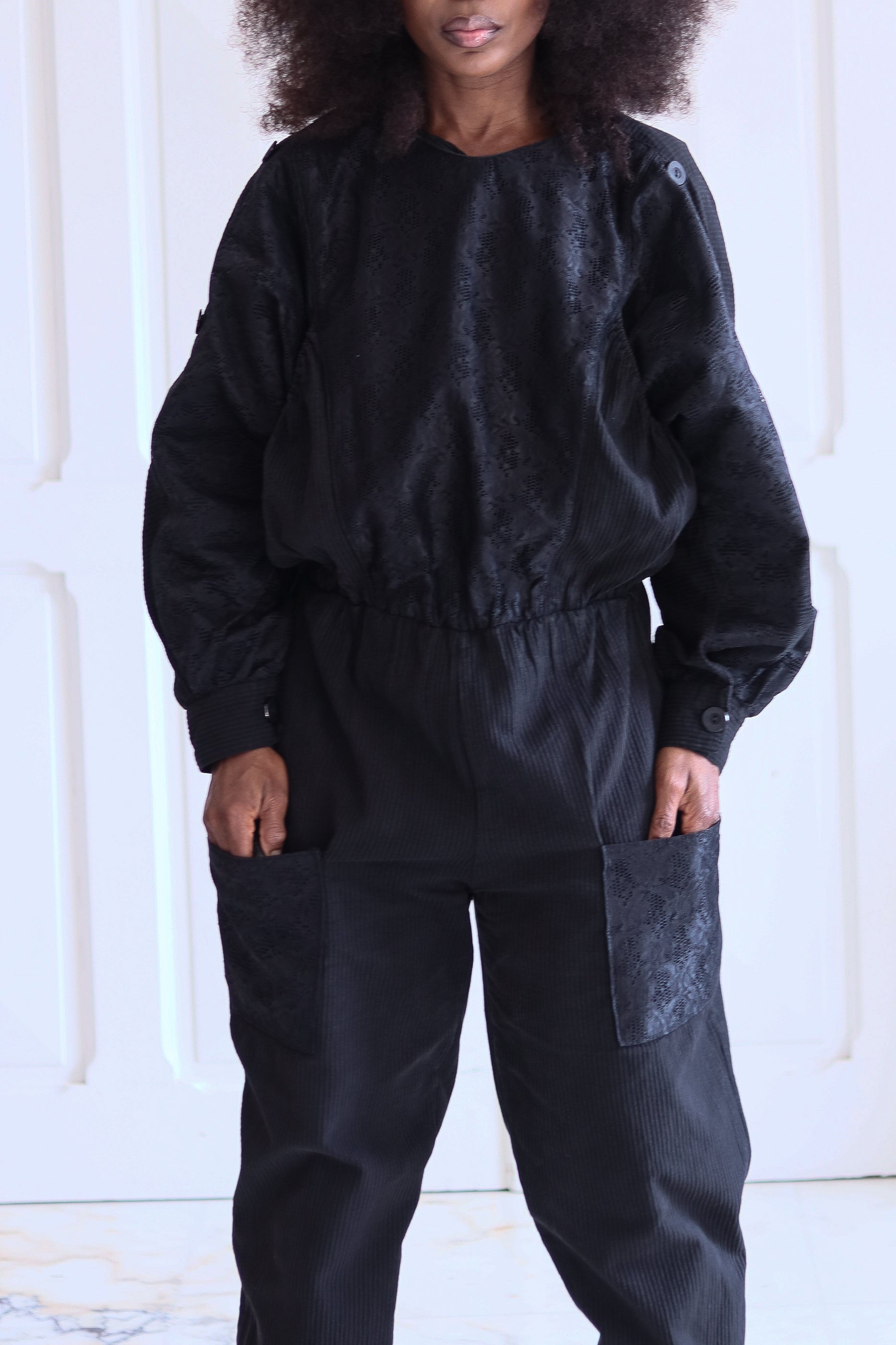 Combinaison vintage des années 1980 joue sur les contrastes entre matières et volumes pour un style unique. Combinaison en coton et empiècement en dentelle, large poche sur le devant et boutonnage sur l'épaule