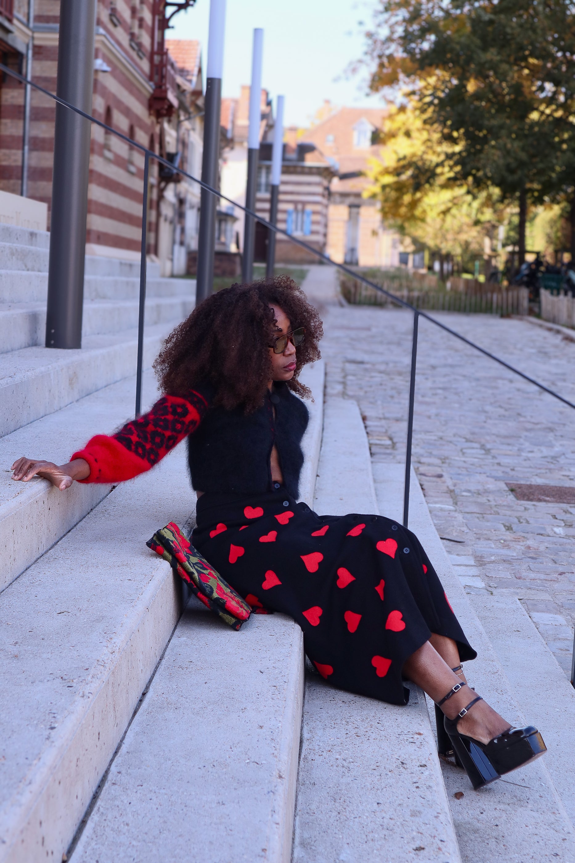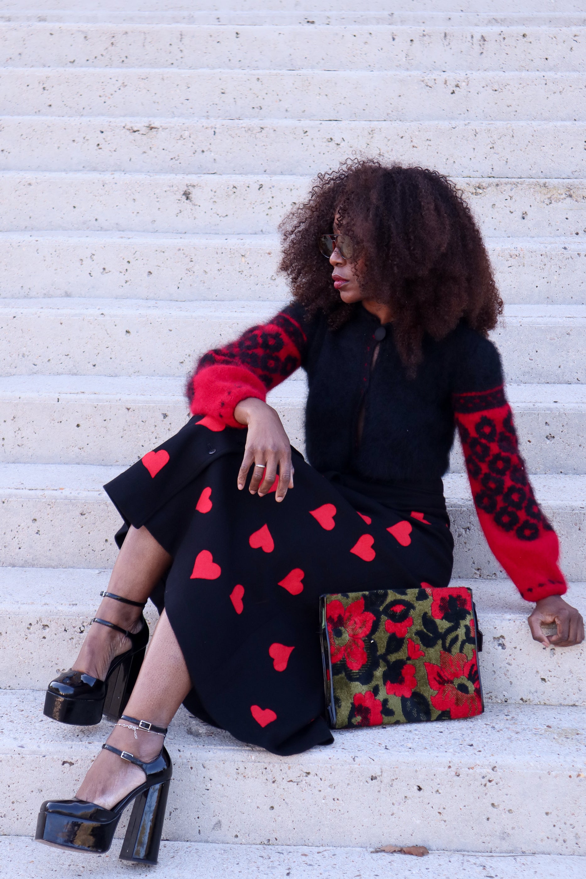 Jupe vintage en laine des années fin 1970. Une pièce pleine de fantaisie et de romantisme avec son fond noir rehaussé de grands cœurs rouges. jupe longueur midi et légèrement évasée avec boutonnage à l'avant. De confection française de la maison Beauharnais.