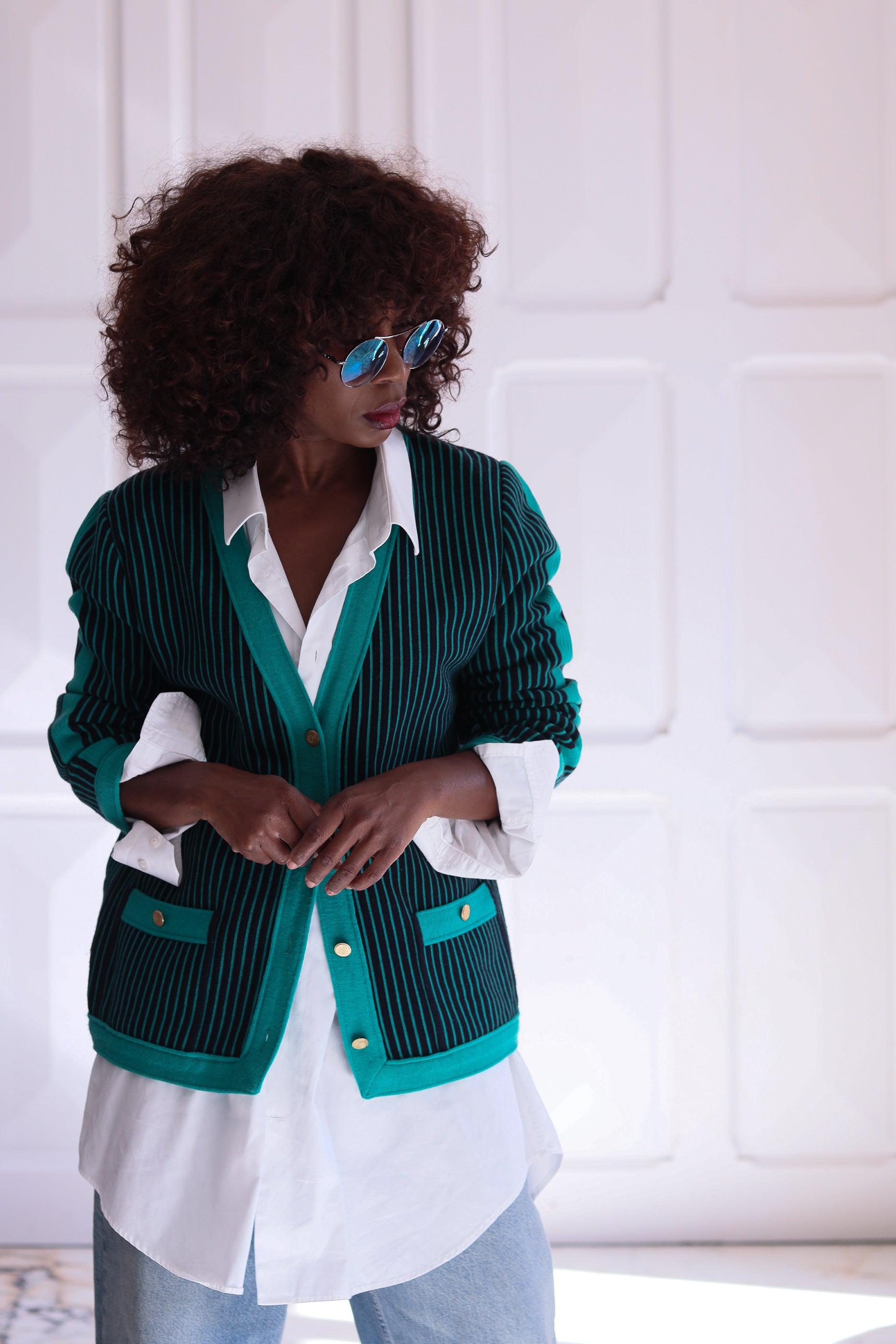 Élégant cardigan vintage signé Devernois Paris, de fabrication française et datant des années 1990. On aime son charme au style marin, apporté par ses motifs rayures. Fermeture par boutons dorés gravés, poches plaquées à rabat pour une allure chic et pratique.