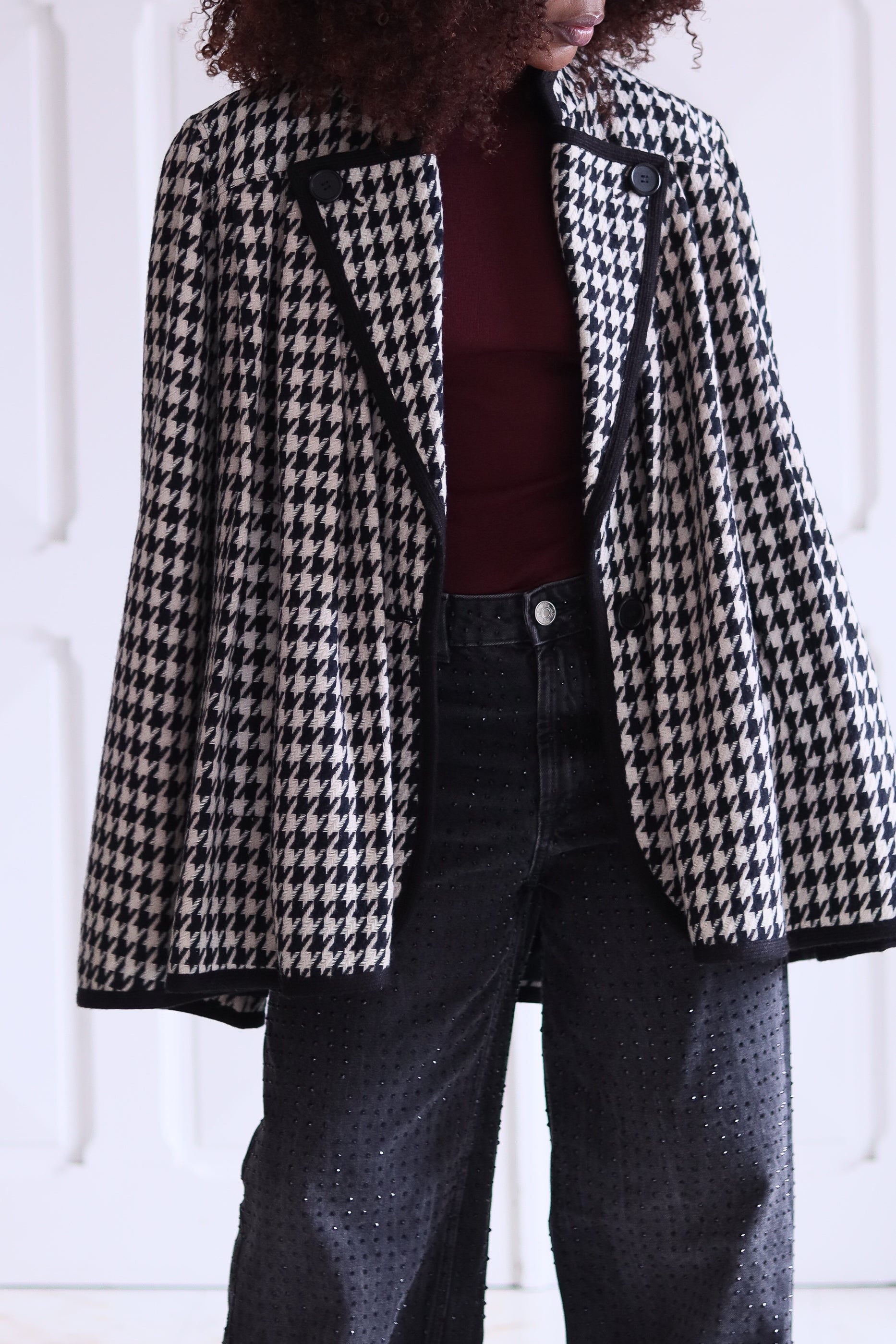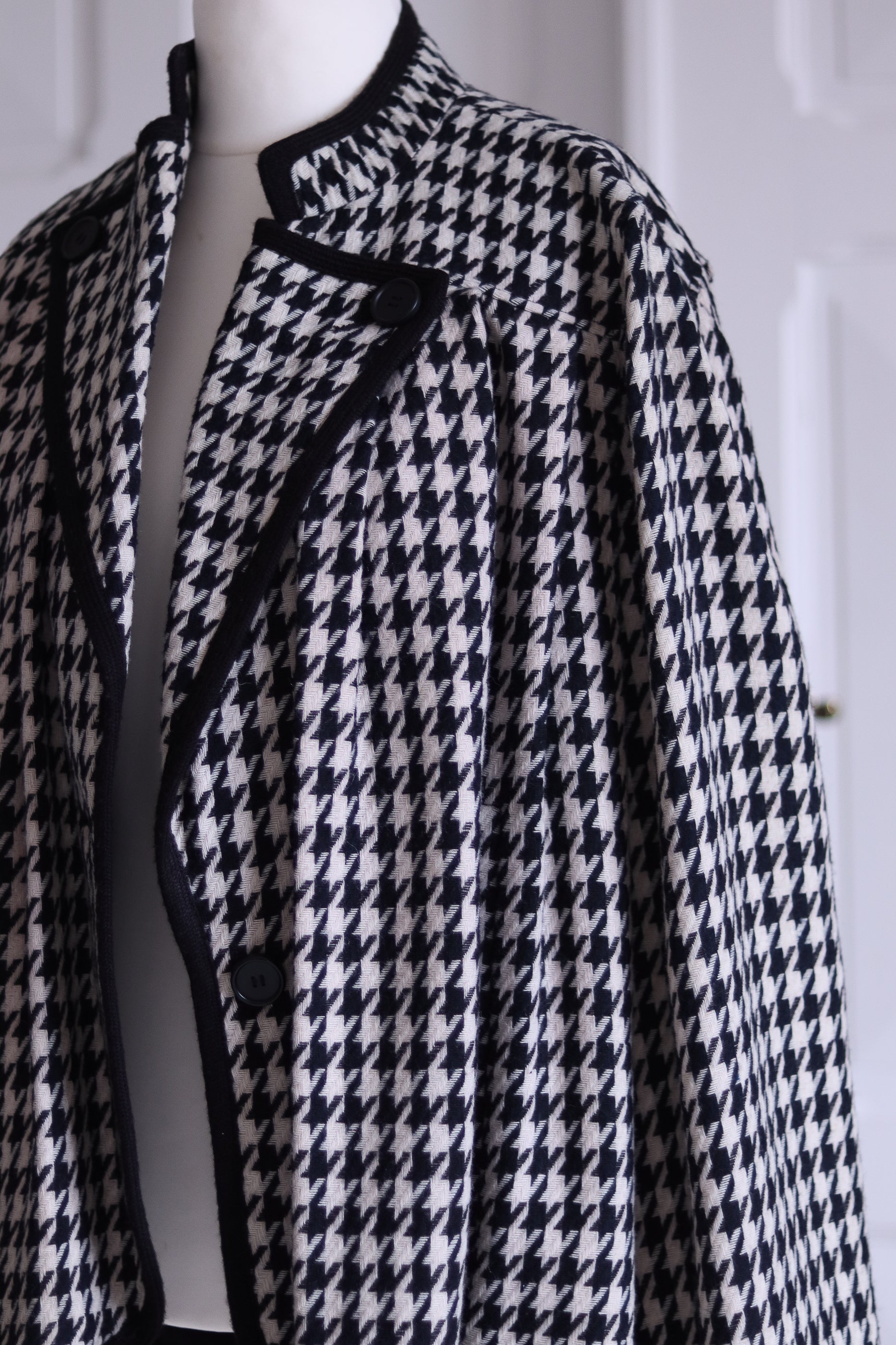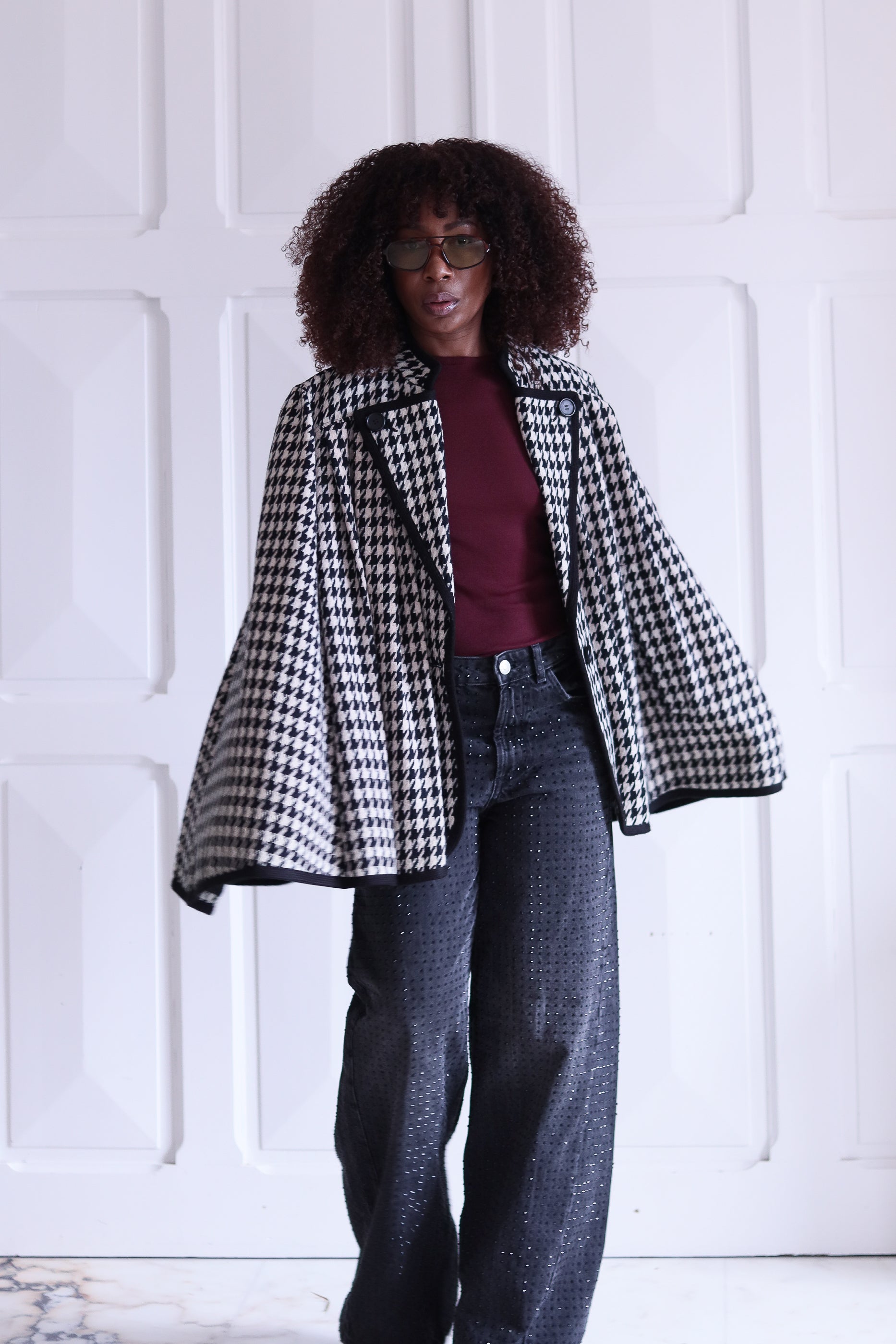 Icône du chic à la française, cette cape vintage en laine arbore le célèbre motif pied-de-poule noir et blanc, indémodable et sophistiqué.Sa coupe évasée et structurée souligne les épaules tout en offrant un tombé fluide et élégant.