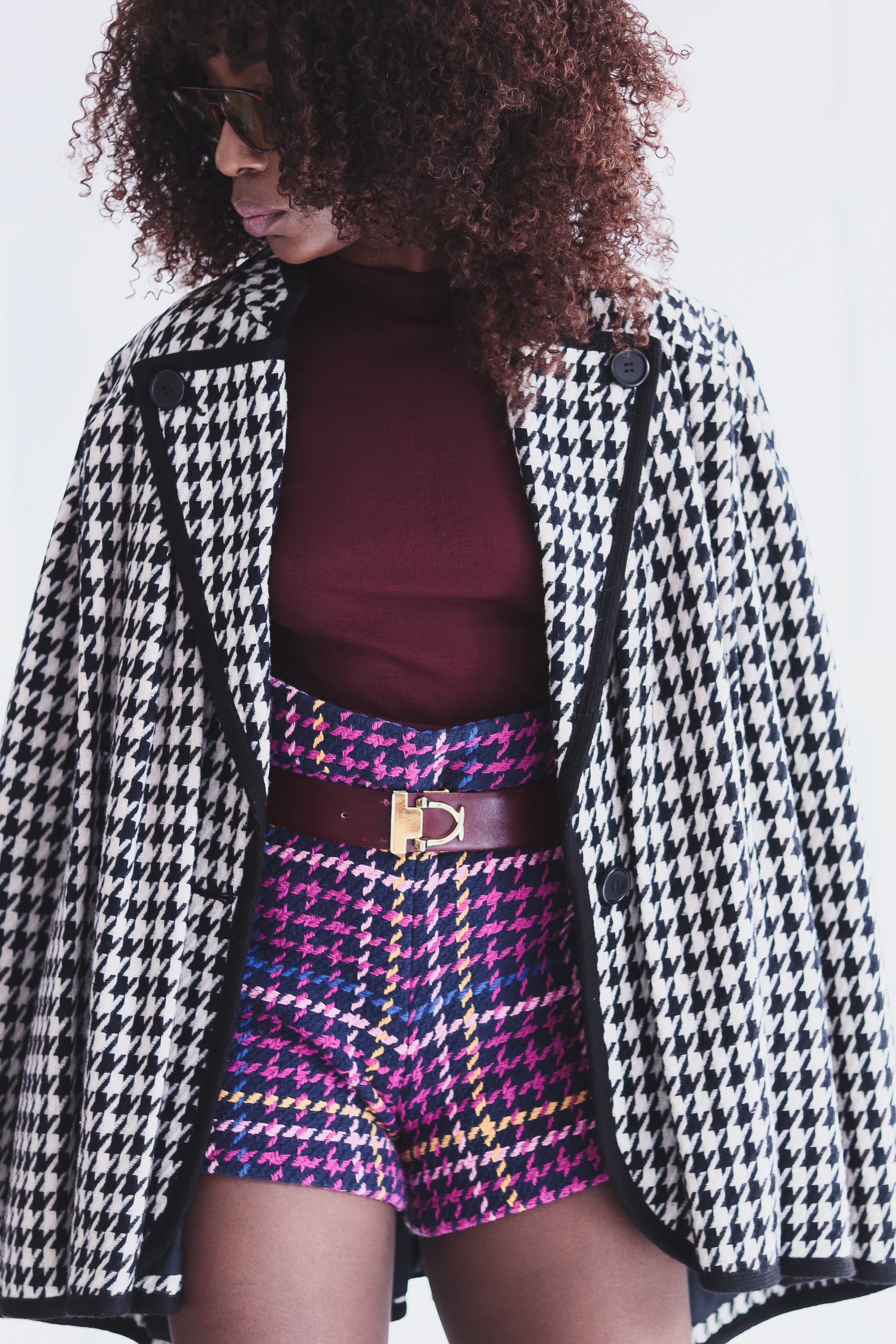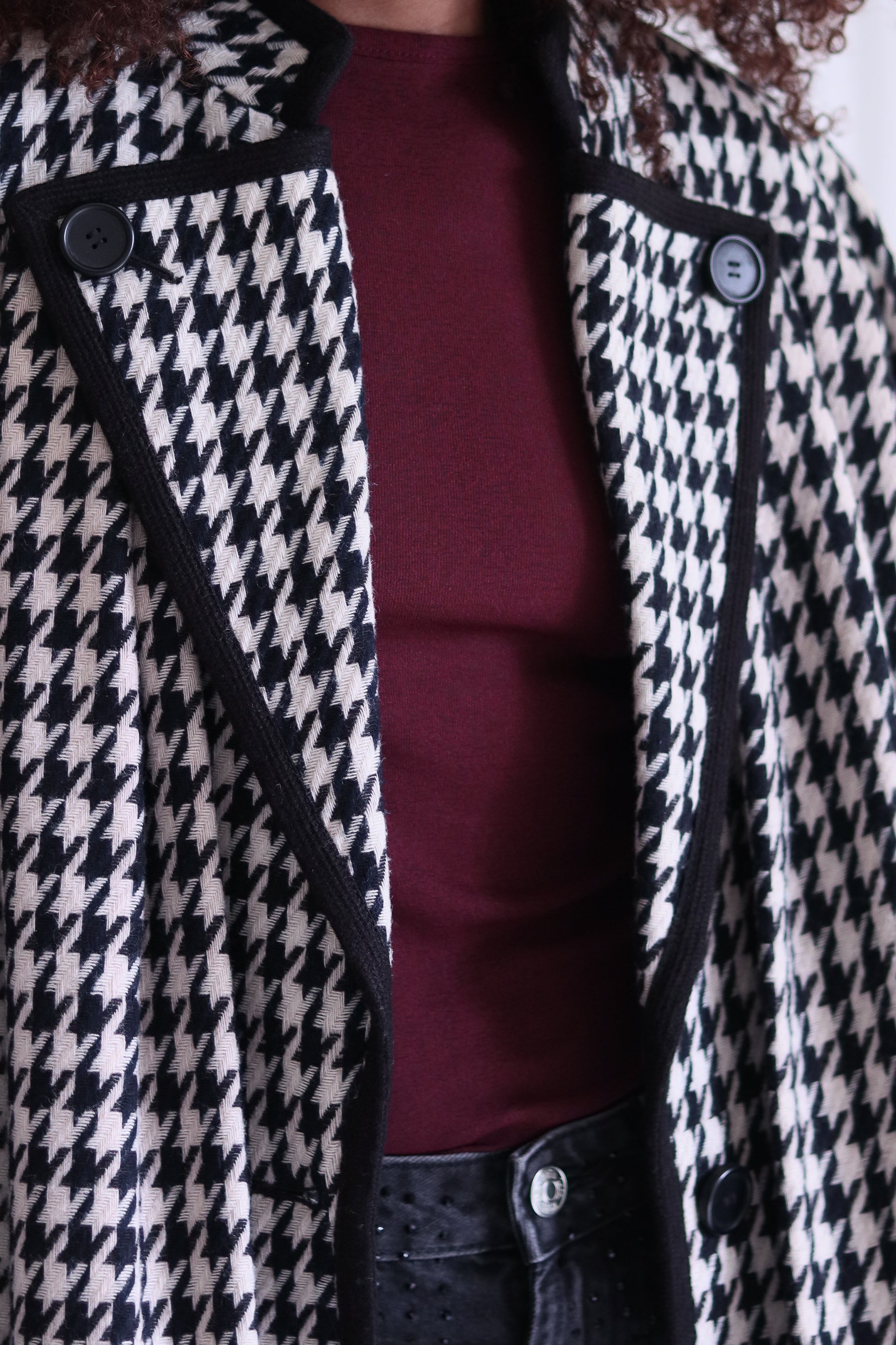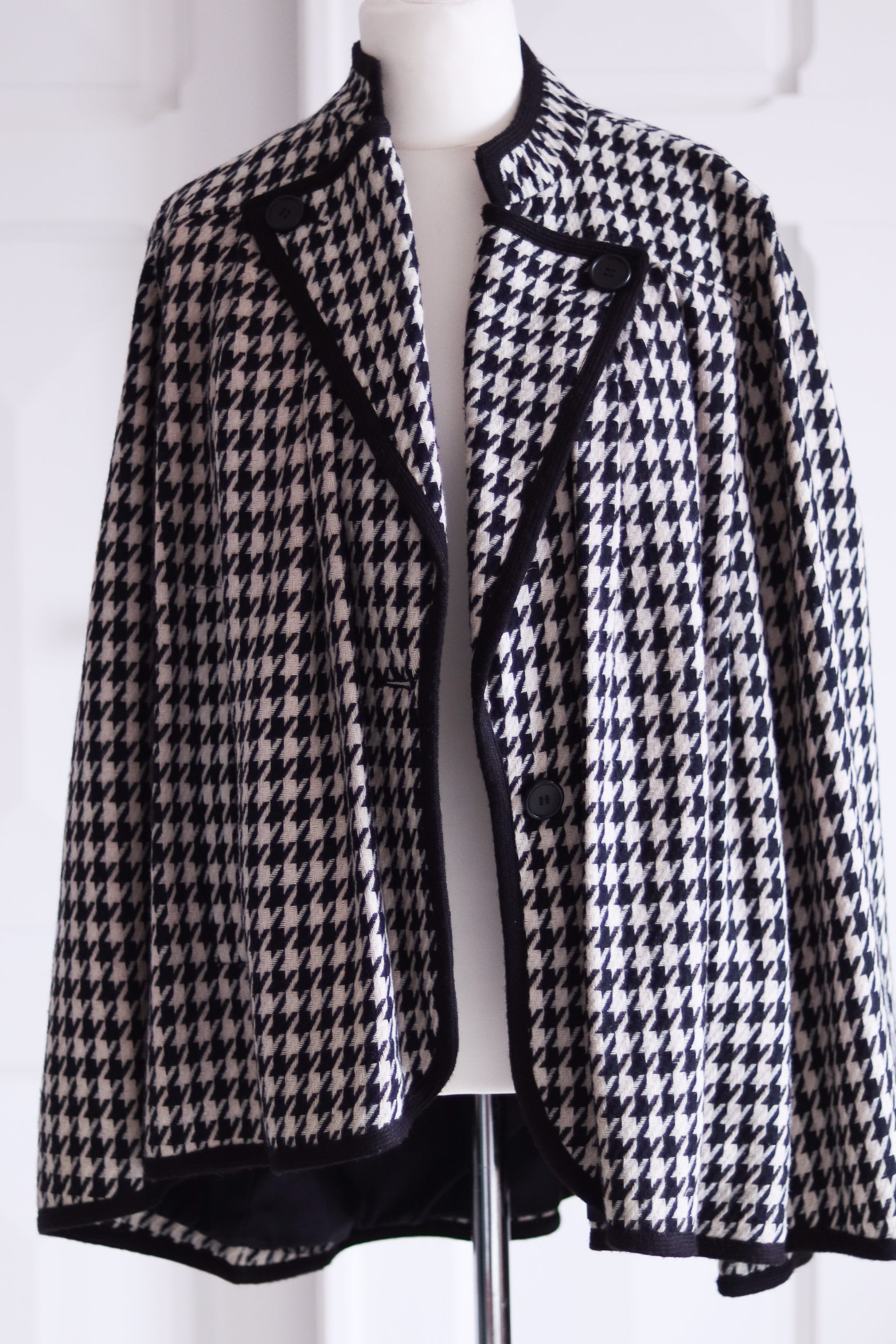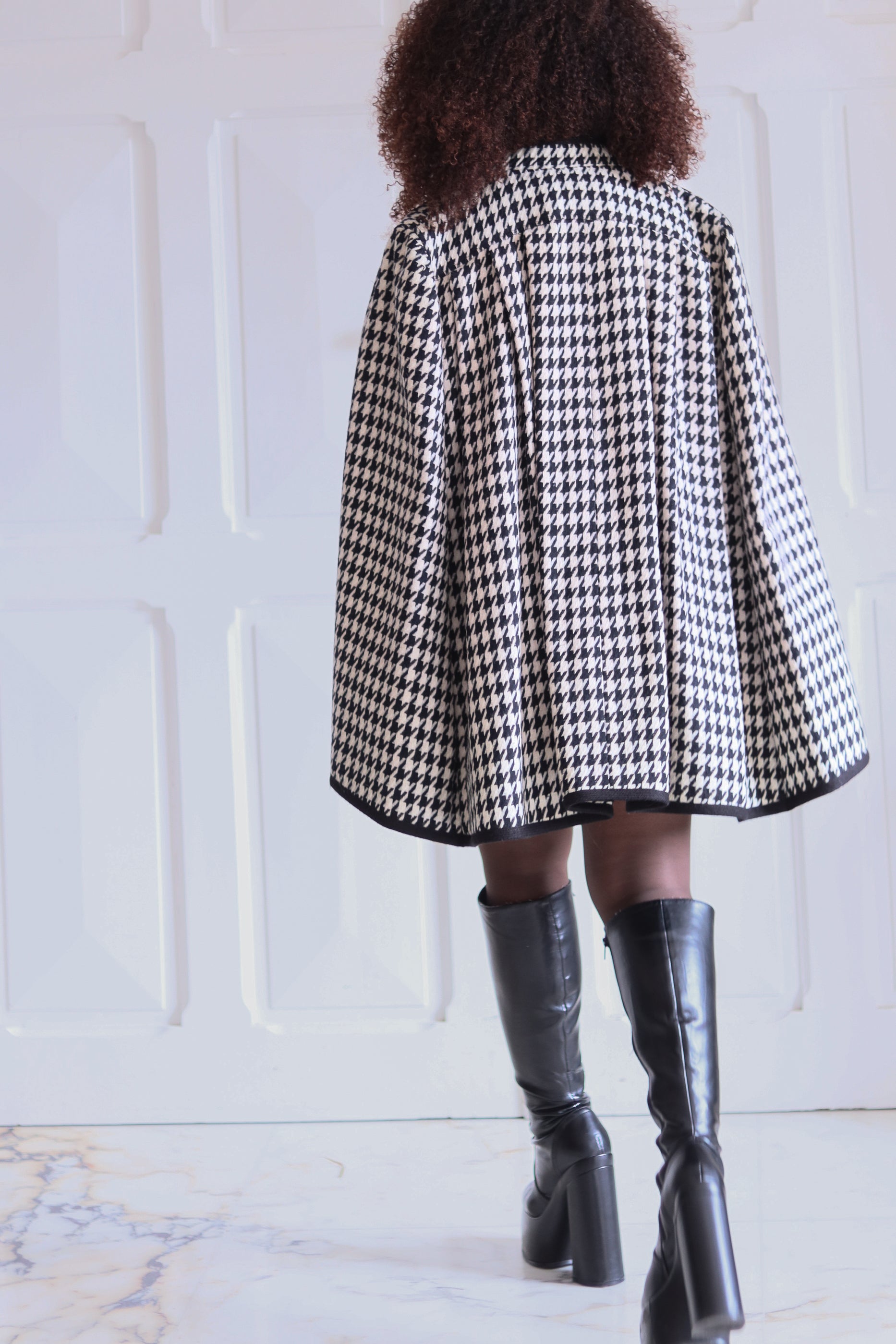 Icône du chic à la française, cette cape vintage en laine arbore le célèbre motif pied-de-poule noir et blanc, indémodable et sophistiqué.Sa coupe évasée et structurée souligne les épaules tout en offrant un tombé fluide et élégant.