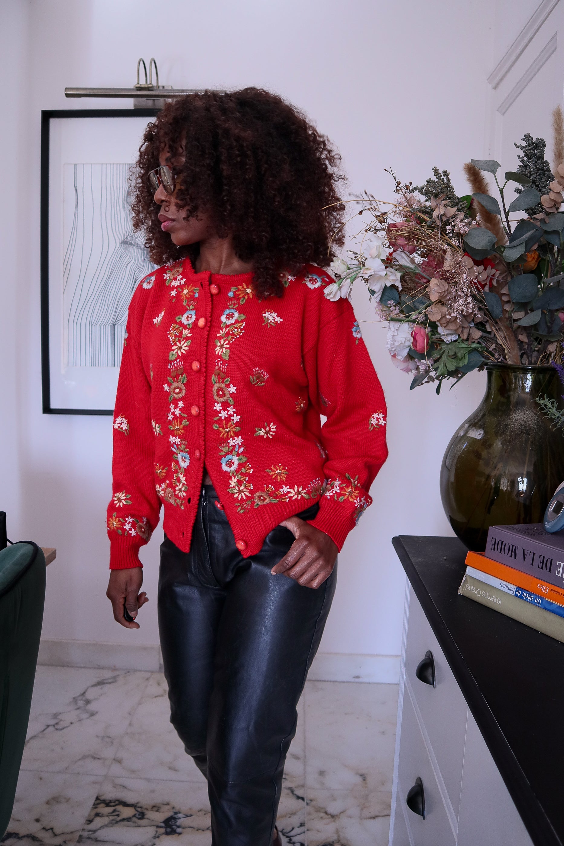 Un bijou de tricot au charme d’antan : ce cardigan rouge vif, richement brodé à la main, illustre tout le savoir-faire artisanal des années 70.