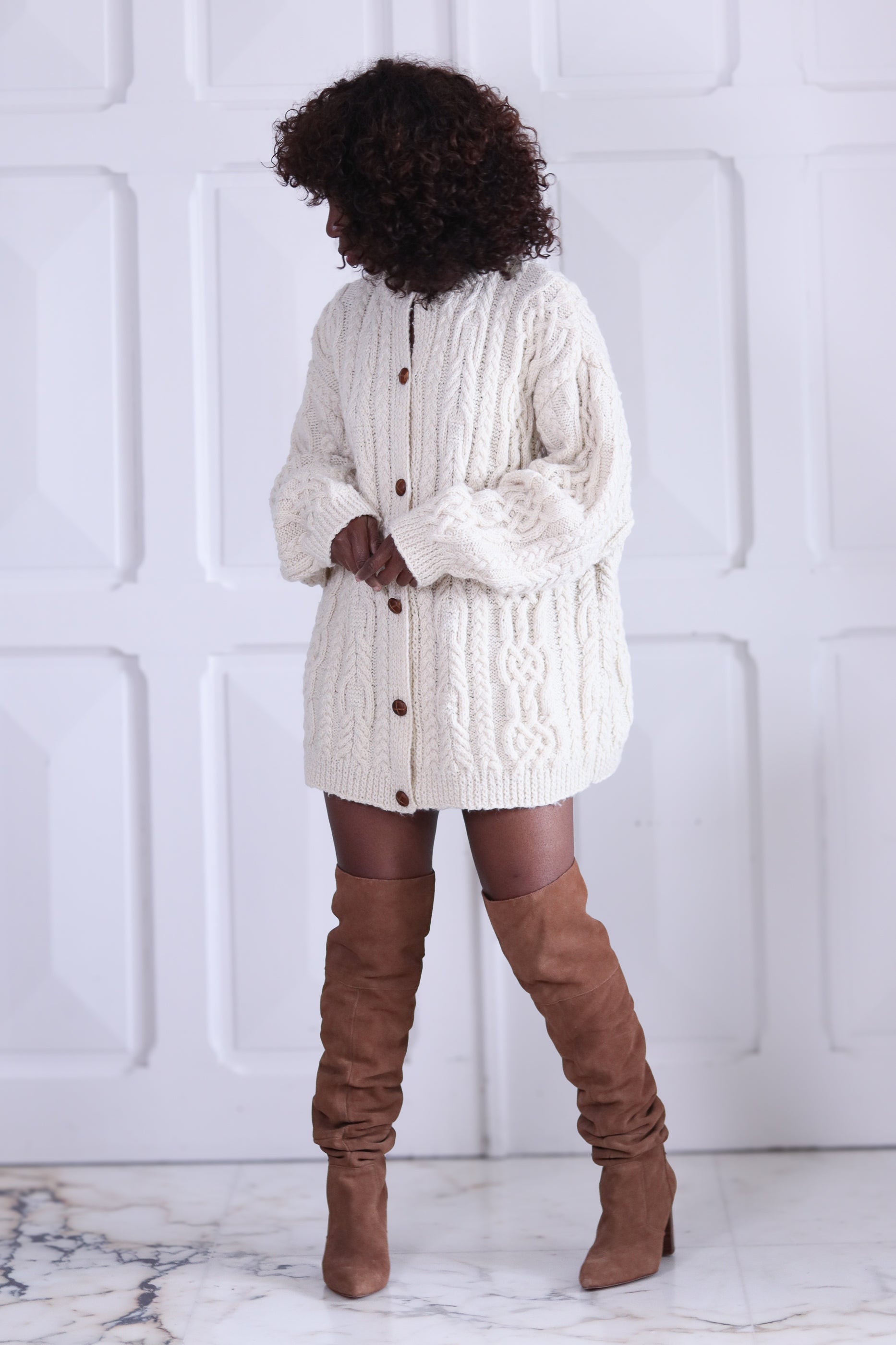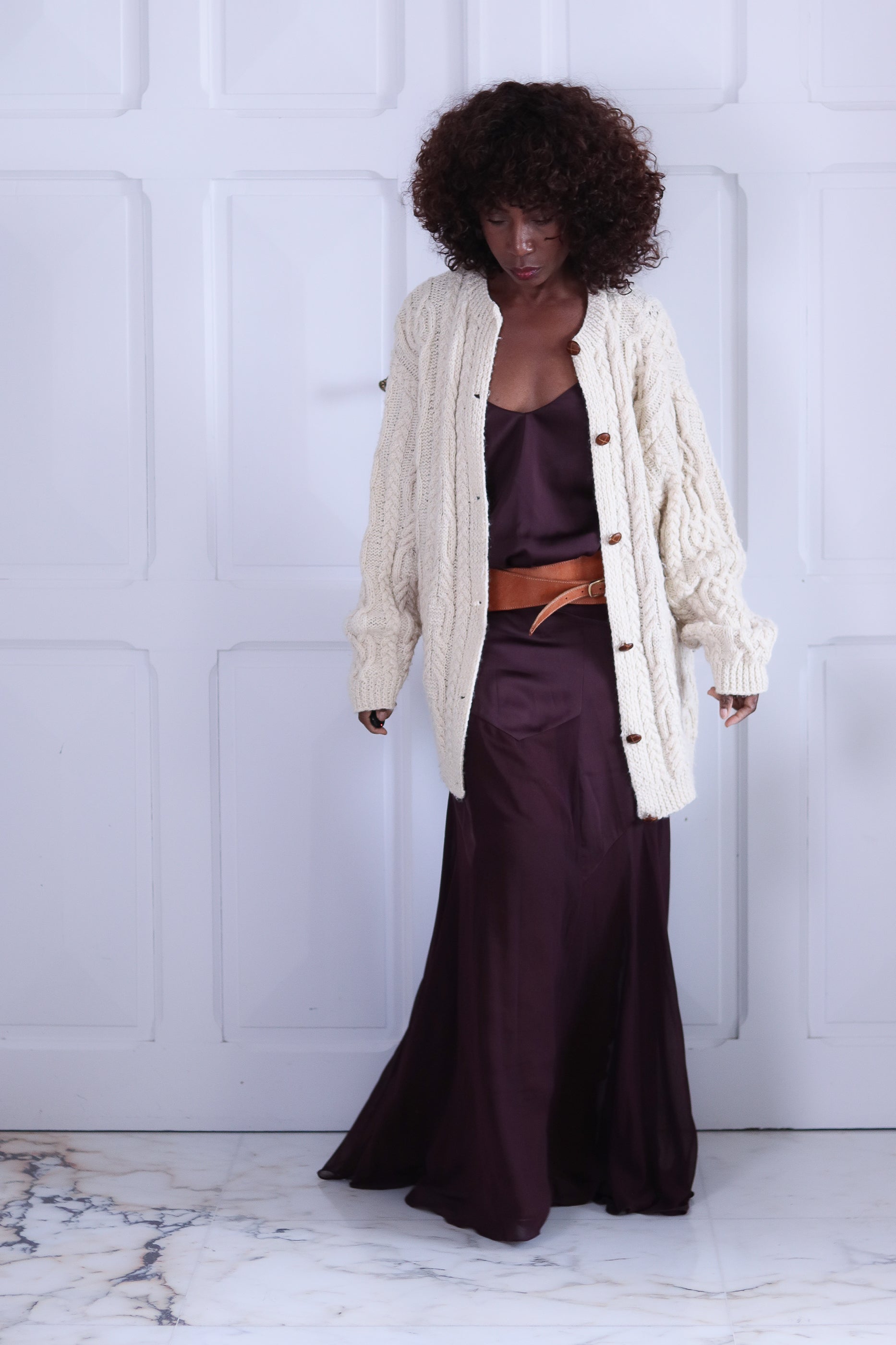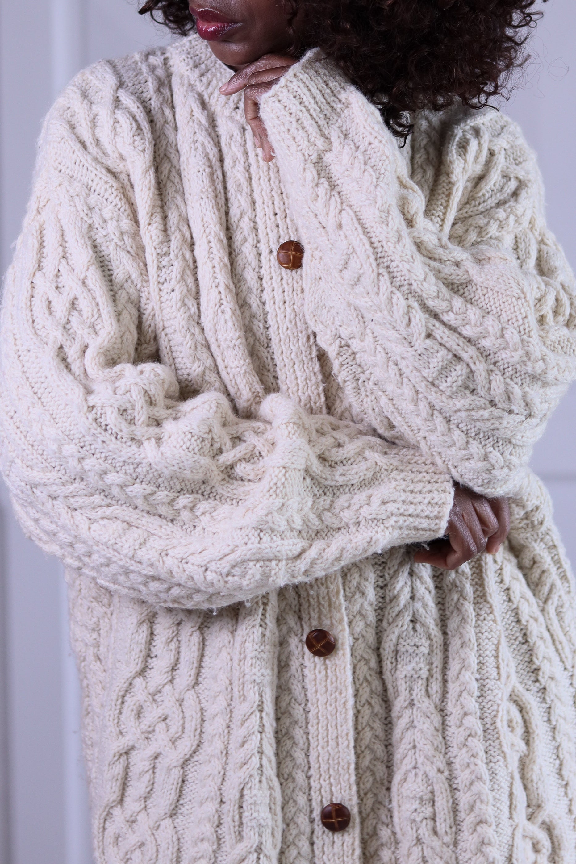 Chaleureux et cocooning, lo,g cardigan vintage des années 1970 en maille torsadée. Belle pièce authentique en laine écrue tricoté main.