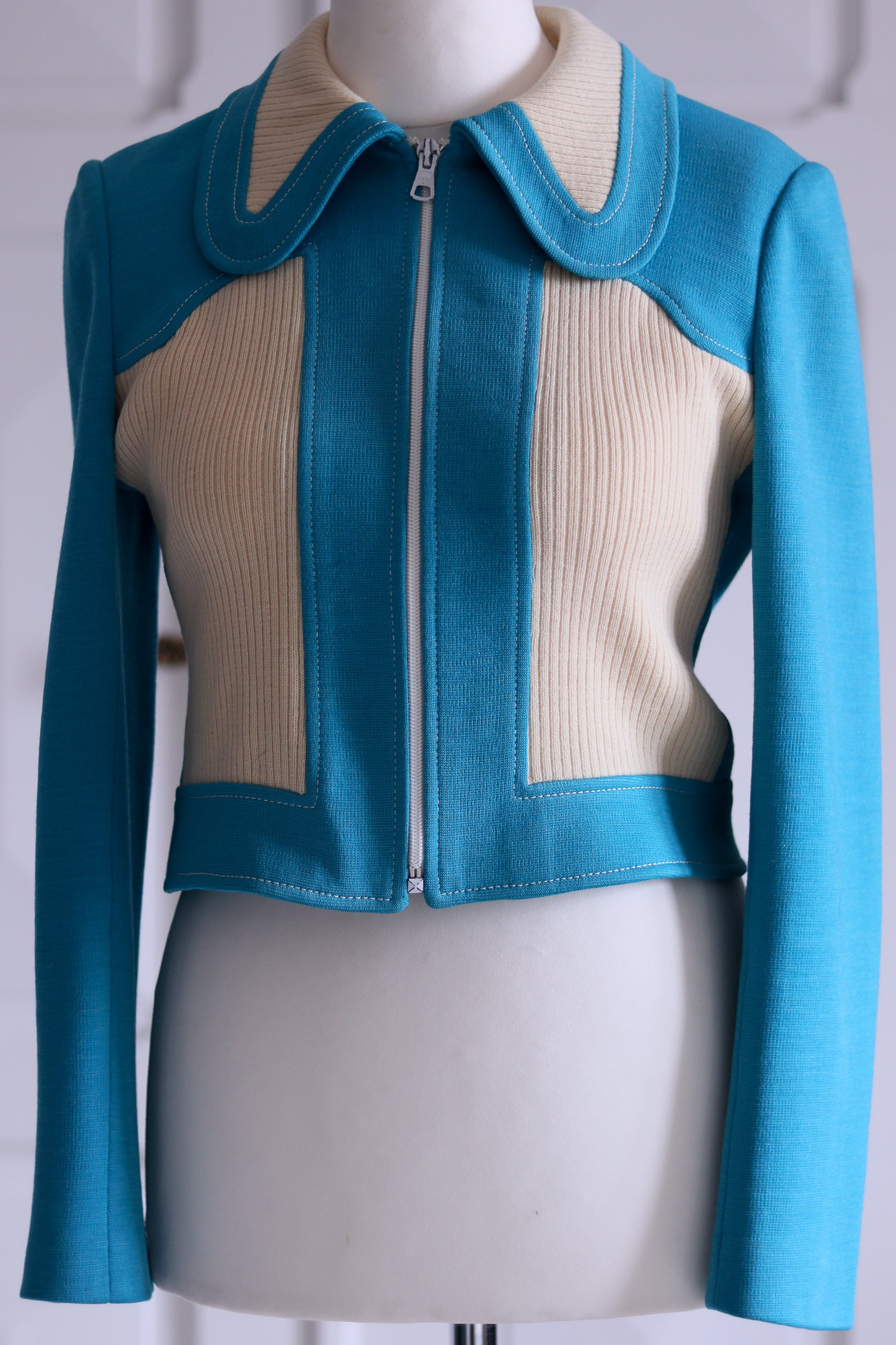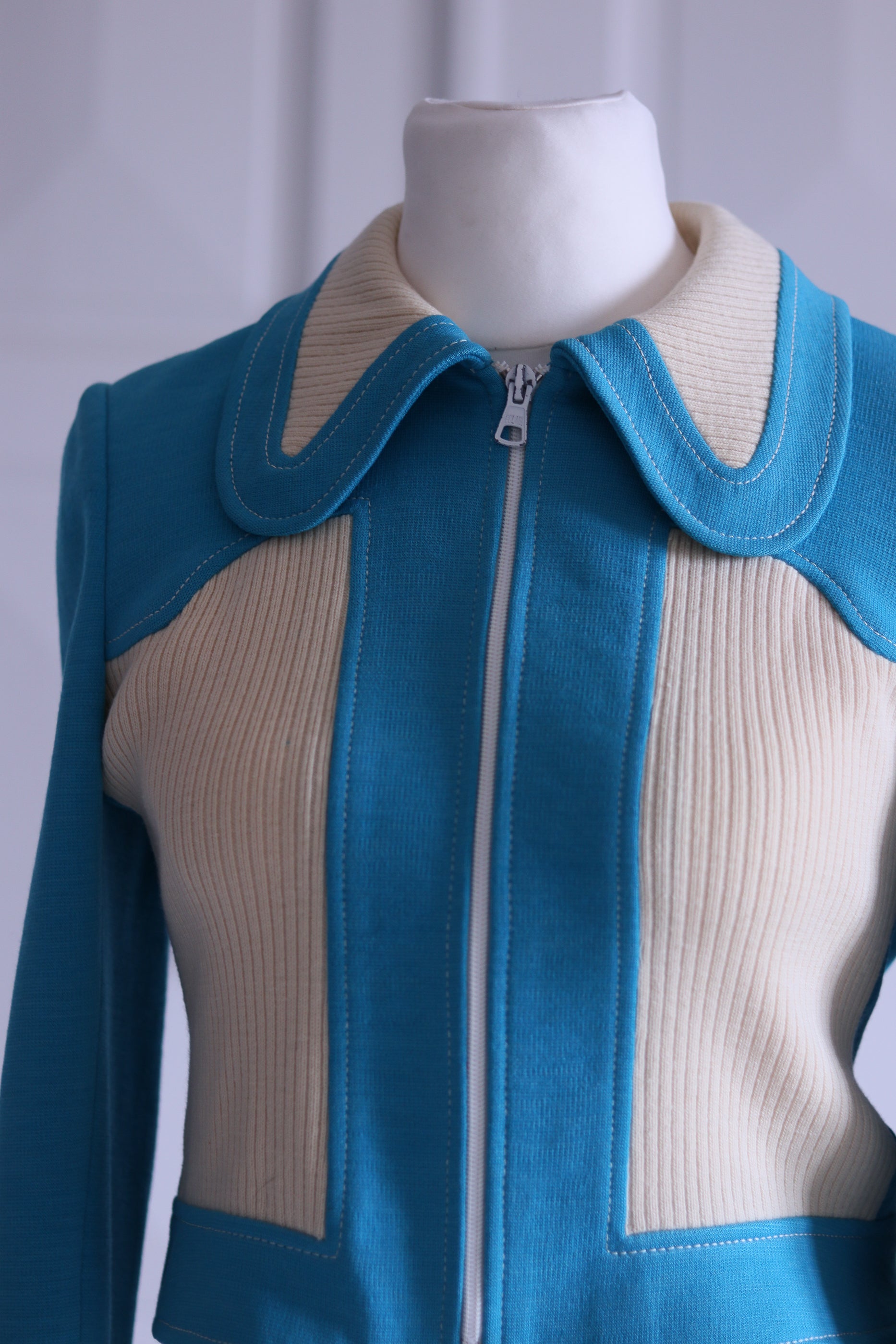 Les surpiqûres contrastées et le zip argenté ajoutent la touche futuriste typique des années 70