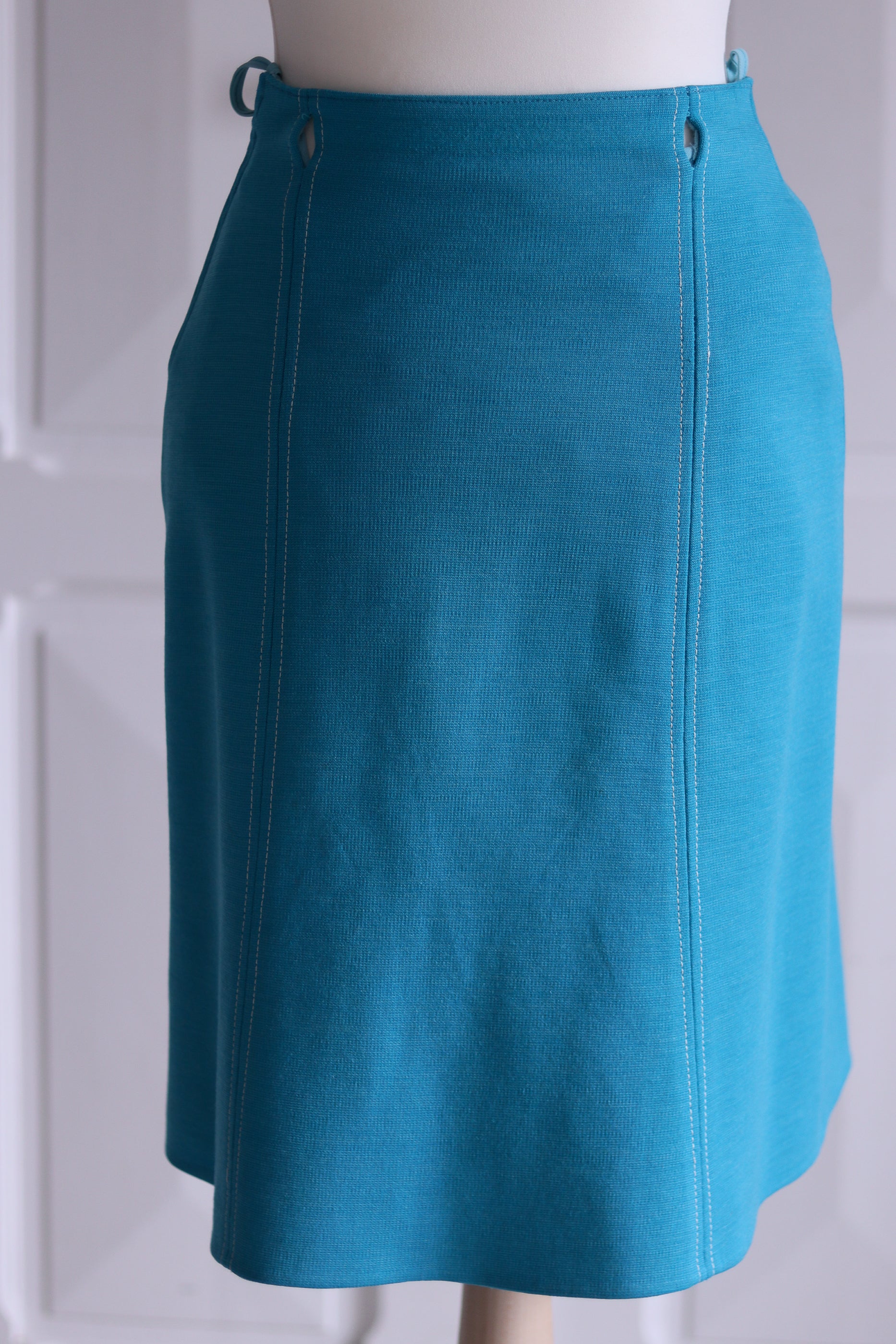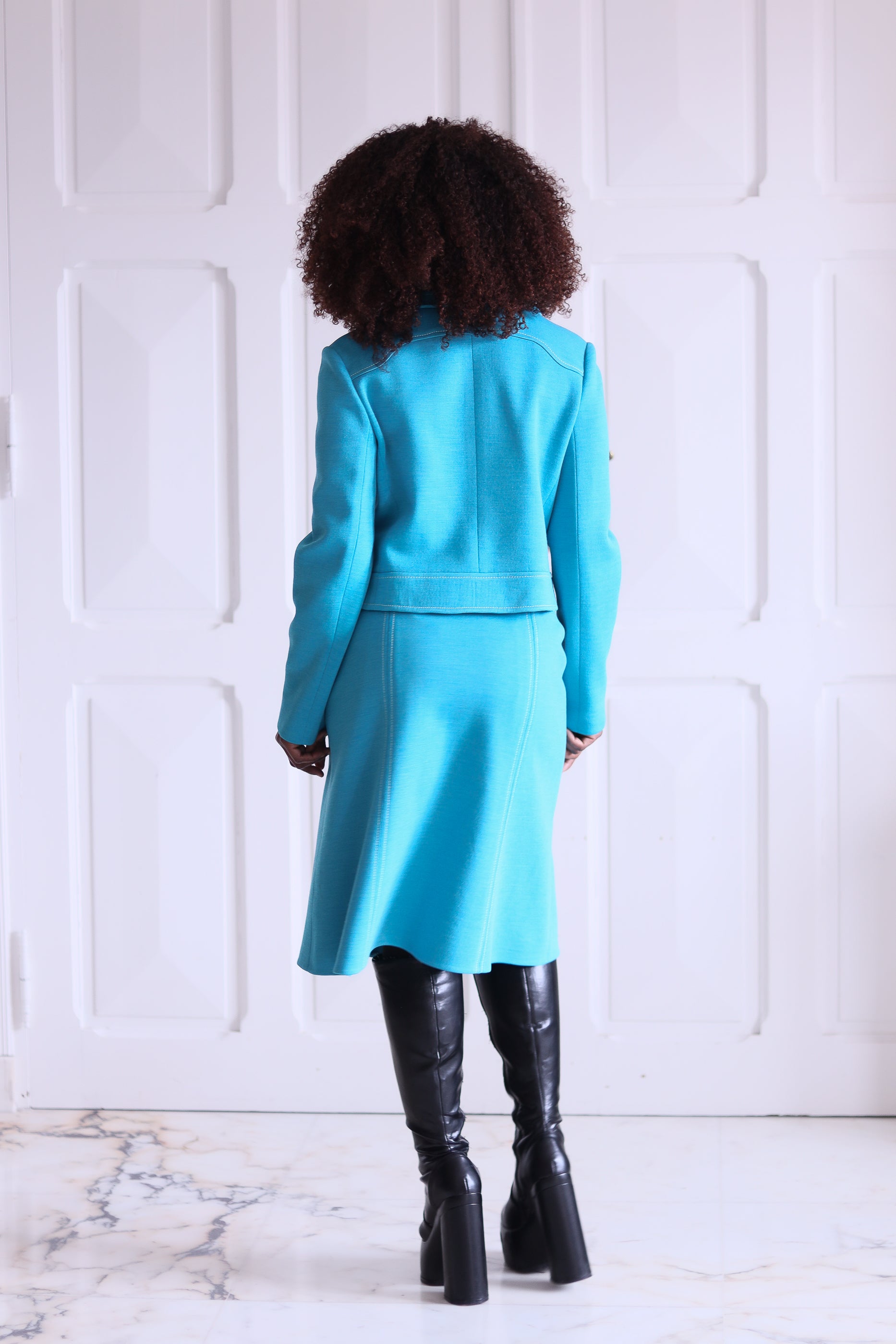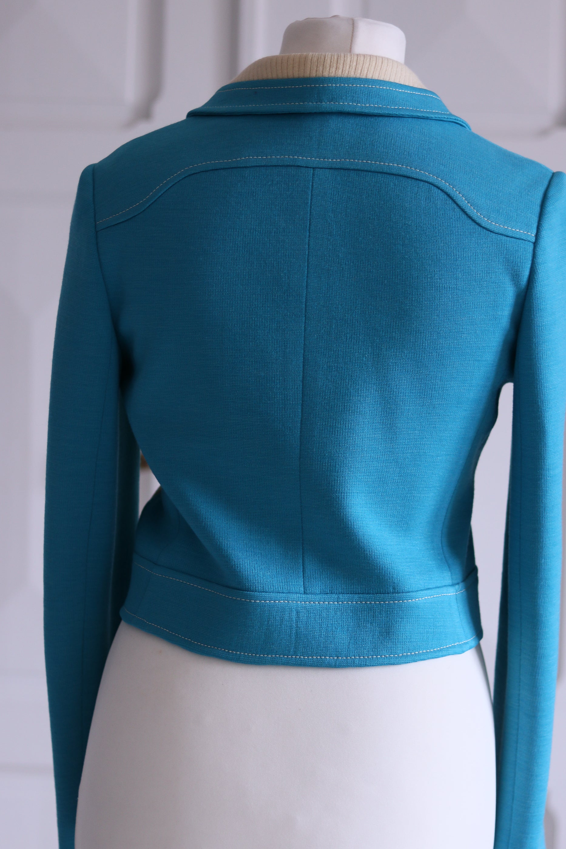 Un duo qui respire les sixties avec sa coupe graphique et ses couleurs pop : turquoise et crème. Confectionné à la main dans une maille épaisse texturée, cet ensemble vintage se compose d’une veste courte à grand col arrondi et d’une jupe ligne A assortie avec ouverture pour ceinture.