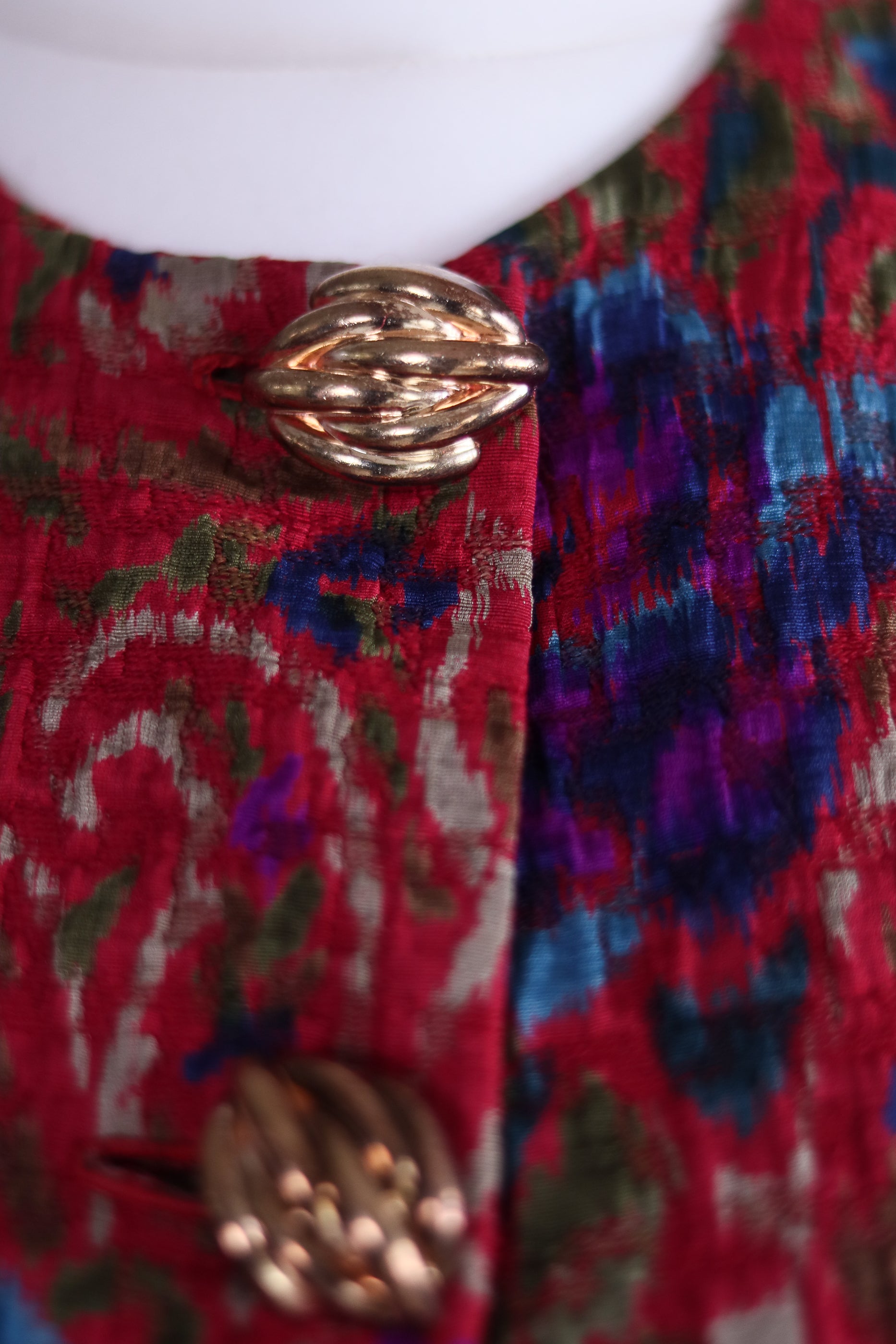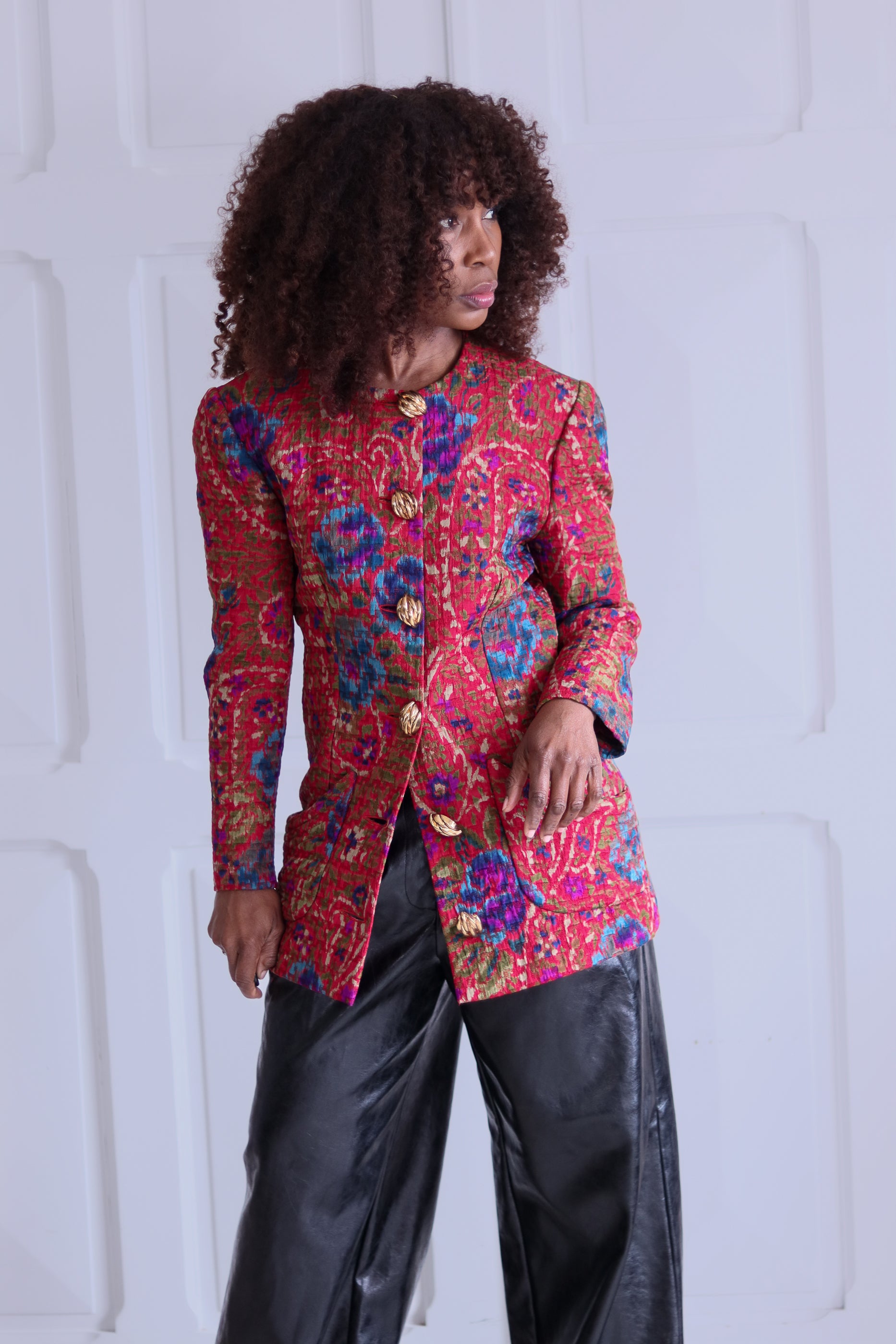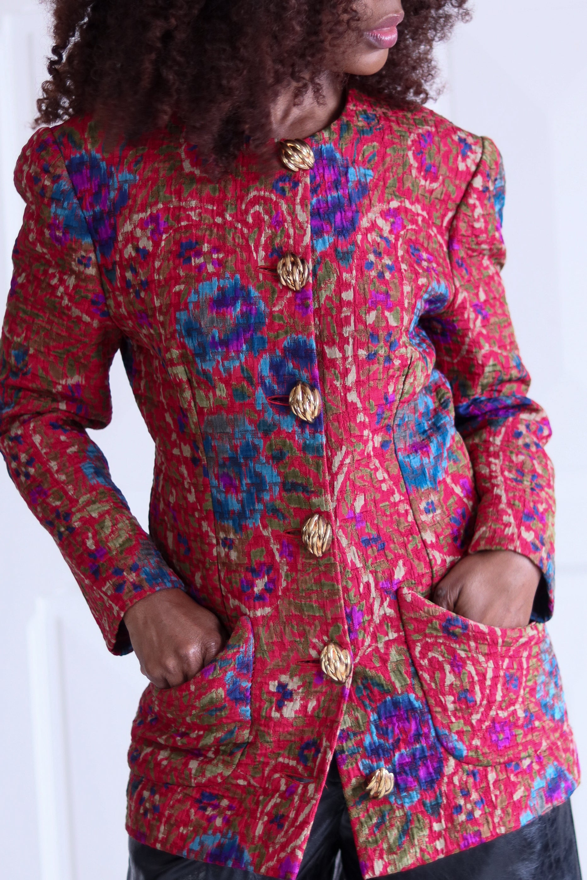 Une œuvre textile à part entière. Cette veste vintage artisanale des années 1980 séduit par son tissage jacquard riche en relief. Coupe structurée à épaules marquées et ses boutons dorés sculptés rappellent les créations couture françaises de la décennie, entre opulence et élégance assumée.