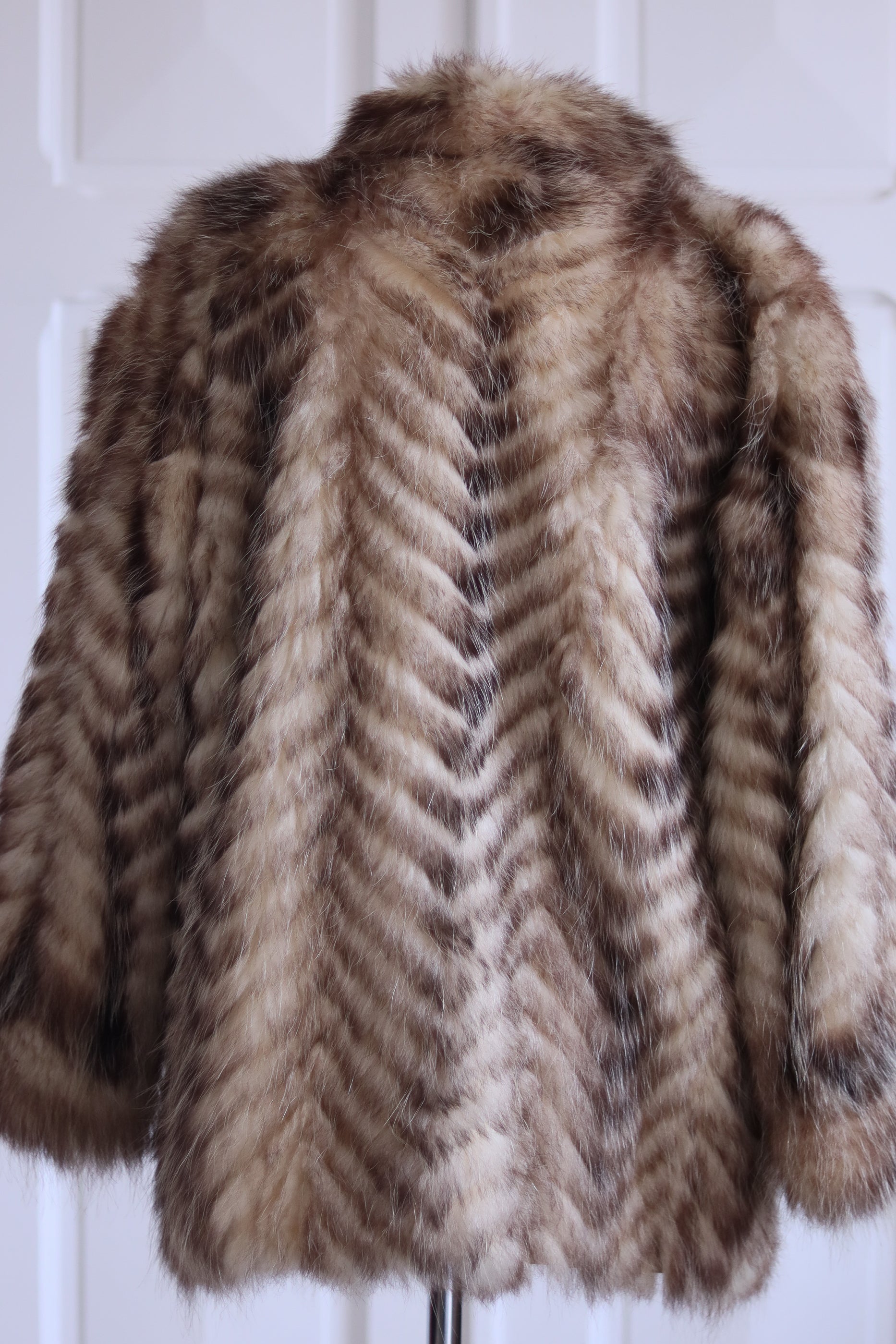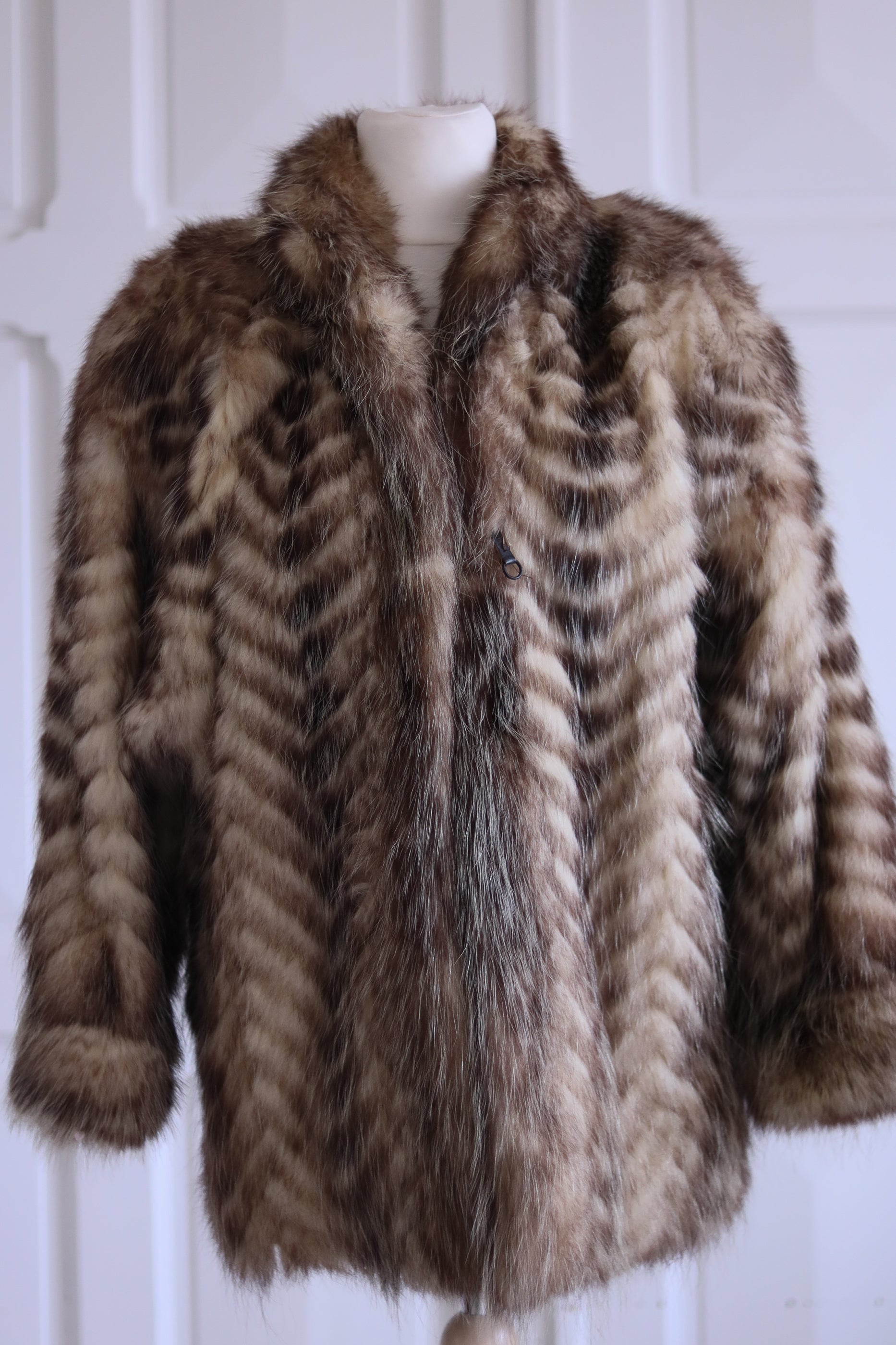 Fabriqué en véritable fourrure de raton laveur, il se distingue par ses motifs chevrons naturels, ses reflets dorés et sa texture douce au toucher, dense et soyeuse.