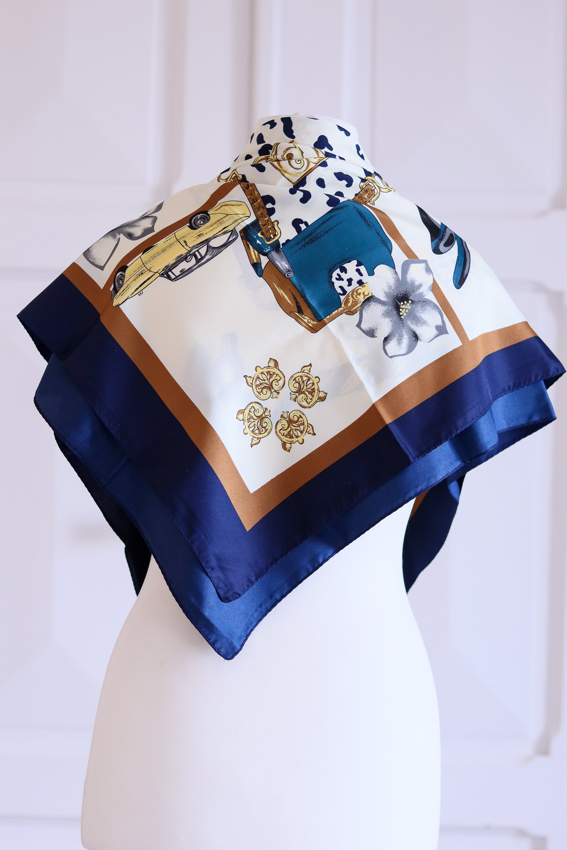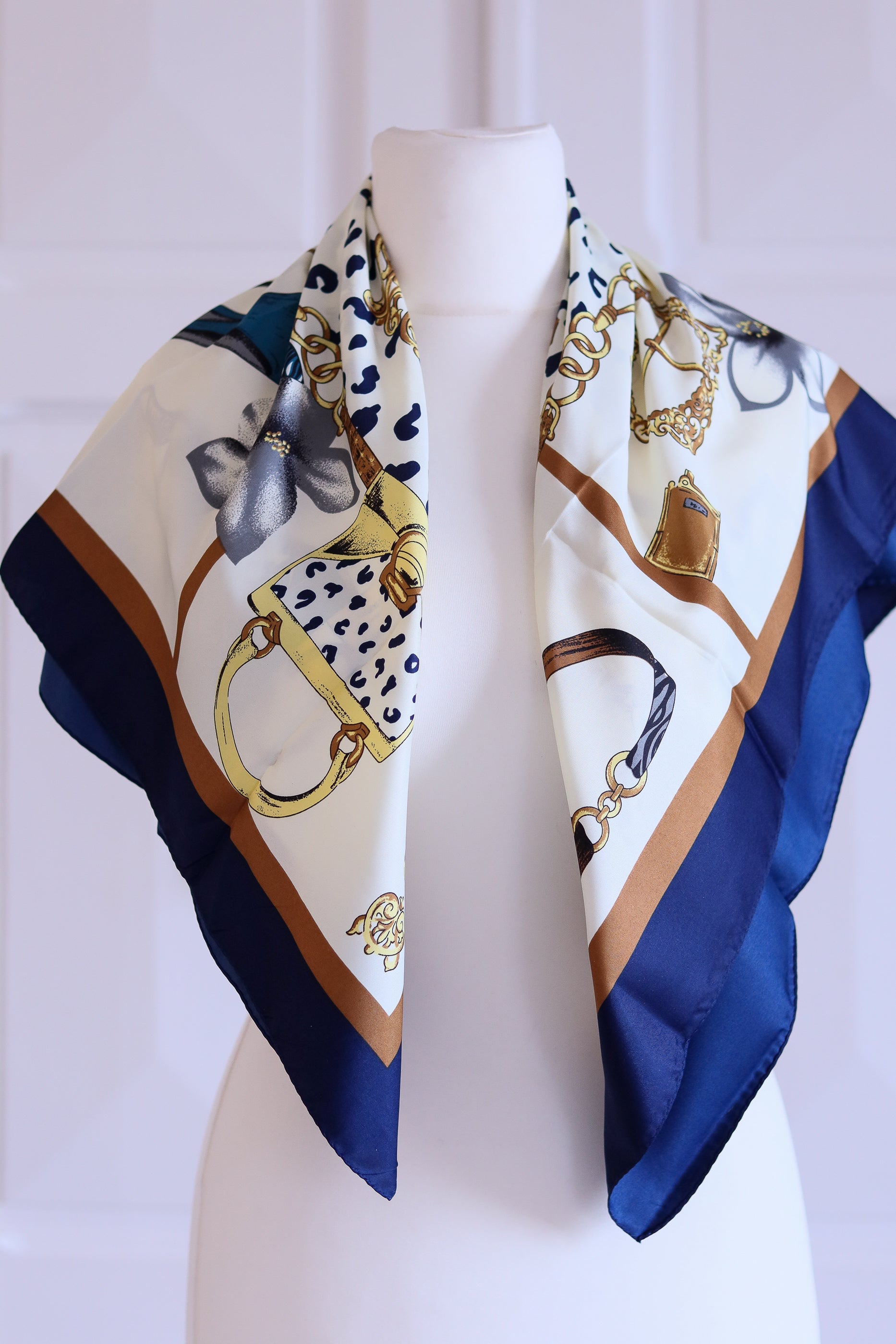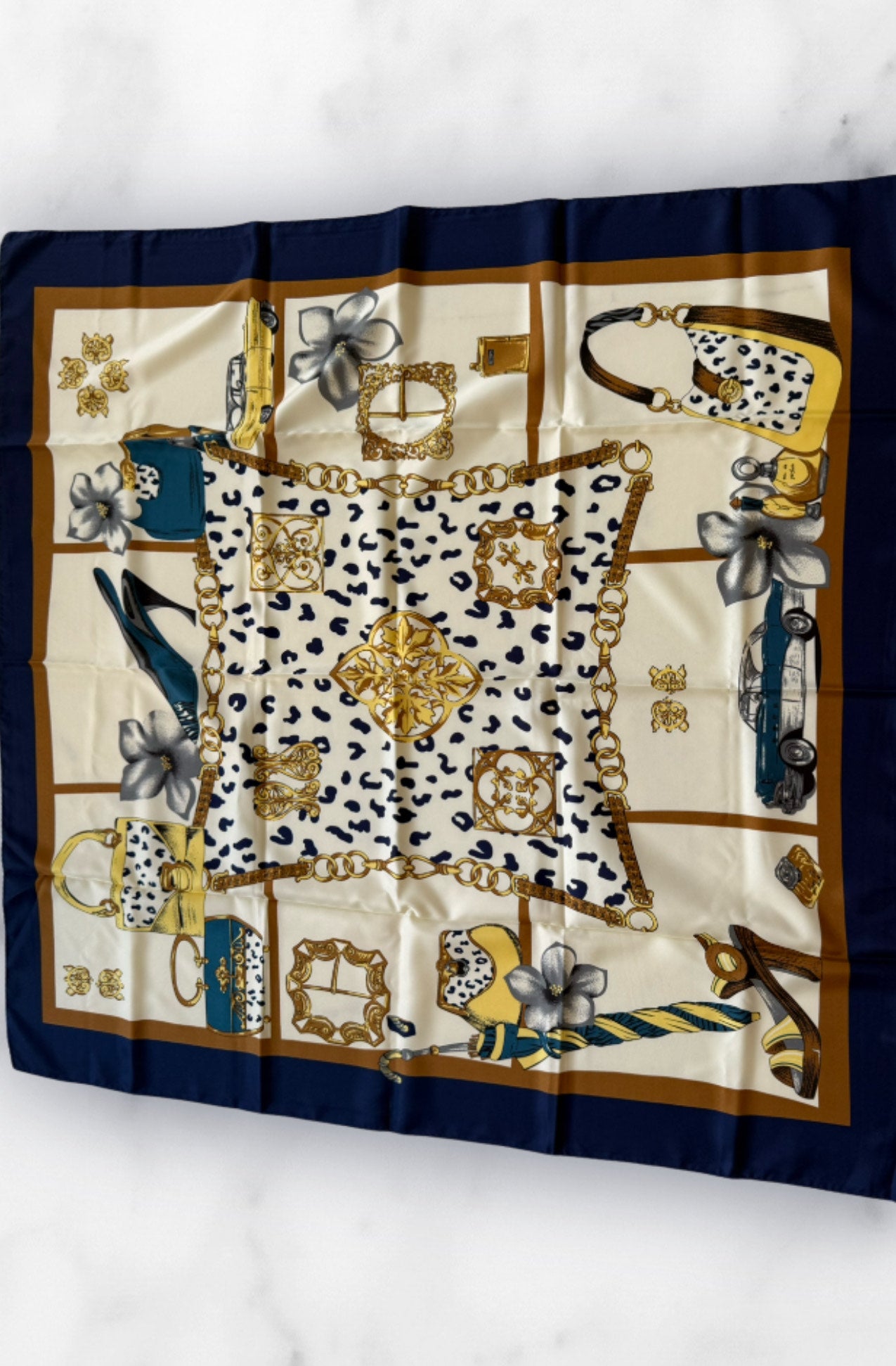 Grand foulard vintage à motif accessoires de luxe et au centre une composition à imprimé léopard. Foulard vintage des années 1990. Bords roulottés en machine