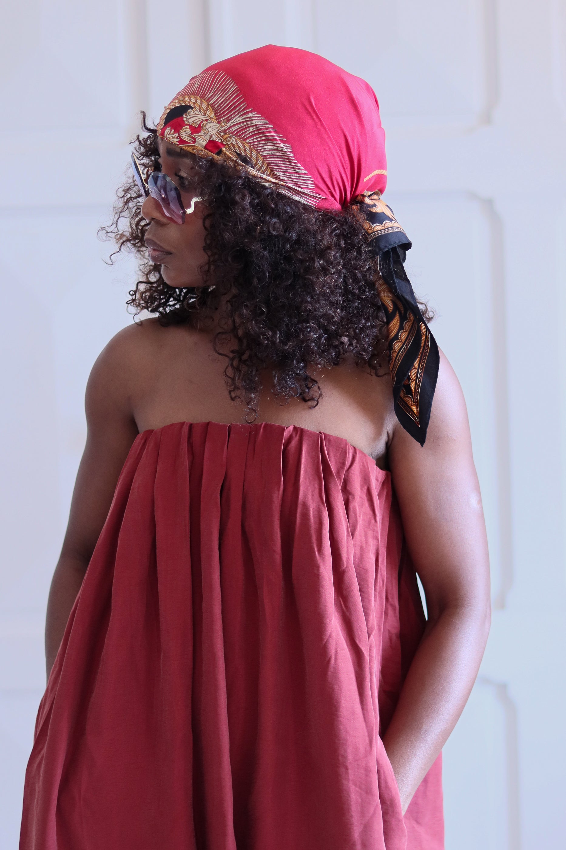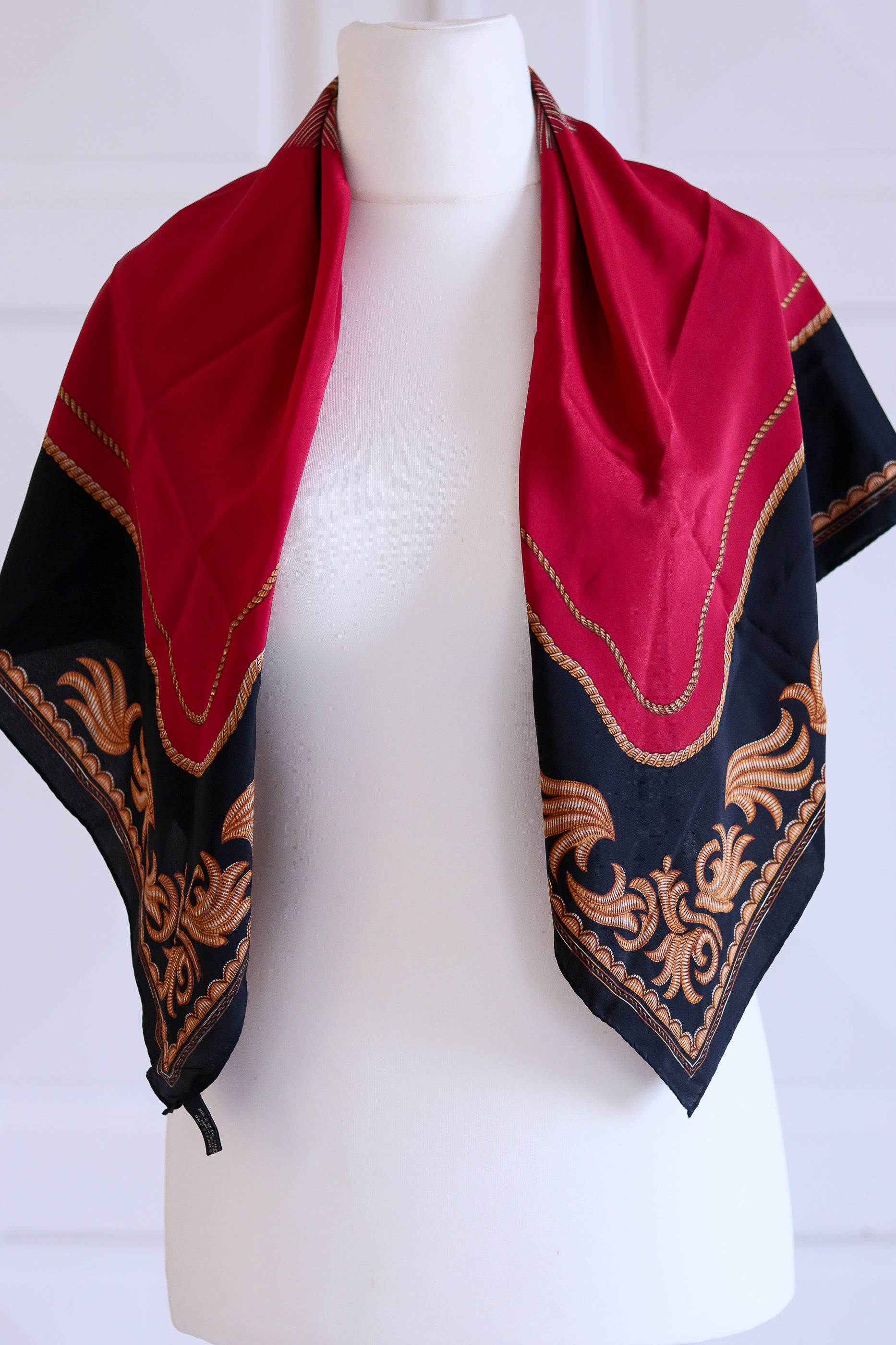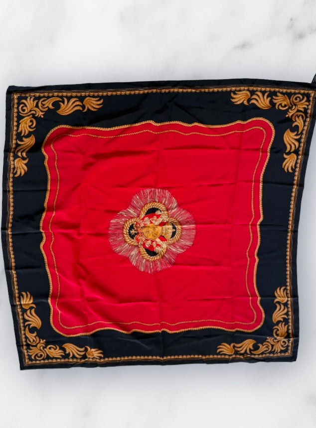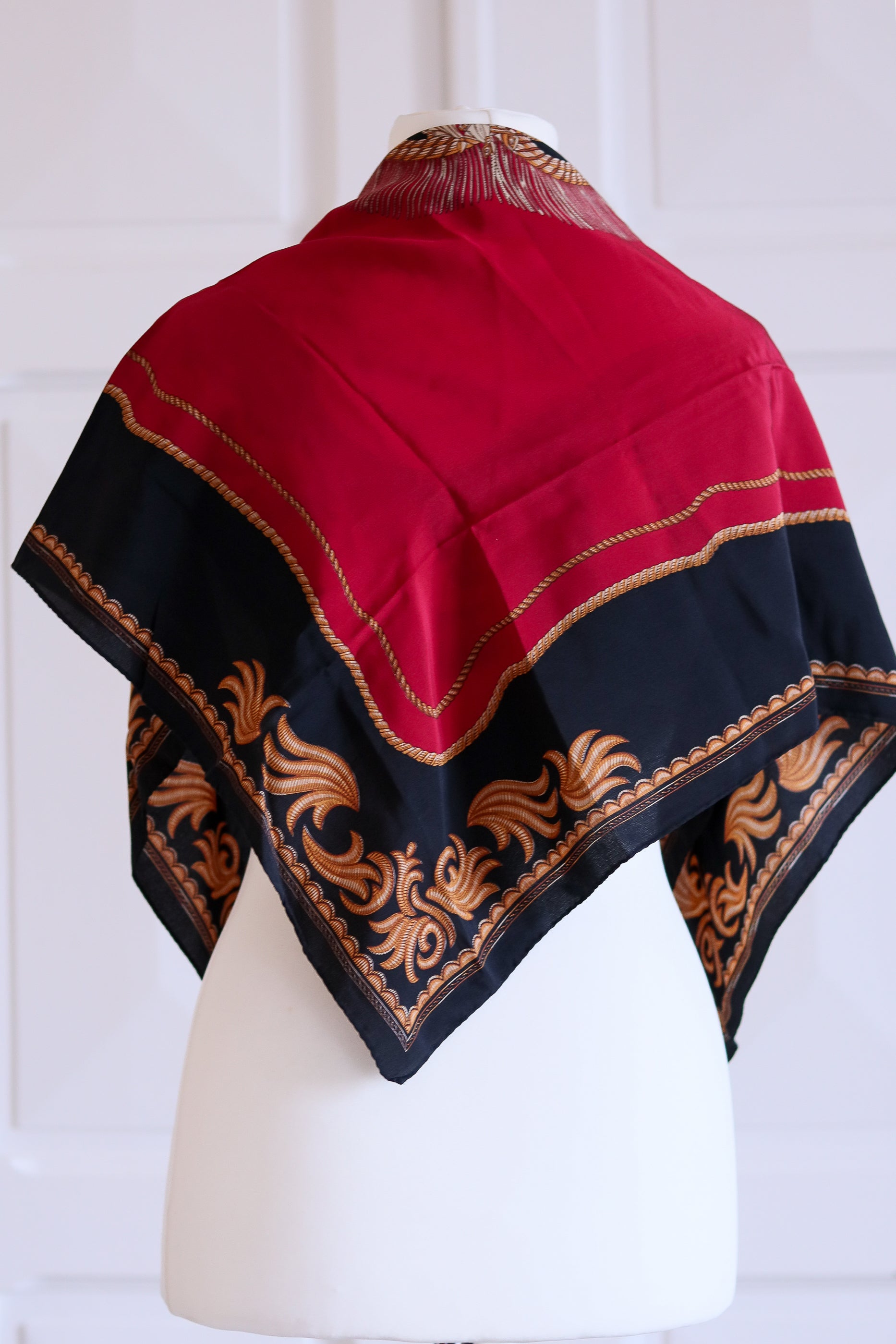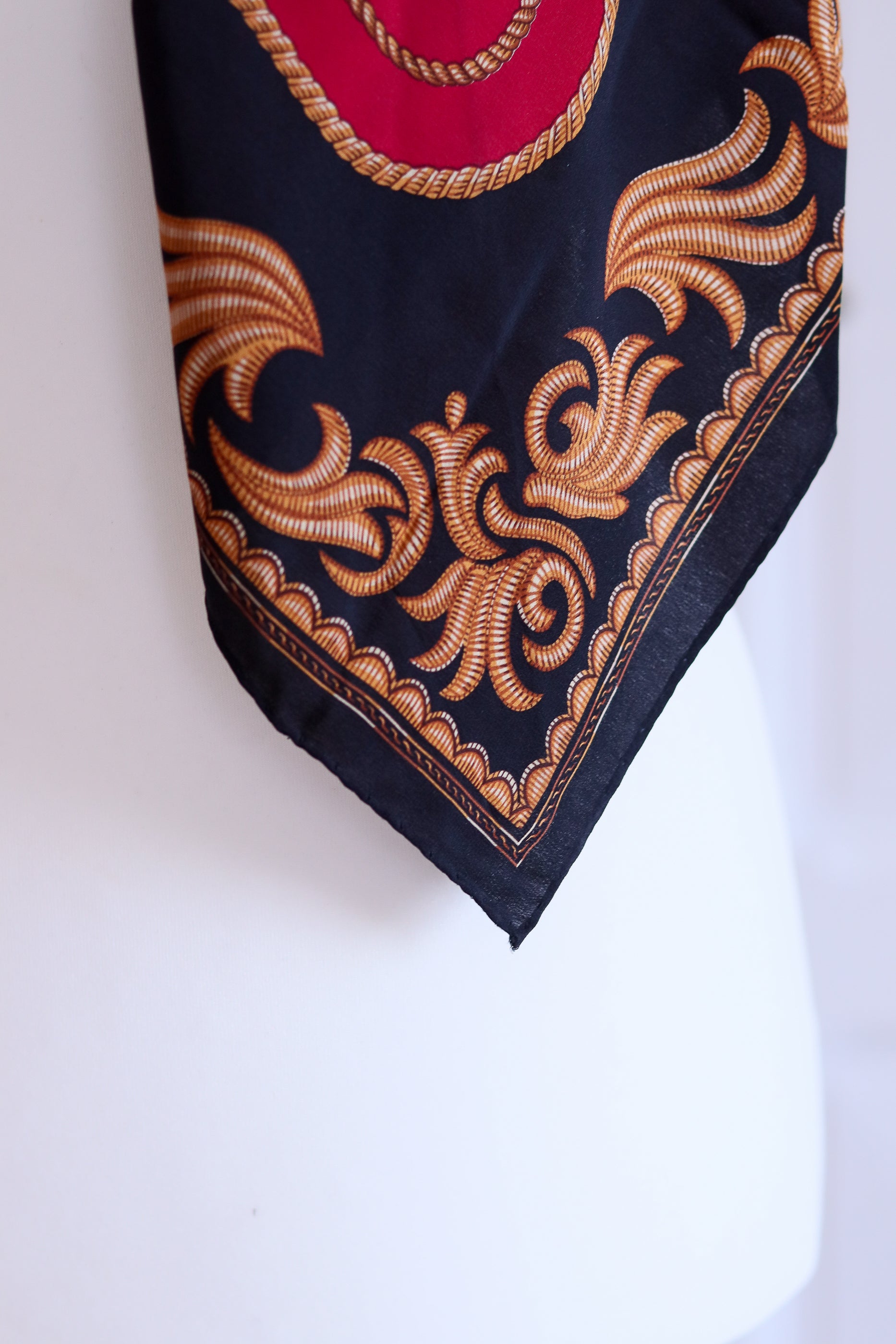 Grand carré de soie à motifs inspiration baroque avec arabesques dorées. foulard vintage des années fin 1980 et de fabrication italienne, bords roulottés