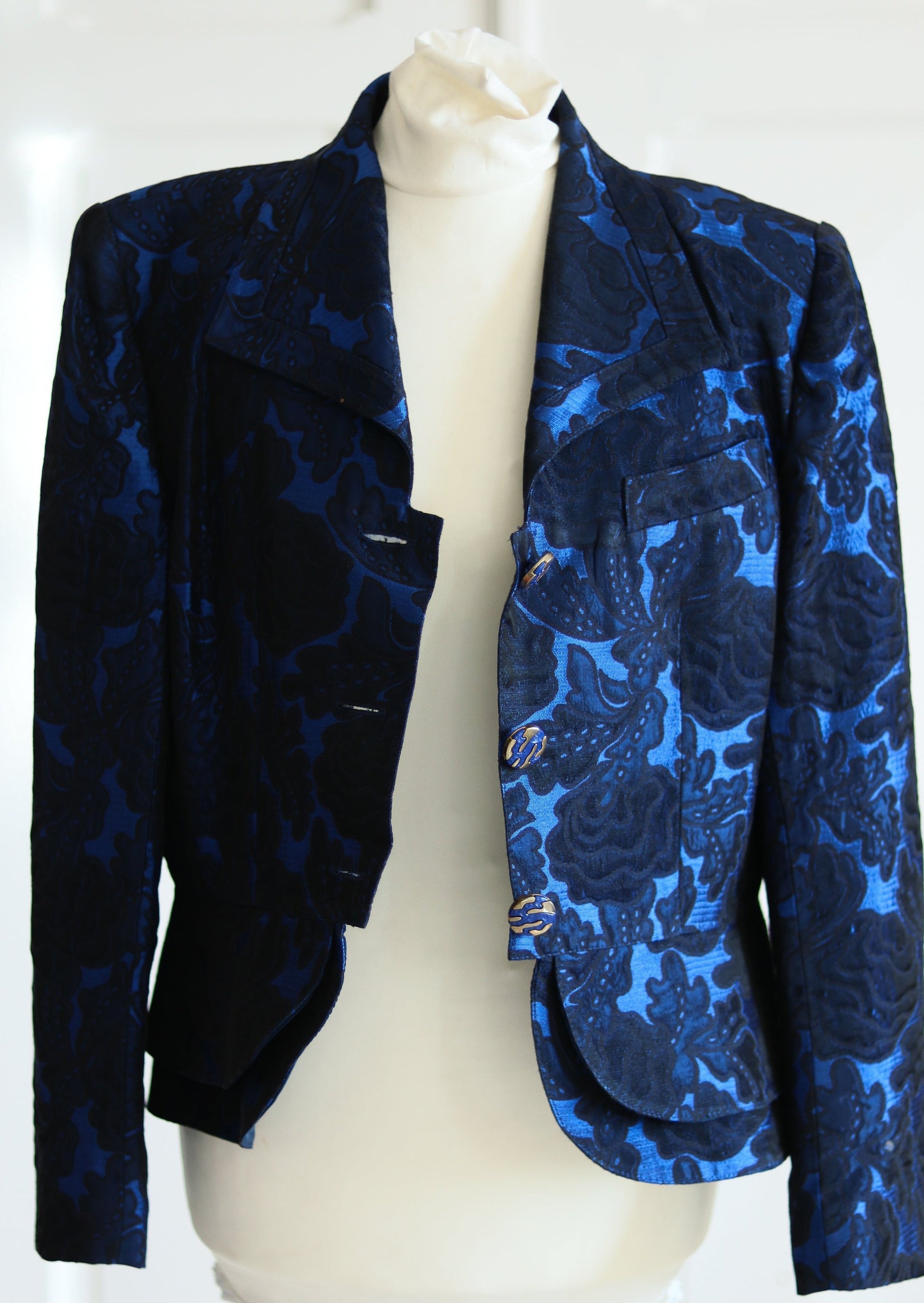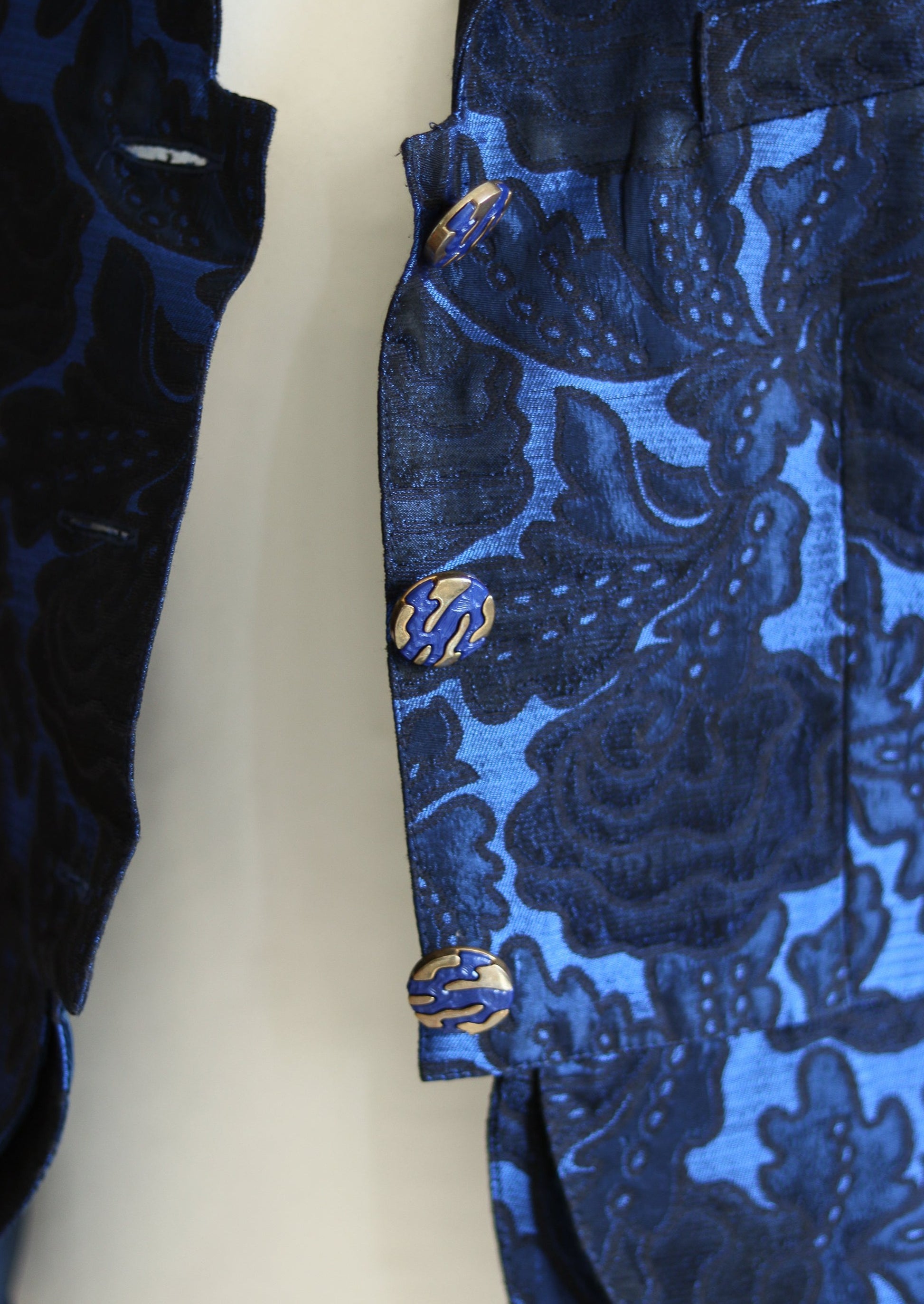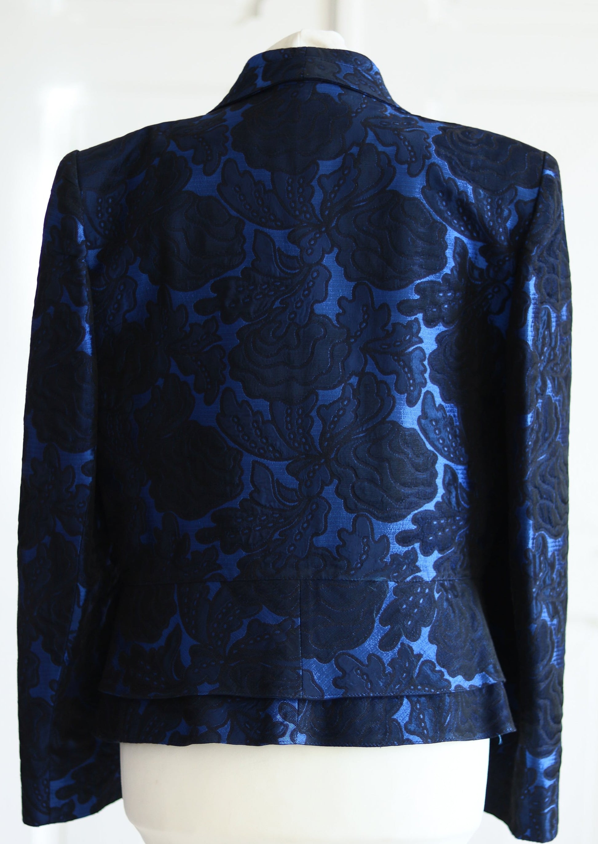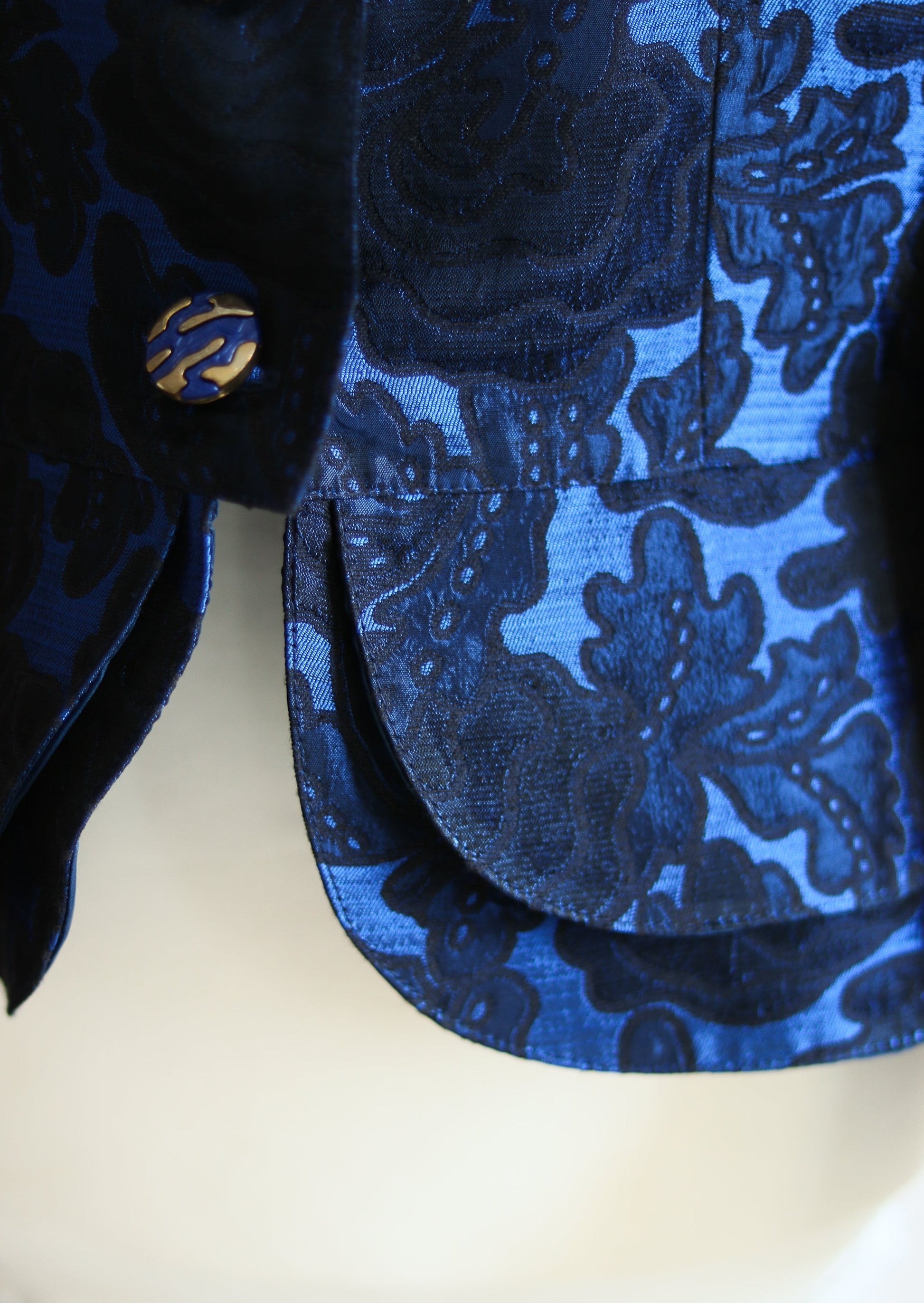 Transport yourself back to the 1980s with this outfit, made in France from Franck & Fils' sumptuous electric blue jacquard. The high-waisted skirt and straight cut add a touch of timeless elegance.