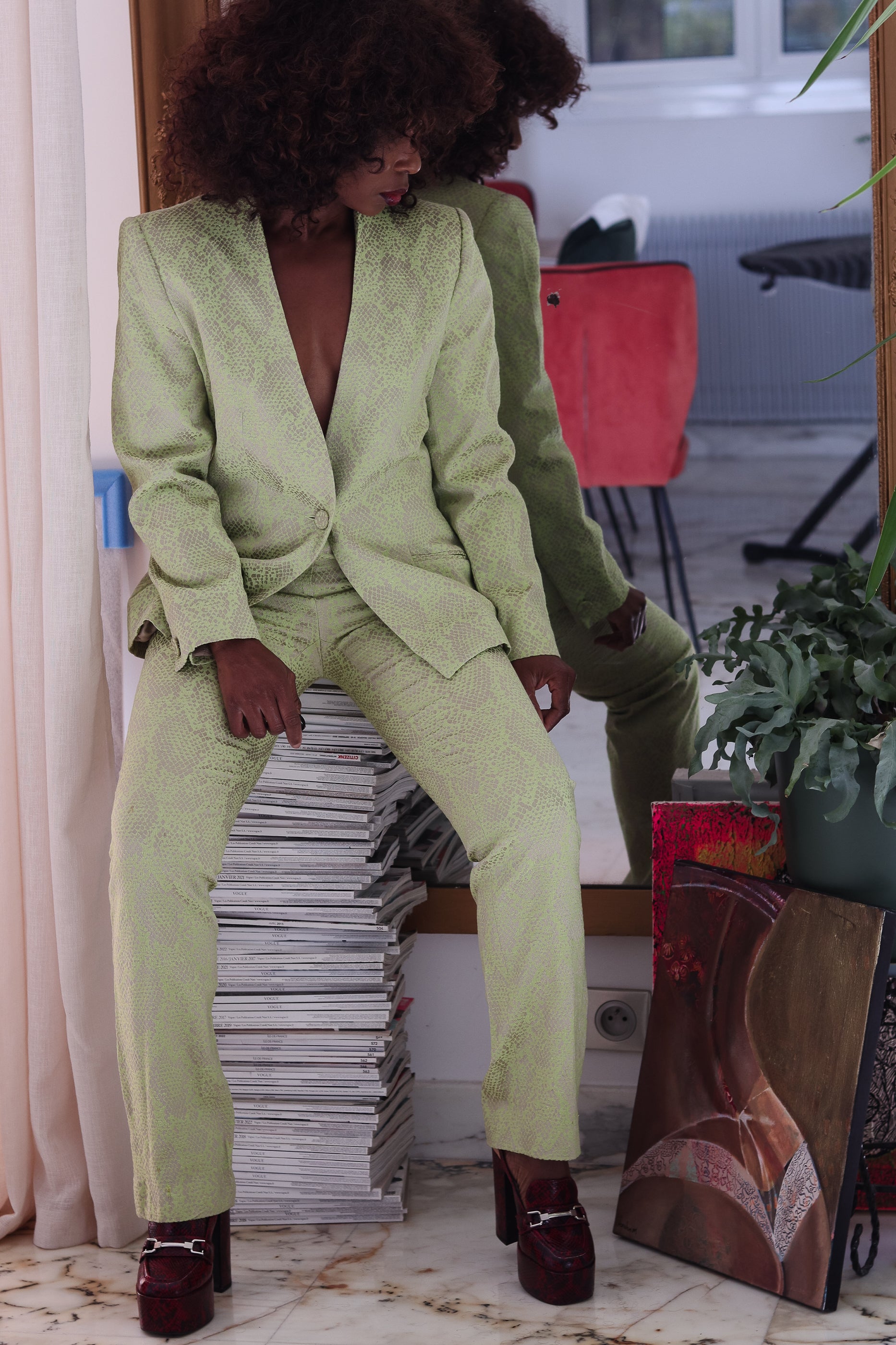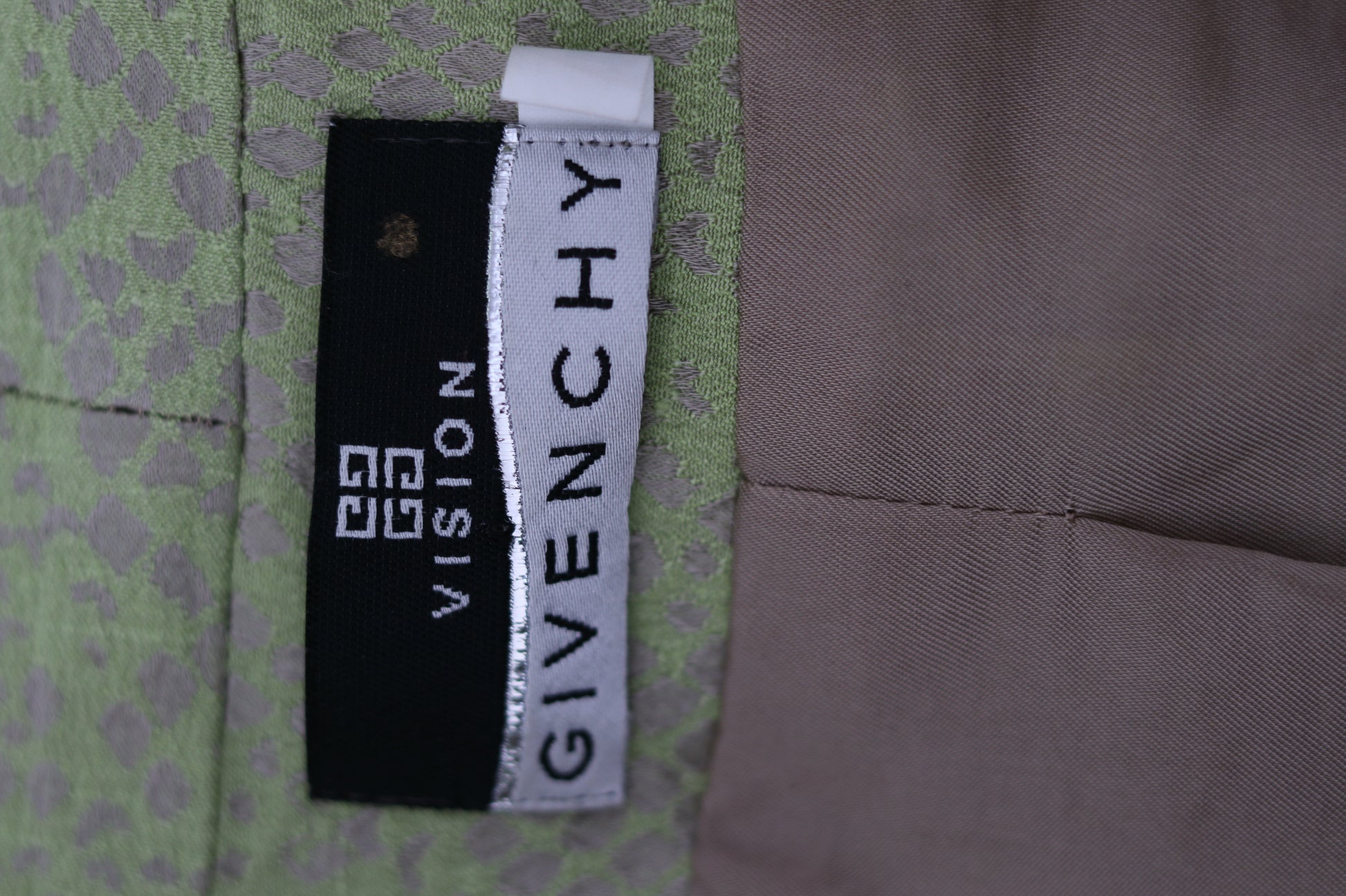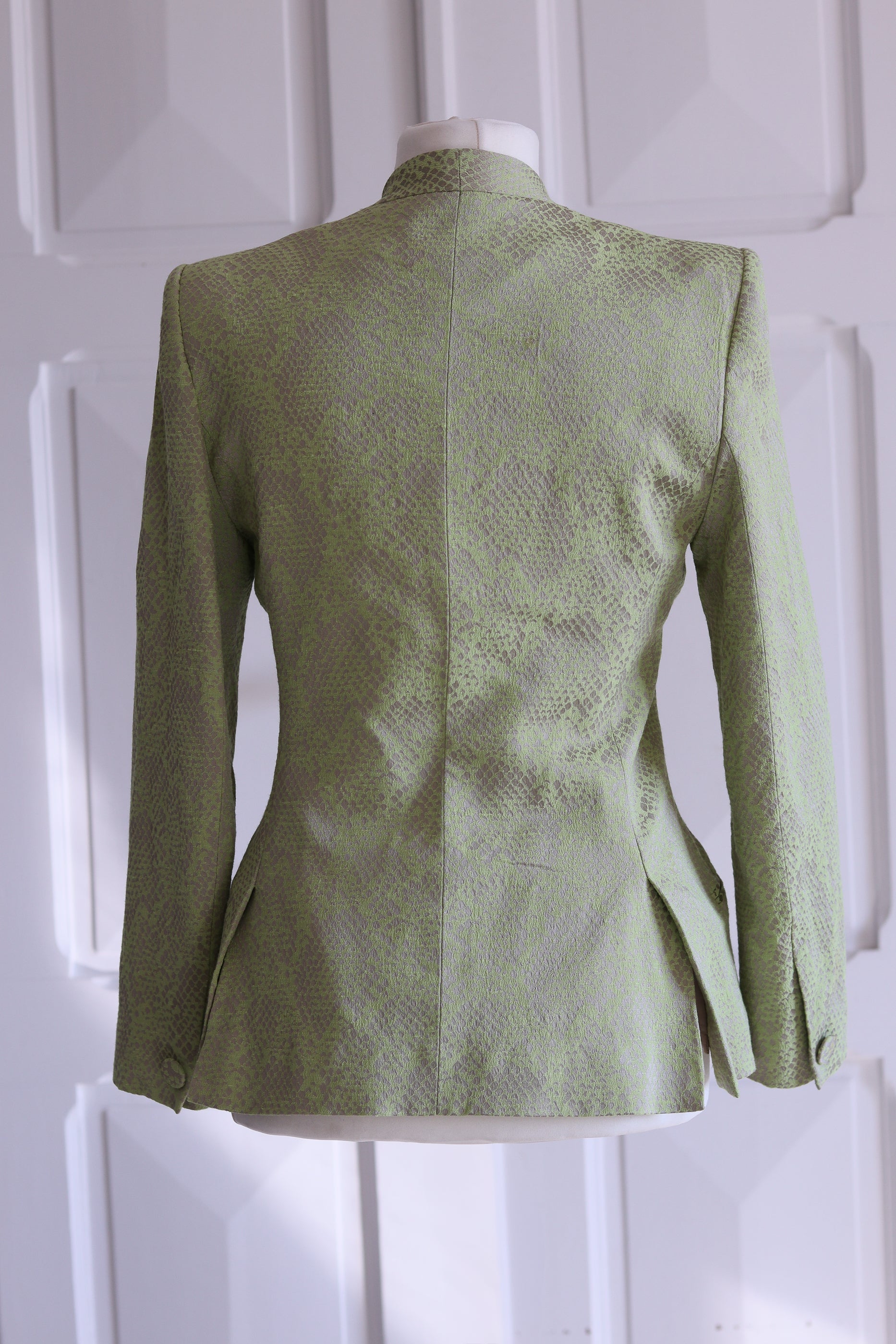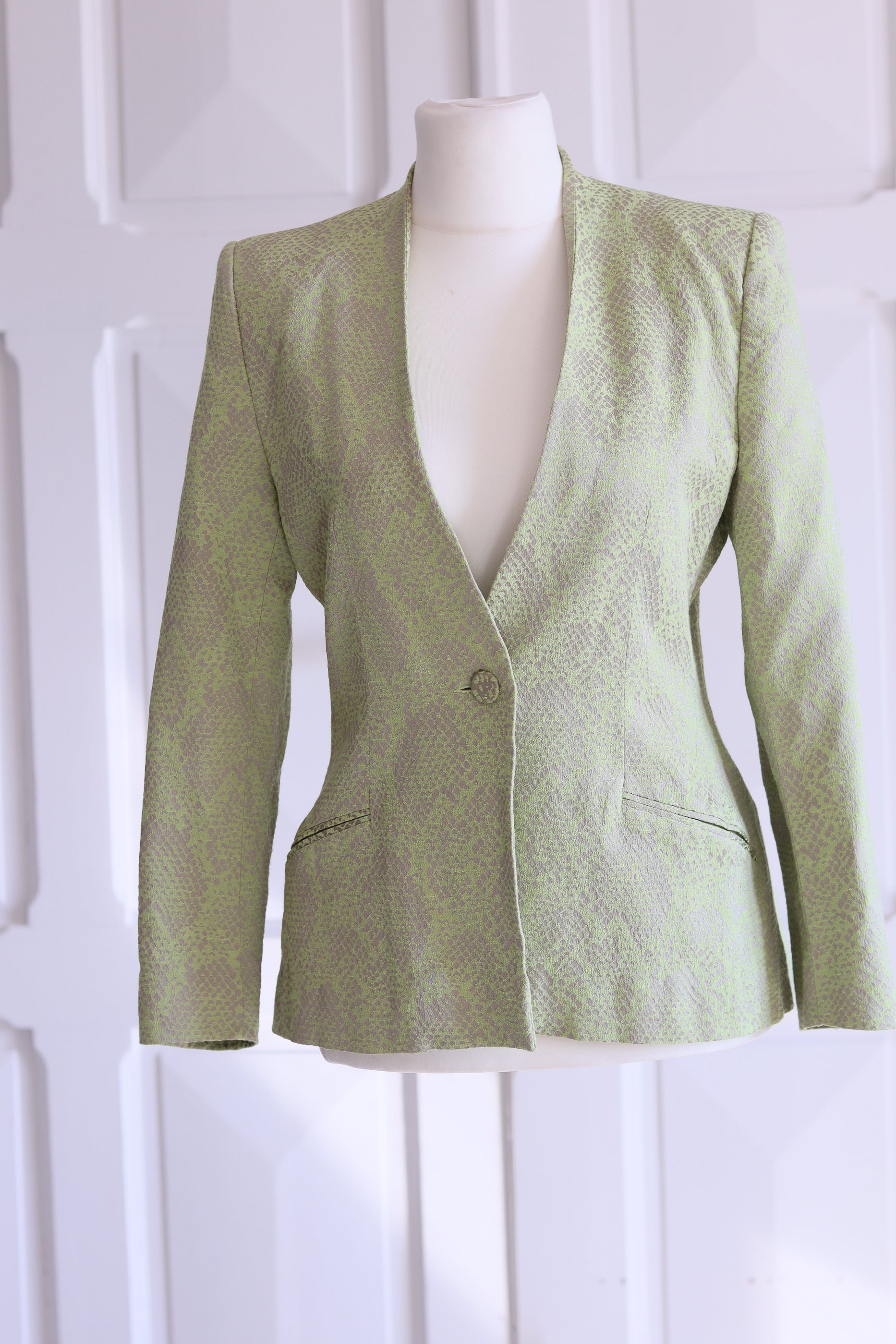 Rare tailleur pantalon, vintage signée Givenchy Vision de fabrication française, au style audacieux et raffiné. Sa coupe cintrée met en valeur la silhouette avec une fermeture par un unique bouton recouvert. Le tissu un peu extensible composé de 43 % d'acétate, 55 % de viscose et de 2 % d'élasthanne, présente un superbe motif jacquard façon python, dans des tons vert clair et taupe, apportant un jeu de textures subtil et élégant. Belle pièce vintage datant des années fin 1980. Pantalon maxi taille haute et veste cintrée