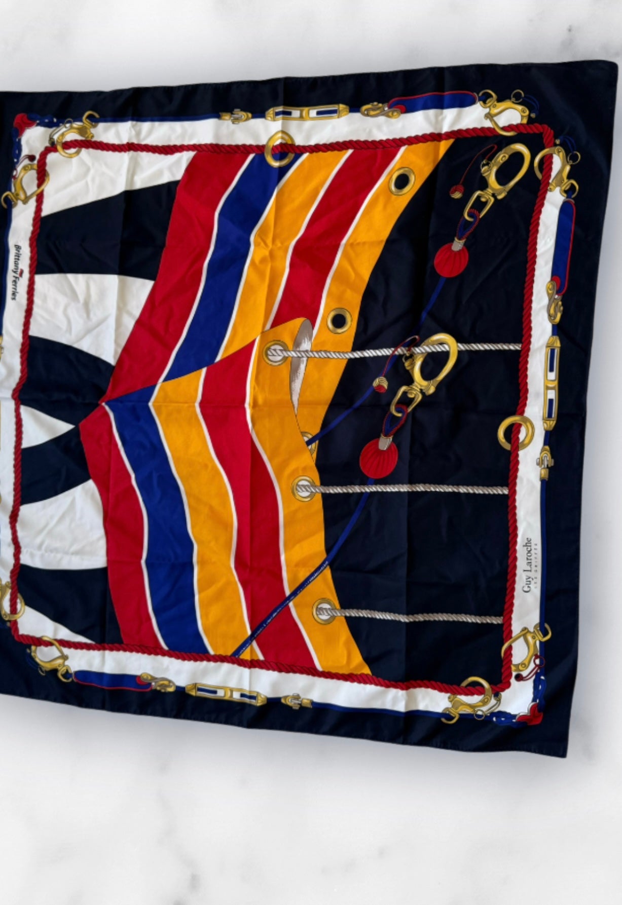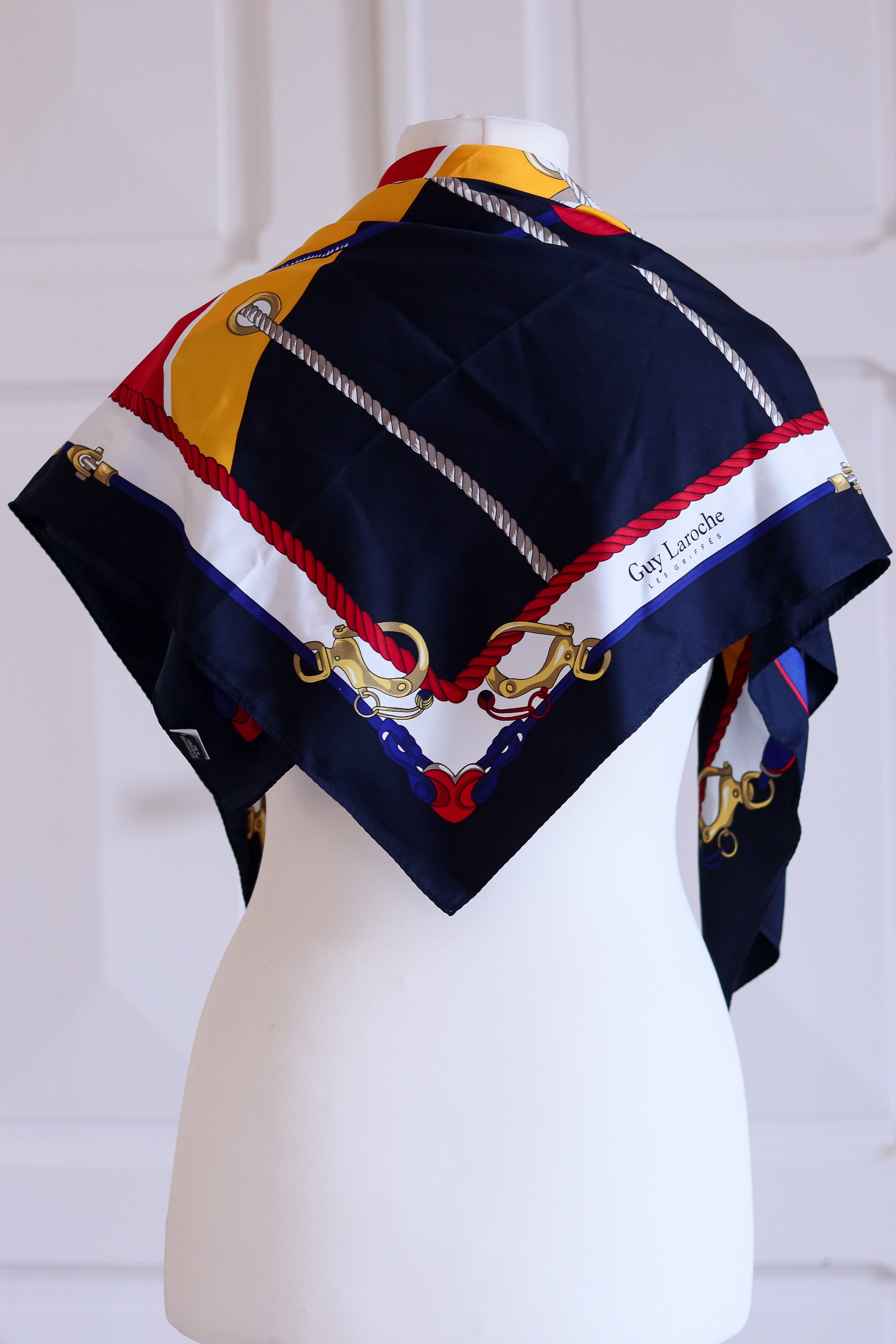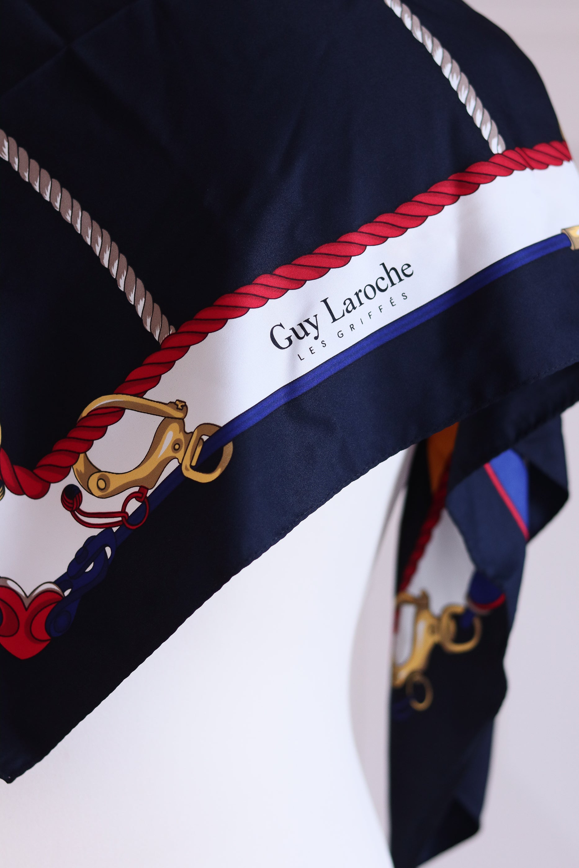 Signé Guy Laroche grand carré vintage datant des années 1980. Tissu doux en polyester à motifs marins
