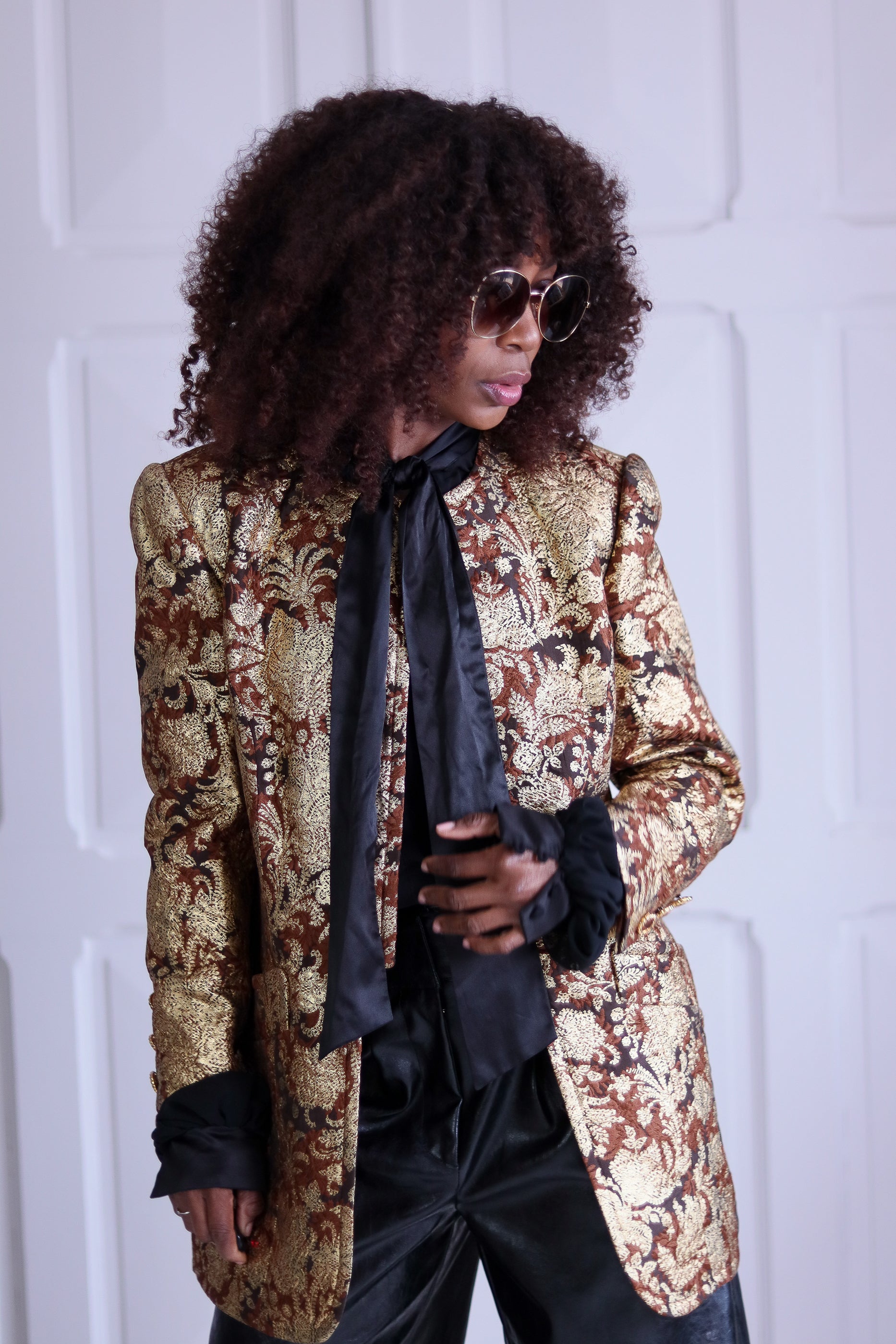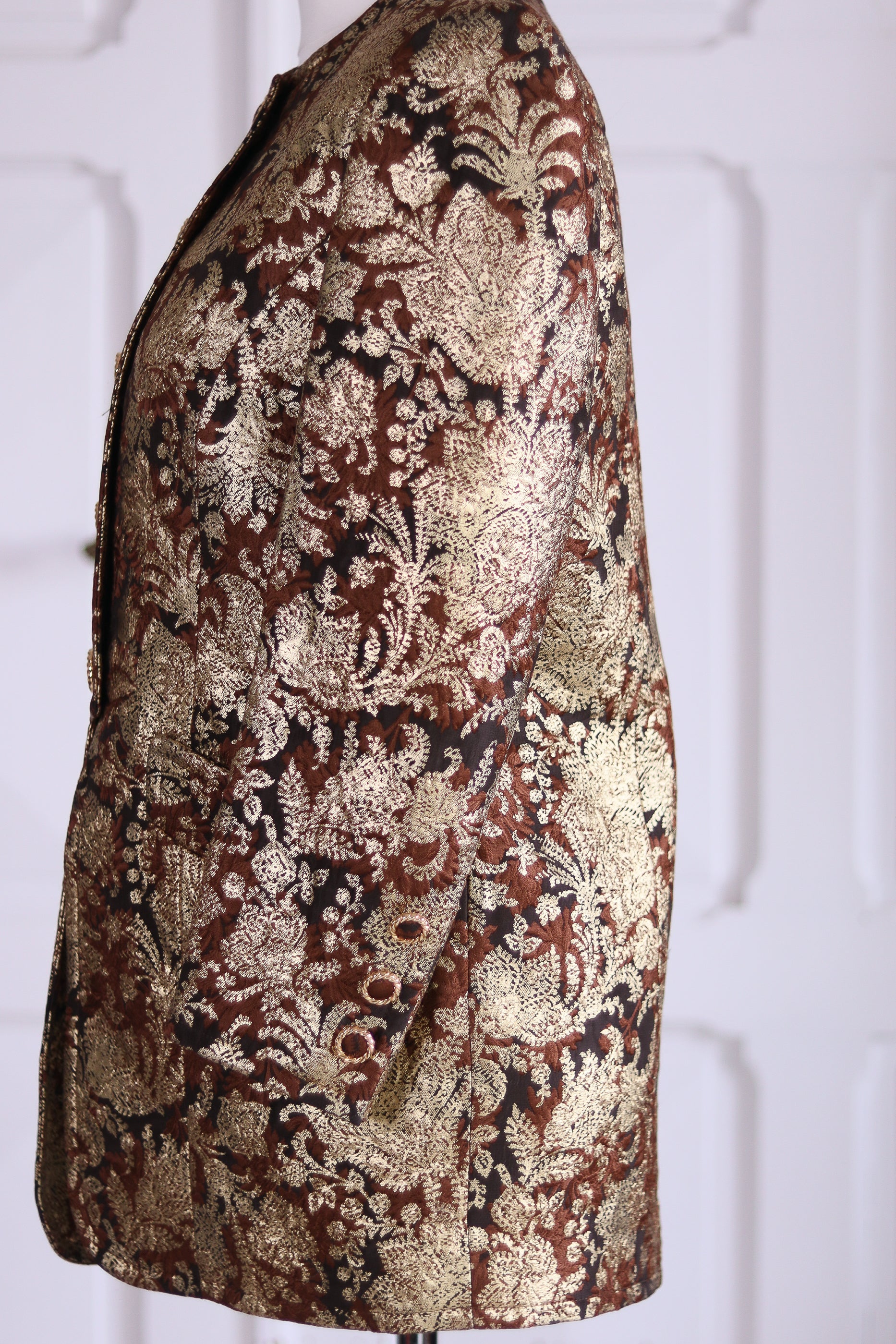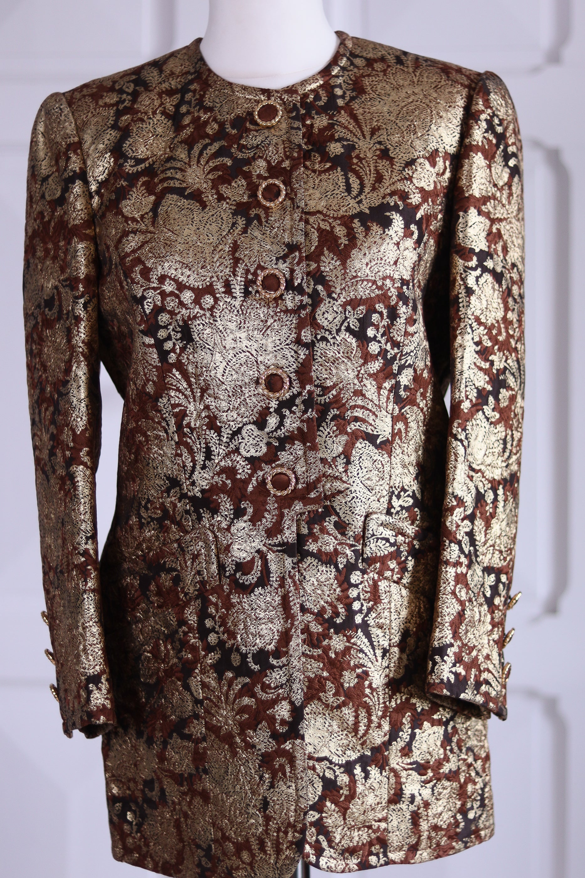 Une pièce spectaculaire signée Hannezo Paris, symbole du glamour et du raffinement des années 1980. Cette veste longue en brocart doré et brun chocolat évoque les silhouettes théâtrales de la mode parisienne, entre inspiration baroque et couture d’apparat. Les motifs floraux métallisés captent la lumière à chaque mouvement, tandis que la coupe structurée, les boutons bijou dorés, et la fabrication française assurent une allure noble et affirmée.