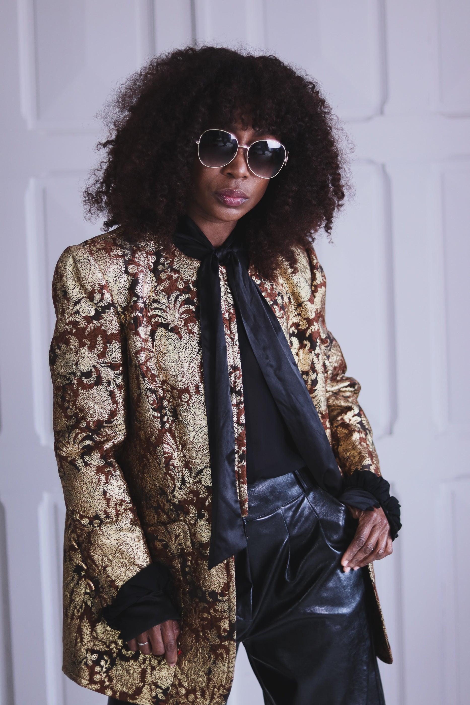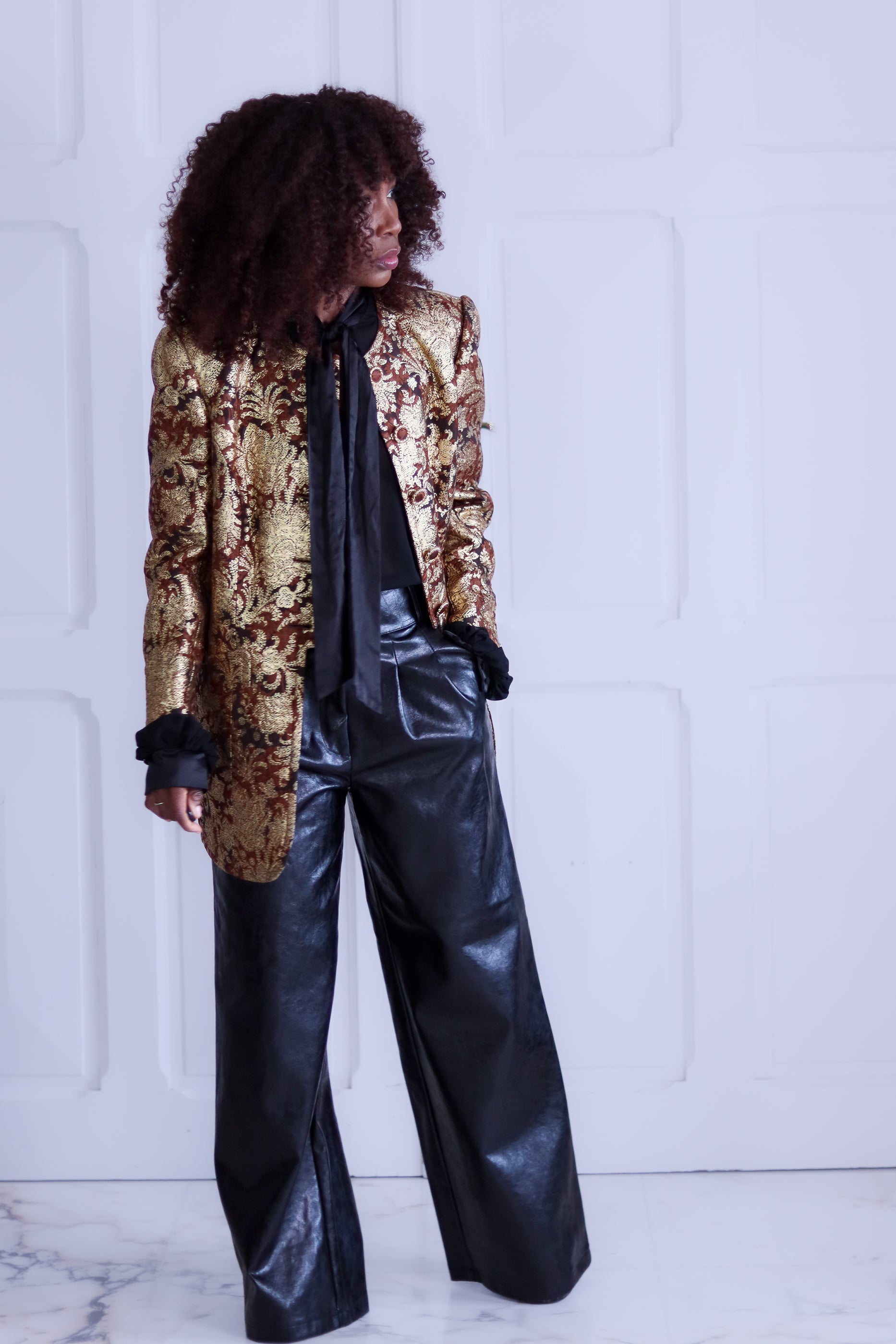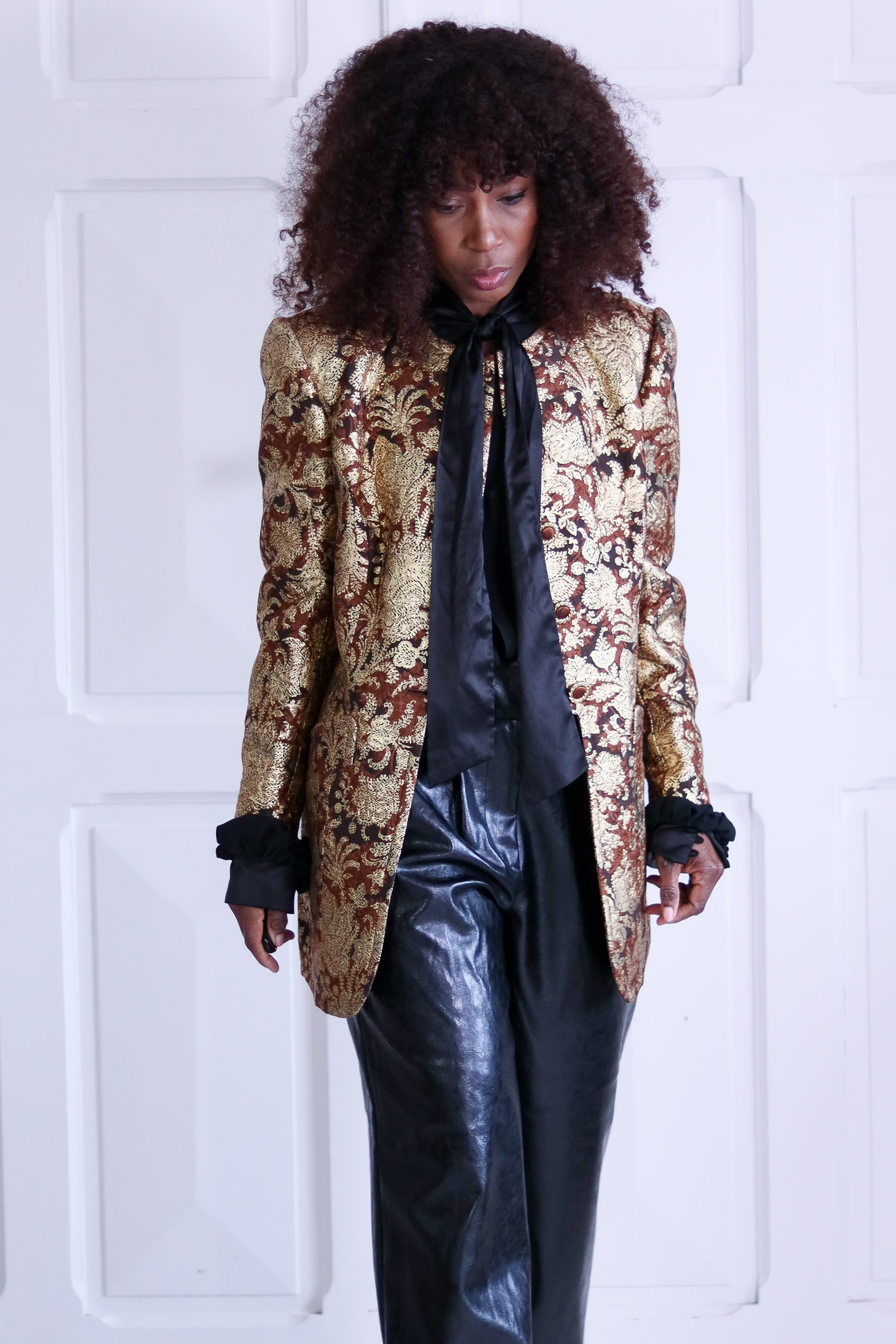 Une pièce spectaculaire signée Hannezo Paris, symbole du glamour et du raffinement des années 1980. Cette veste longue en brocart doré et brun chocolat évoque les silhouettes théâtrales de la mode parisienne, entre inspiration baroque et couture d’apparat. Les motifs floraux métallisés captent la lumière à chaque mouvement, tandis que la coupe structurée, les boutons bijou dorés, et la fabrication française assurent une allure noble et affirmée.
