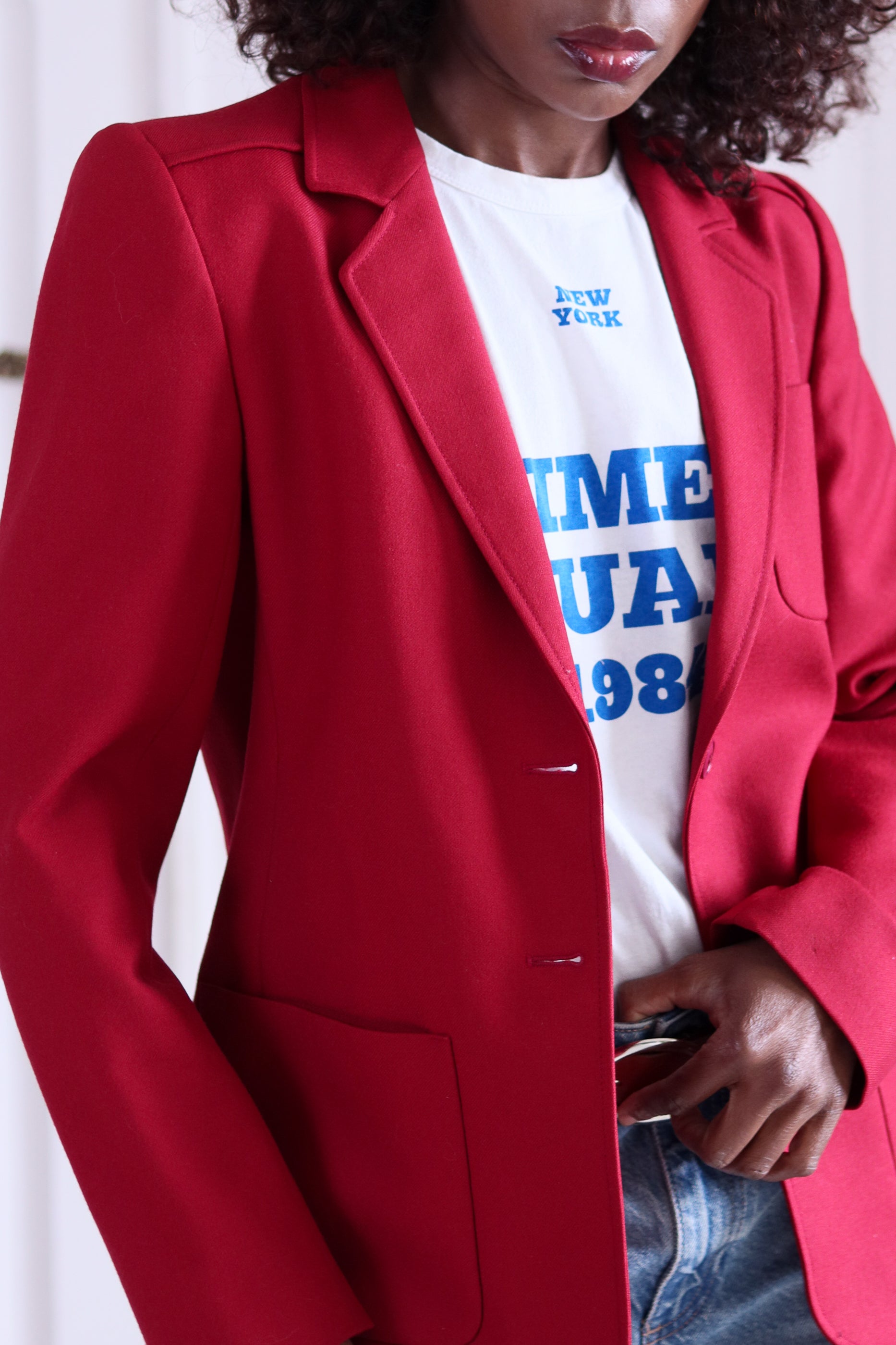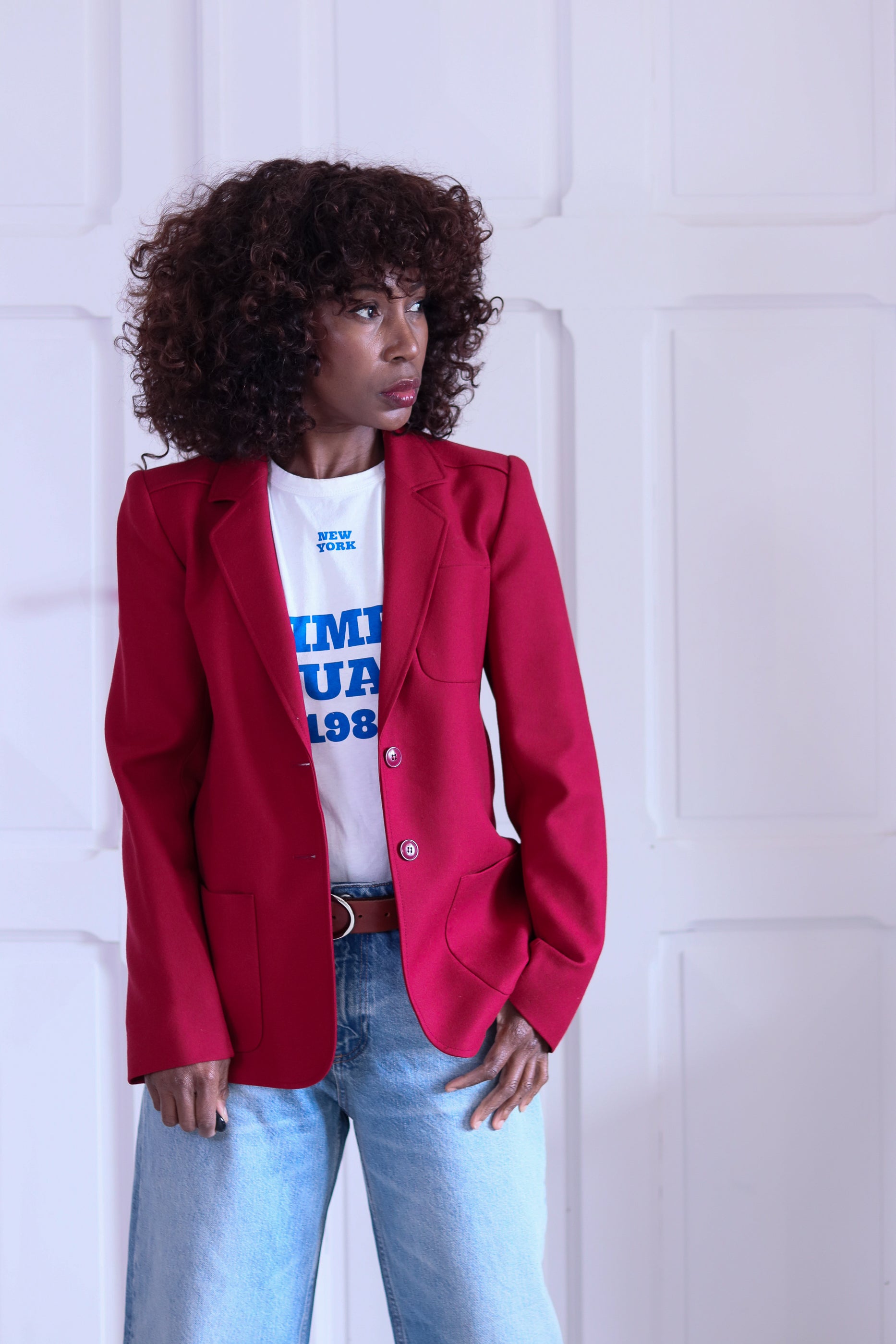 Blazer vintage datant des années fin 1970, création Jean Bailly et de fabrication, française de grande qualité en pure laine vierge. Sa coupe ajustée et ses finitions soignées en font une pièce élégante et intemporelle. Fermeture par deux boutons ton sur ton, poches plaquées et petit revers classique pour une allure à la fois chic et moderne.