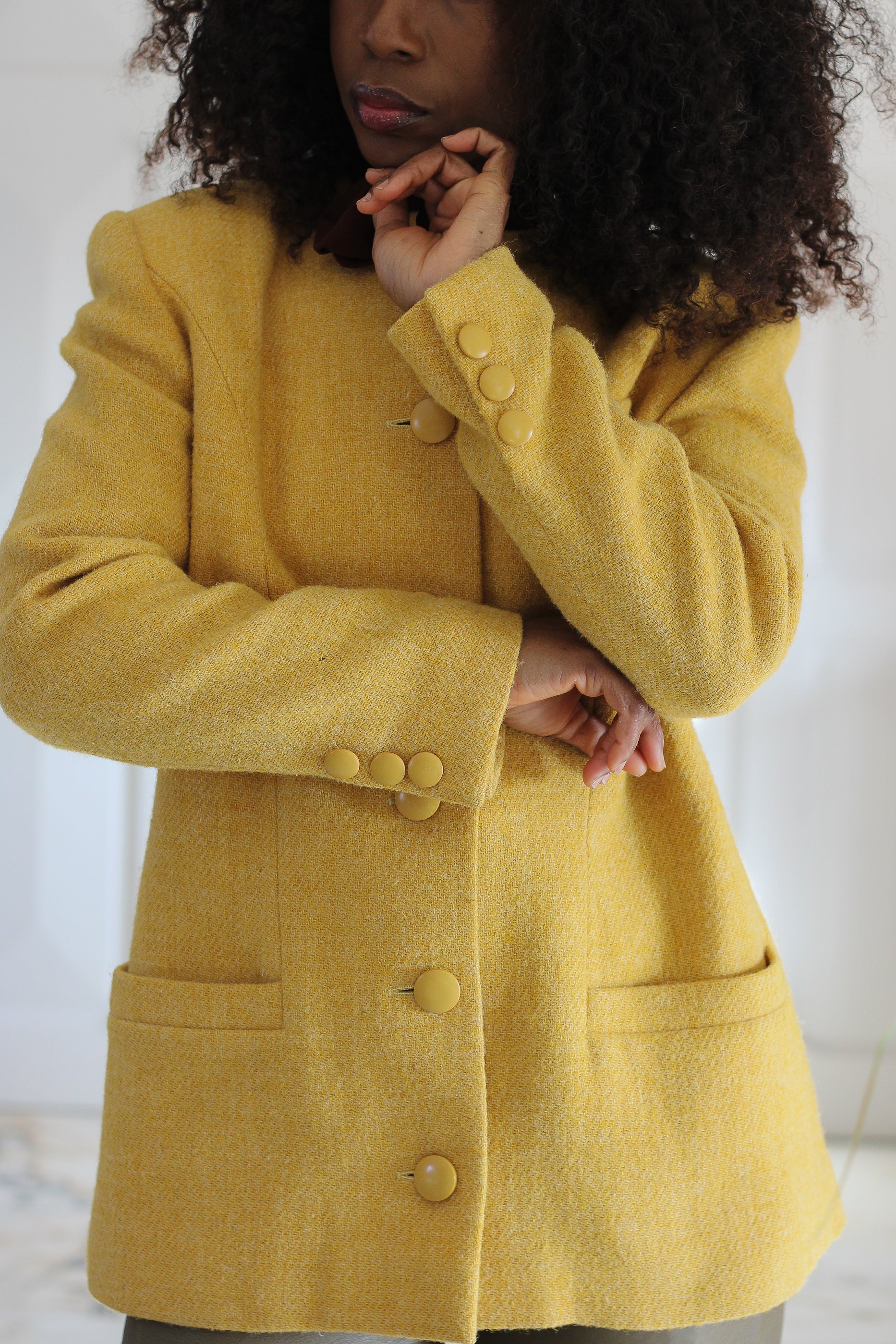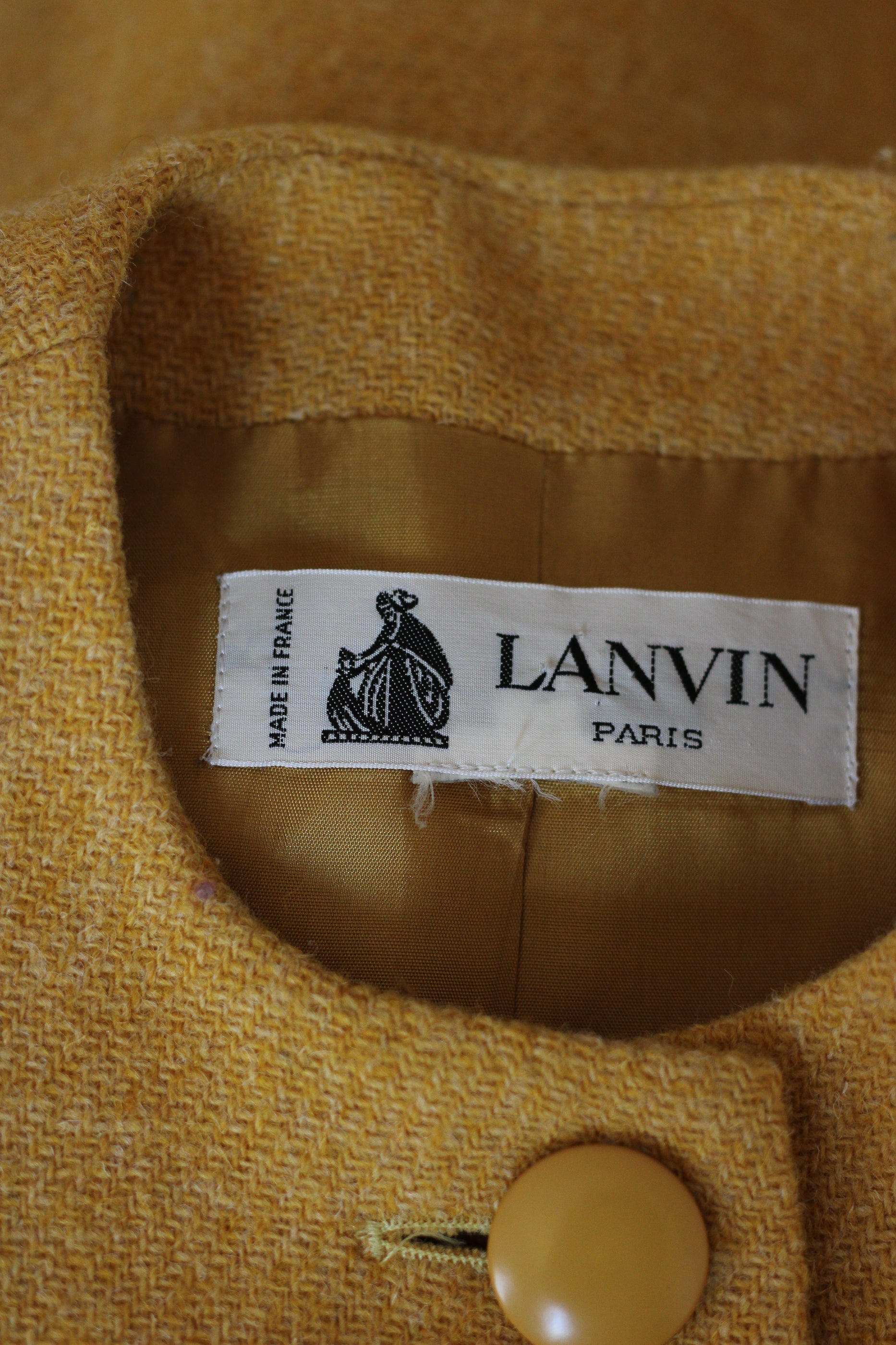 Veste vintage signée Lanvin Paris, confectionnée en France, datée fin des années 70, dans un élégant lainage jaune moutarde à la texture subtilement chinée. Coupe droite et structurée, rehaussée de boutons recouverts ton sur ton sur le devant ainsi qu’aux poignets, et poches plaquées pour une finition couture. Une pièce au style affirmé et intemporel, parfaite pour illuminer un dressing contemporain avec caractère et élégance