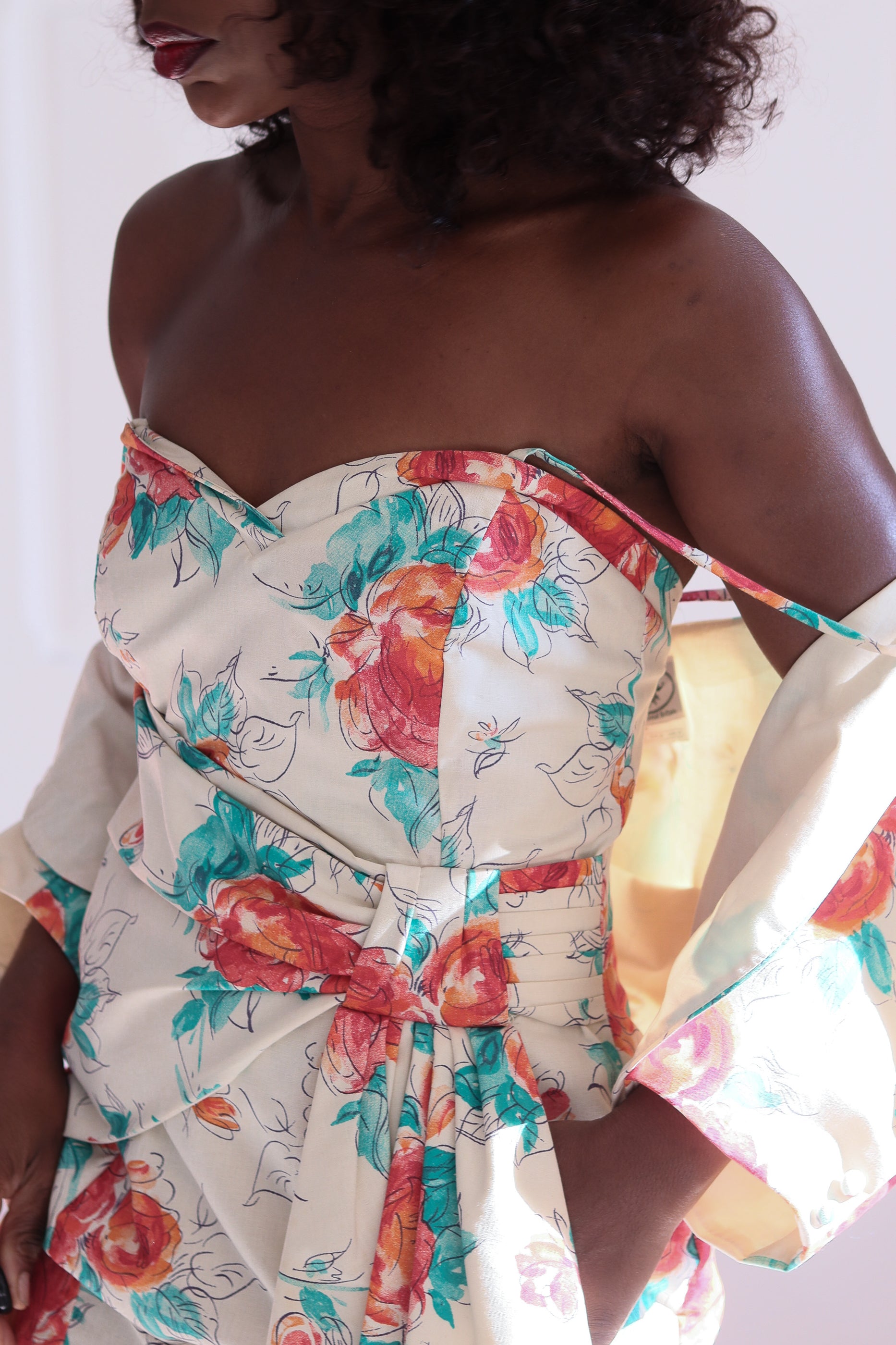 Ensemble deux pièces signé Laura Ashley, confectionné en Grande-Bretagne. Il se compose d’une robe bustier ajustée et d’une veste courte assortie. Le tissu en coton présente un grand imprimé floral aux tons éclatants. La veste structurée aux manches bouffantes apporte du volume, tandis que la robe bustier met en valeur la silhouette avec une coupe près du corps et un drapé noué sur la hanche. Robe vintage datant des années fin 1970