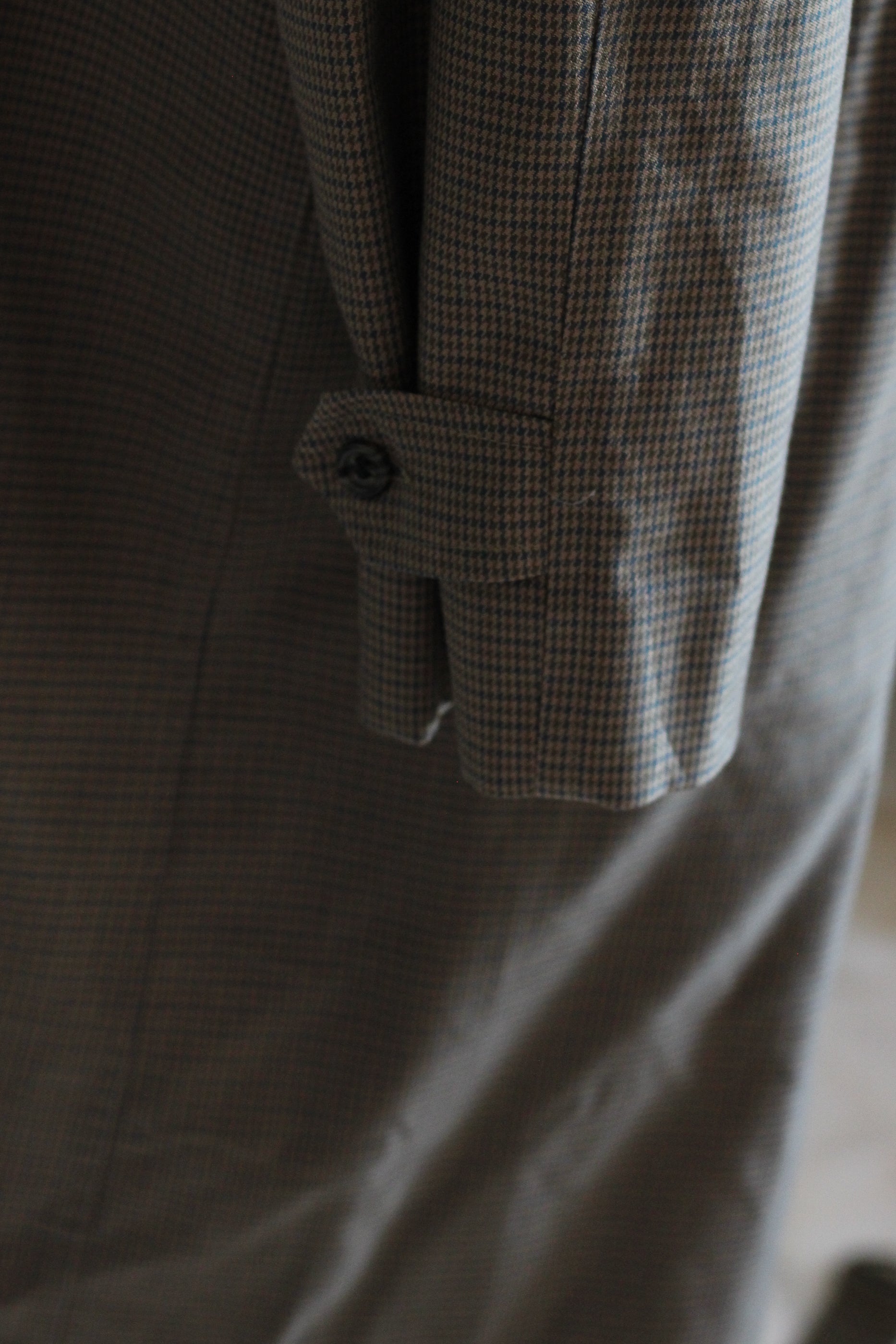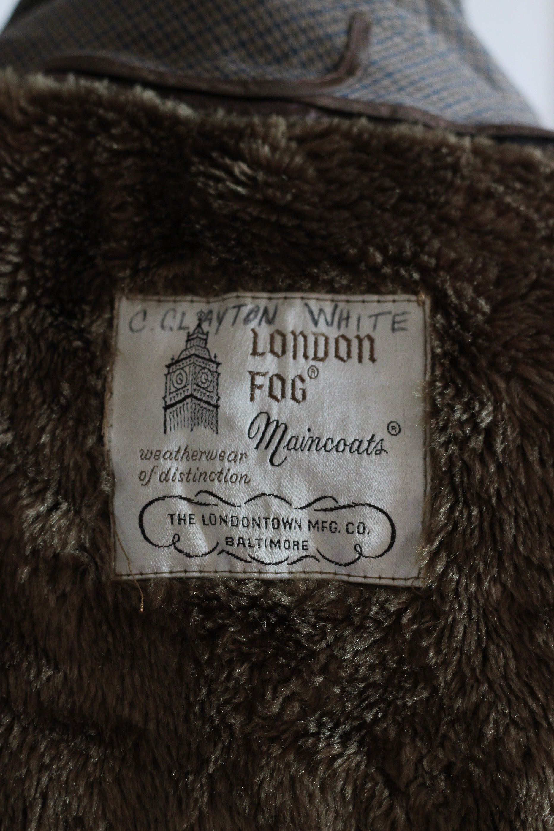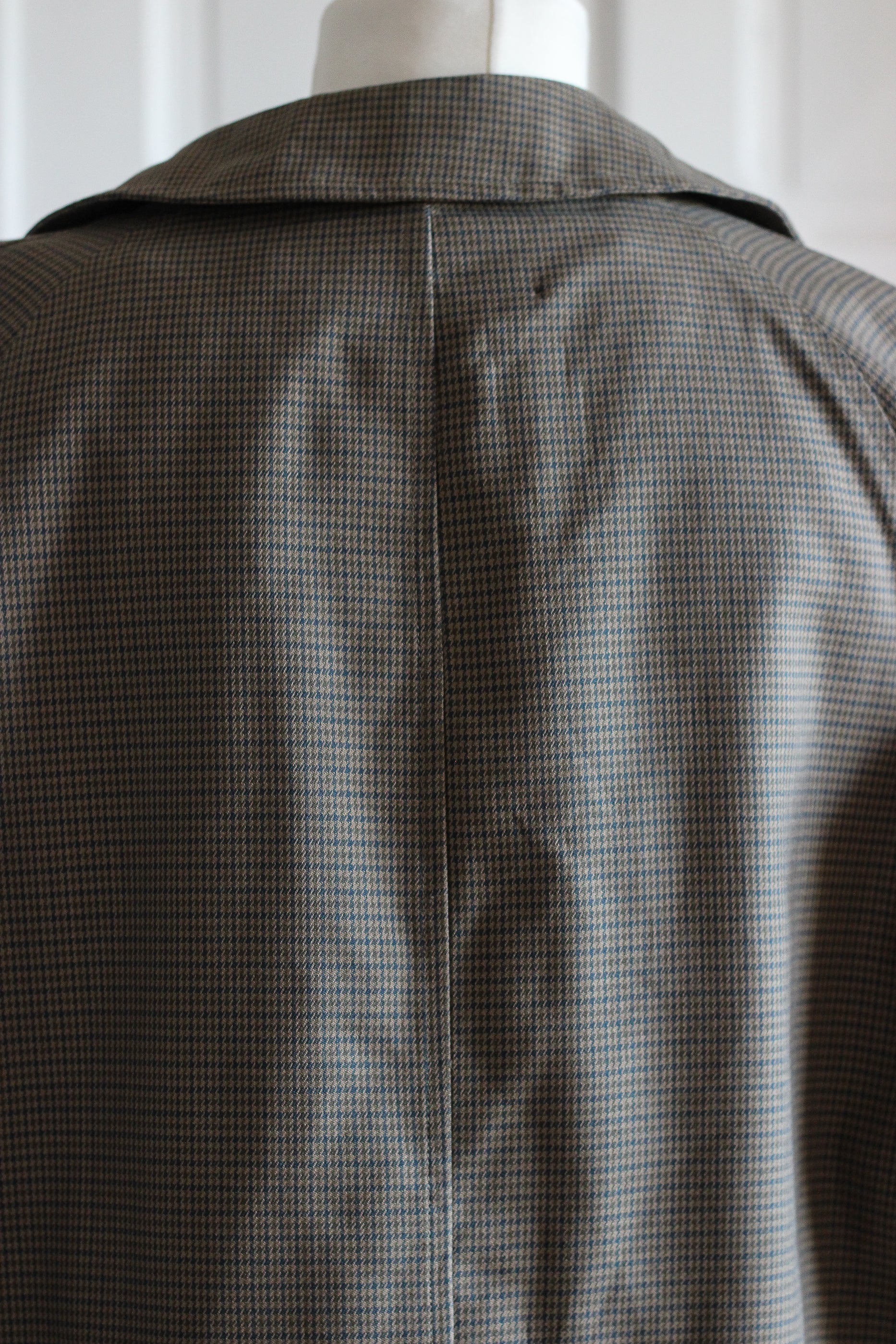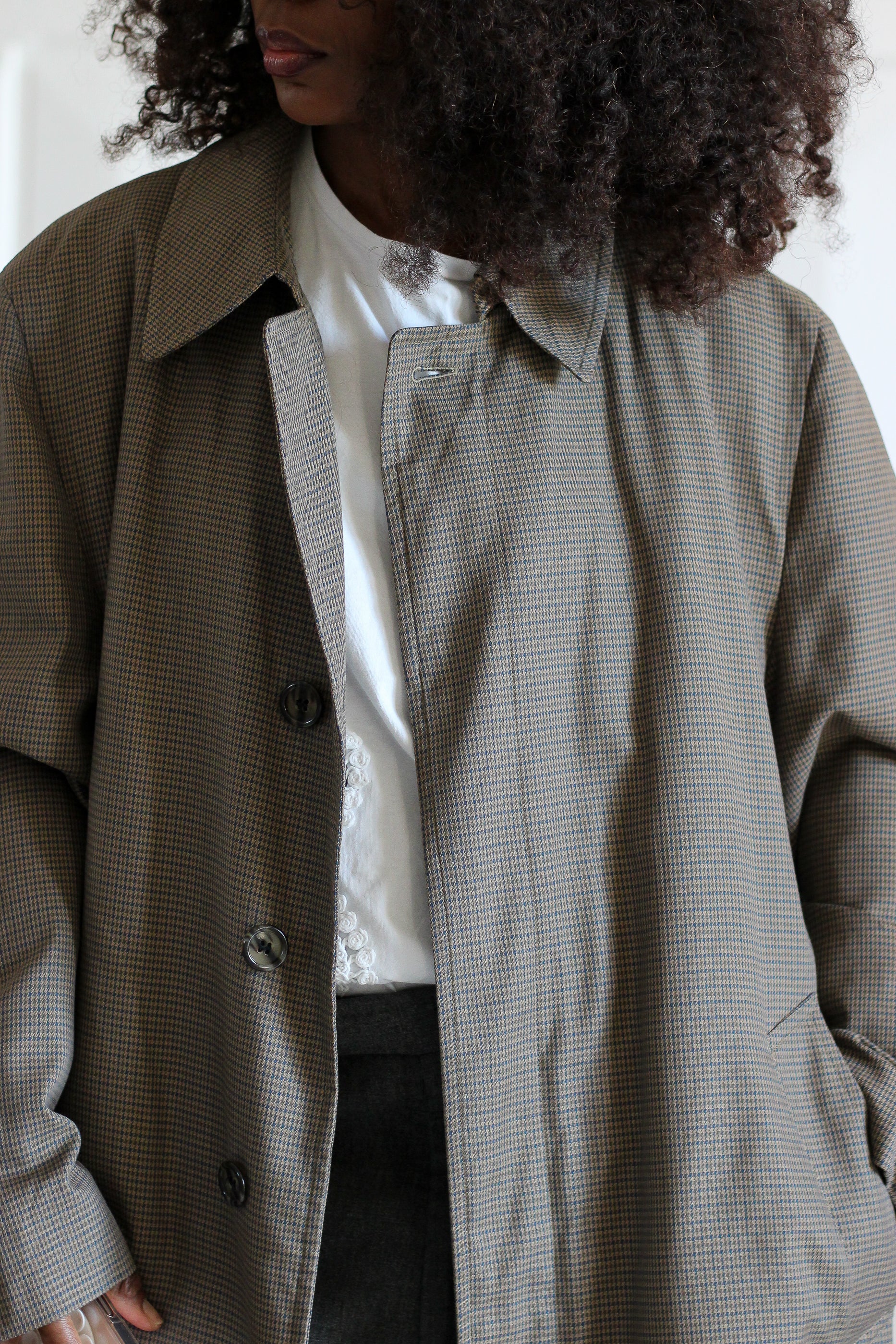 Authentique manteau vintage London Fog, datant des années fin 1970, dans un élégant motif pied-de-poule aux tons beige, brun et bleu-gris. Une pièce iconique du tailoring anglo-américain, pensée pour durer.