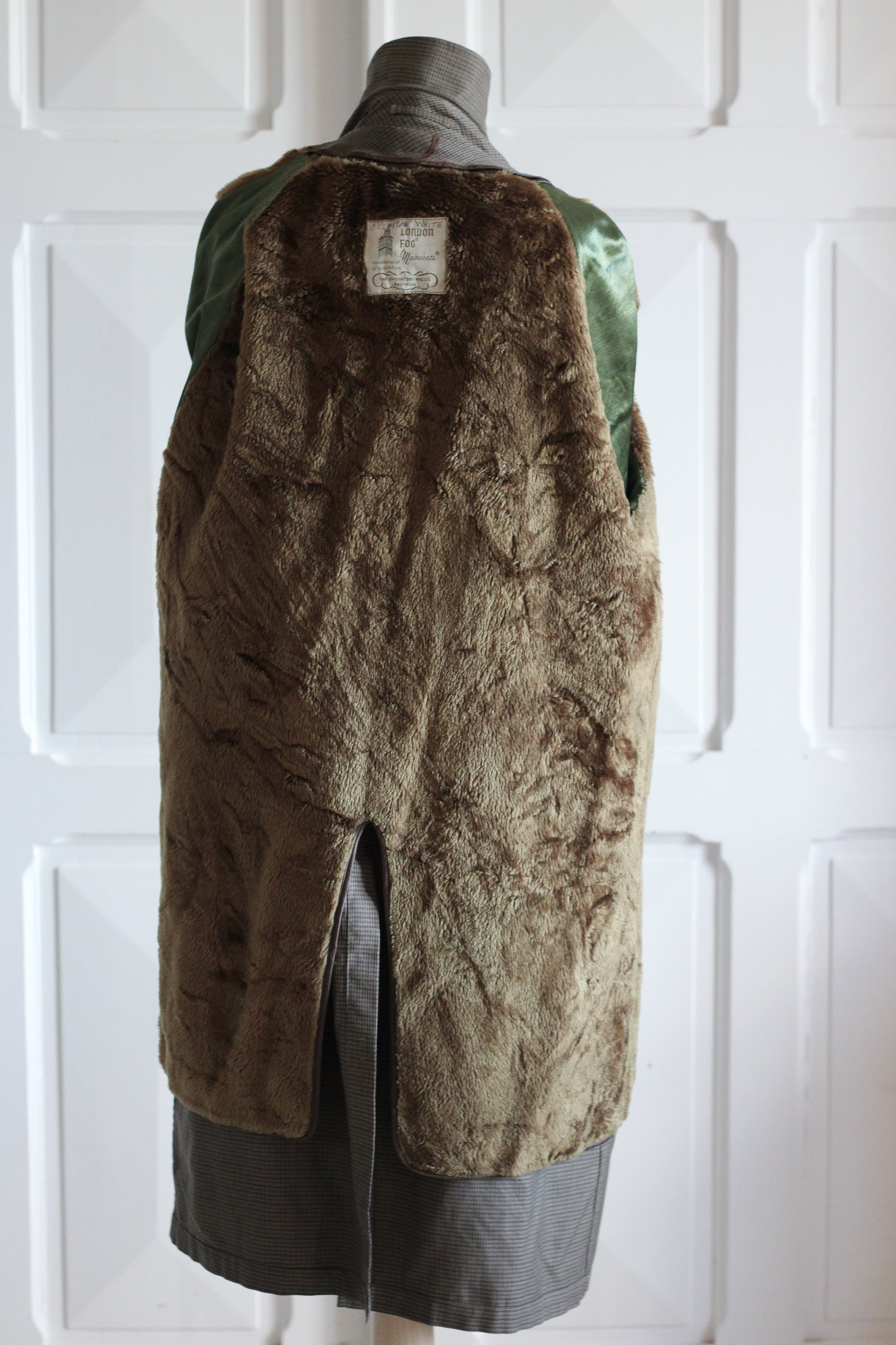 La coupe est droite et ample, typique des manteaux d’époque, avec un col classique et une belle longueur. L’intérieur, on retrouve une doublure amovible façon fausse fourrure, qui permet de porter le manteau aussi bien en mi-saison qu’en plein hiver
