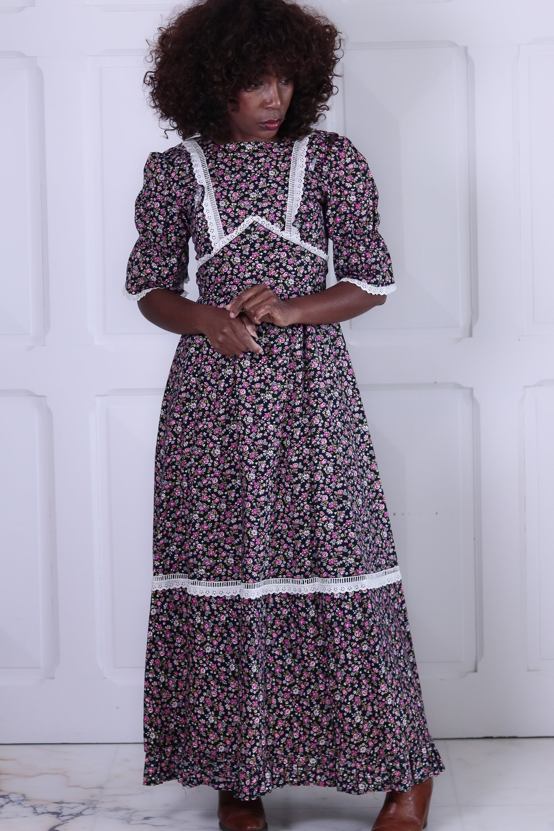 Longue vintage à l’imprimé fleuri. Son design romantique est souligné par des empiècements de dentelle blanche au niveau du buste, des manches et de la jupe. Manches trois-quarts légèrement bouffantes, taille marquée et bas évasé pour une allure féminine et bohème.