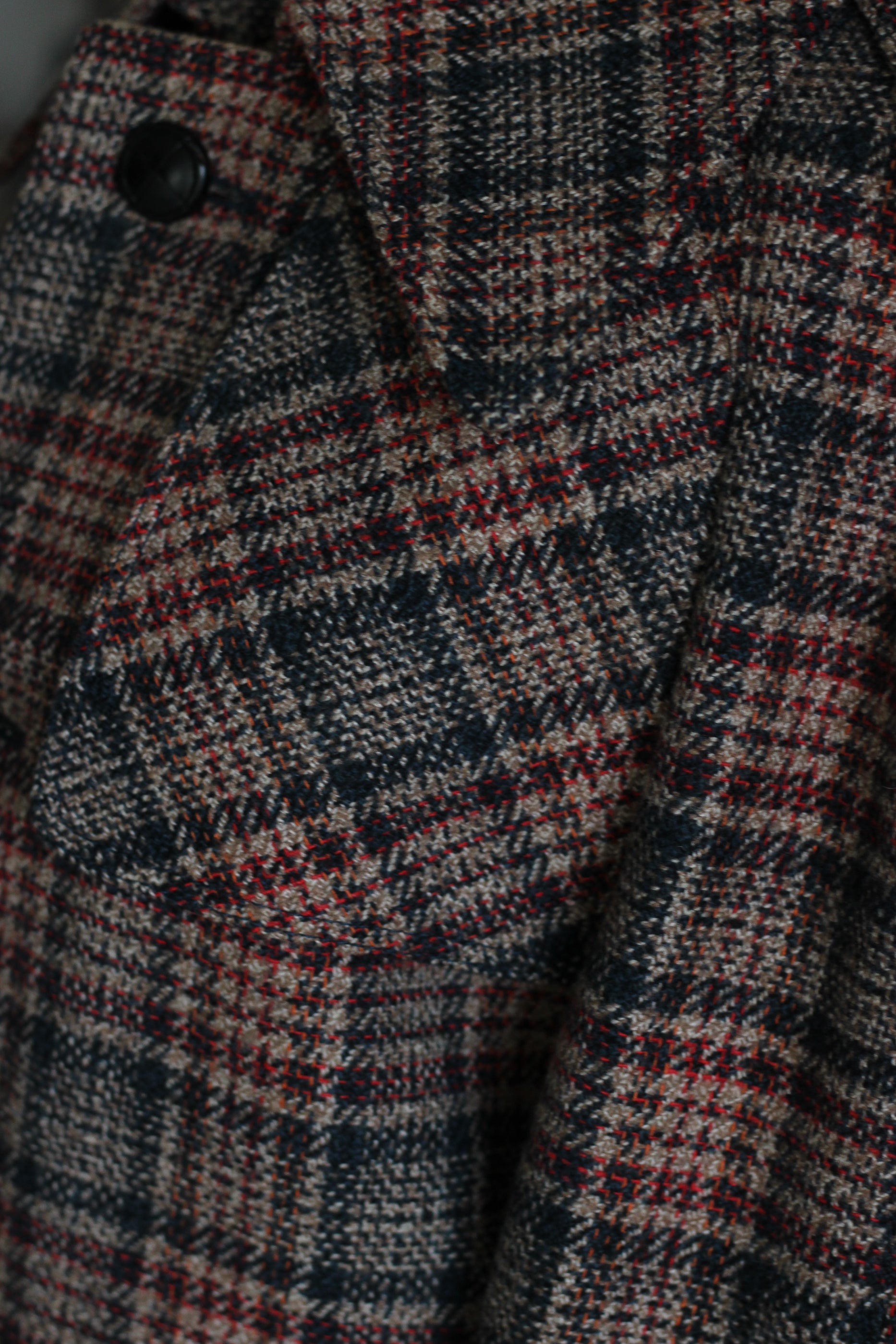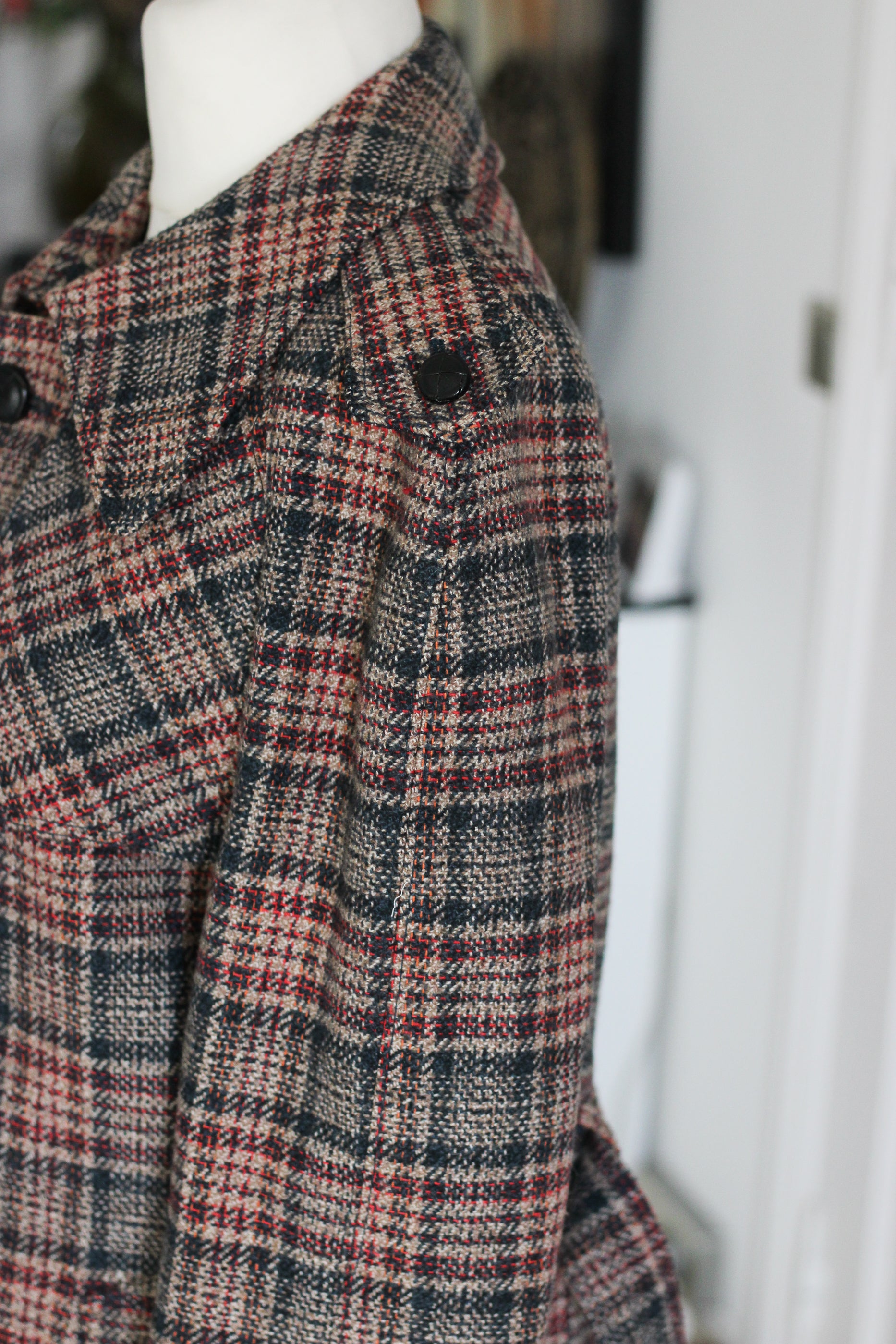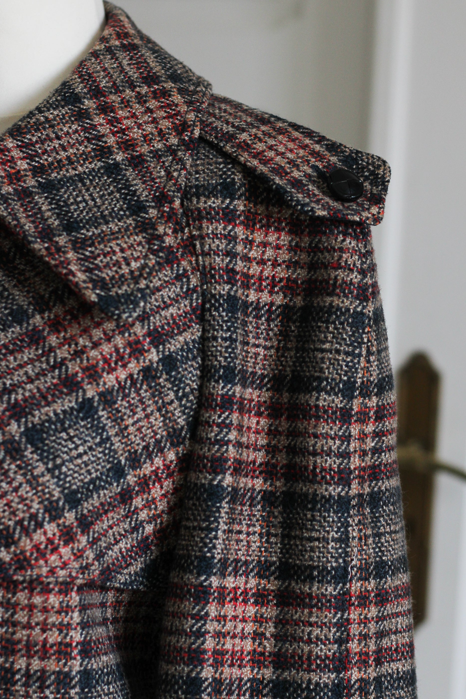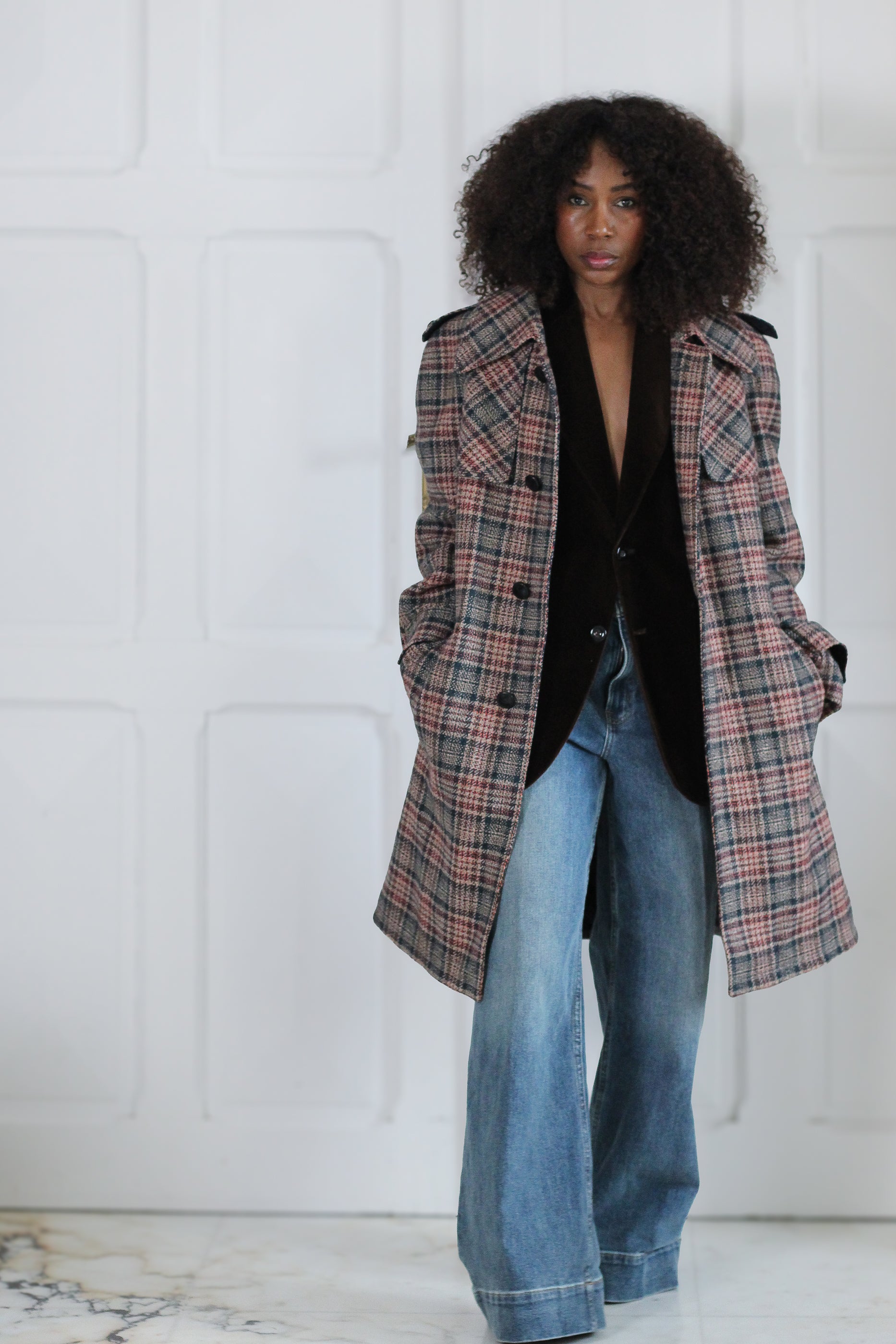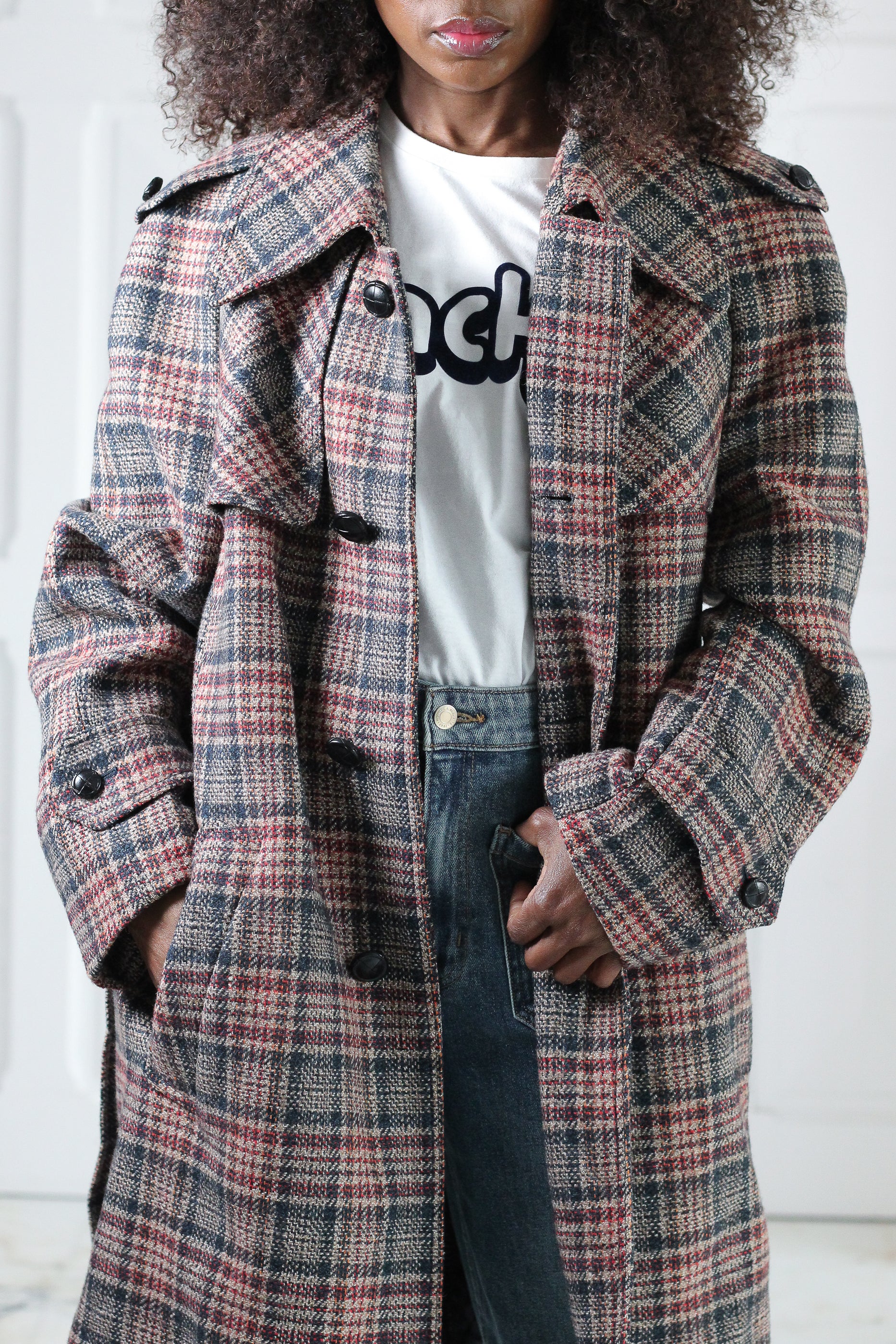 Manteau vintage à la coupe droite et structurée, en tissu à carreaux dans des tons sobres et élégants. Modèle ceinturé avec épaulettes et boutonnage classique, fidèle aux codes du trench revisité version laine. Tissu composé de 55 % polyester et 45 % laine et la doublure en 100 % viscose, offrant une belle tenue, de la chaleur et un tombé structuré. Une pièce facile à porter au quotidien, entre style vintage et allure intemporelle.