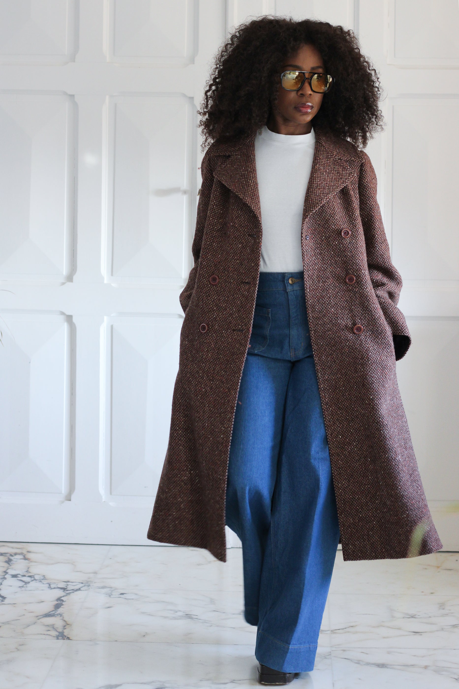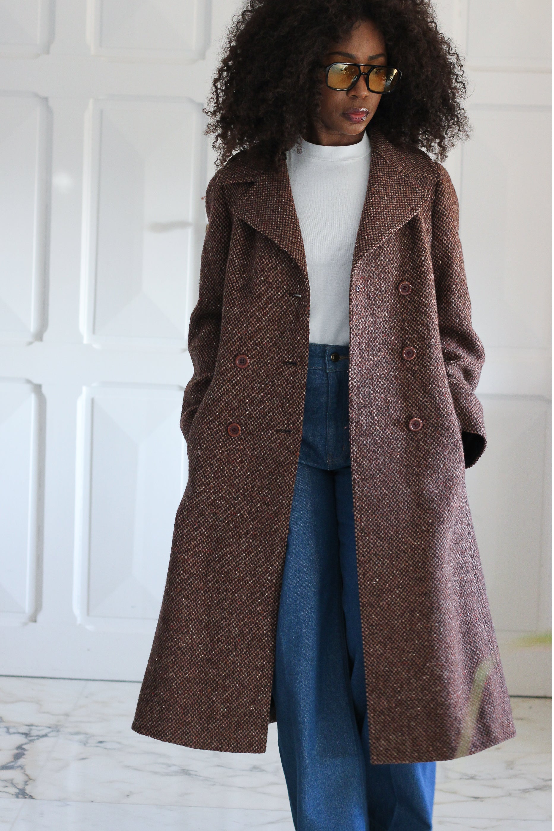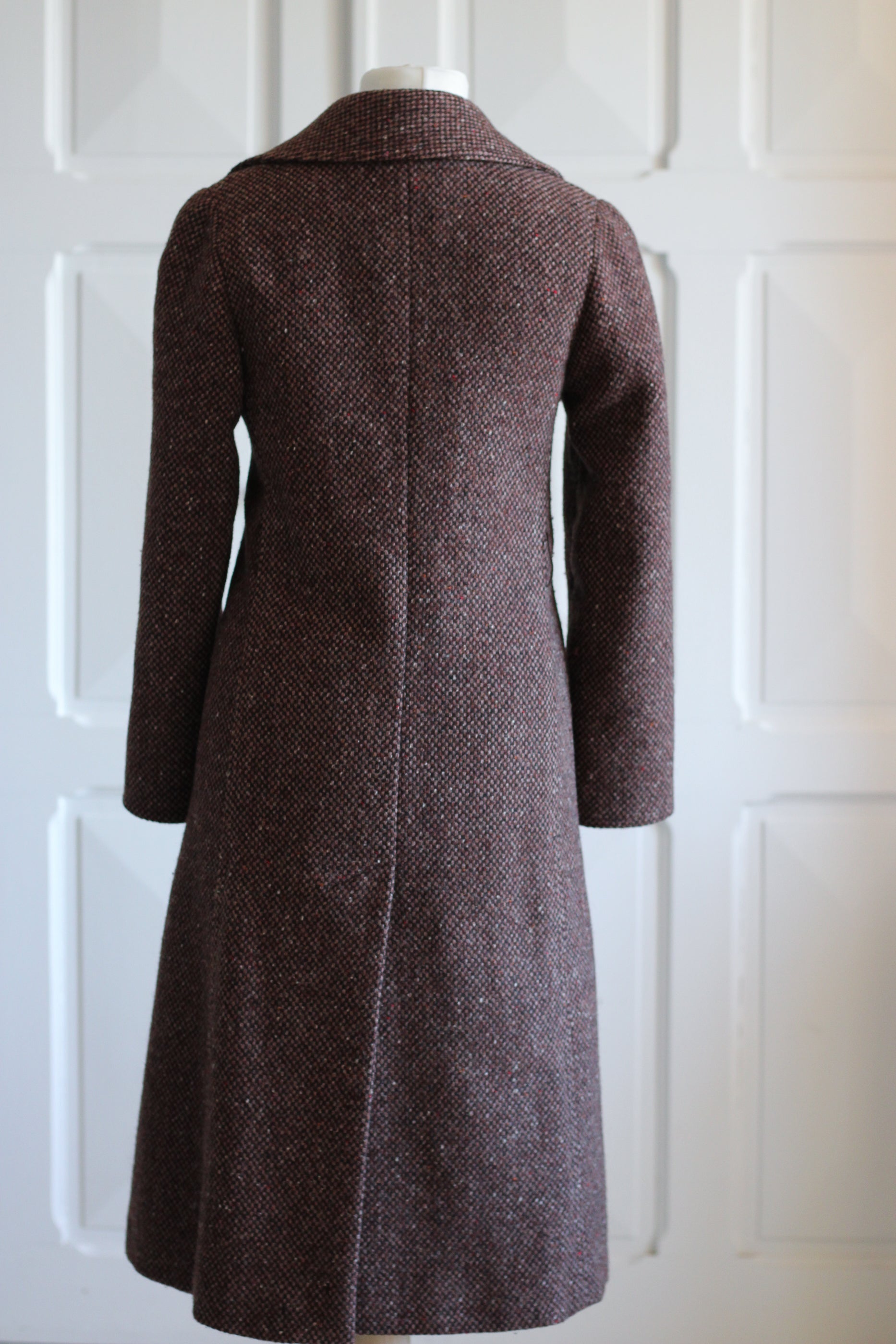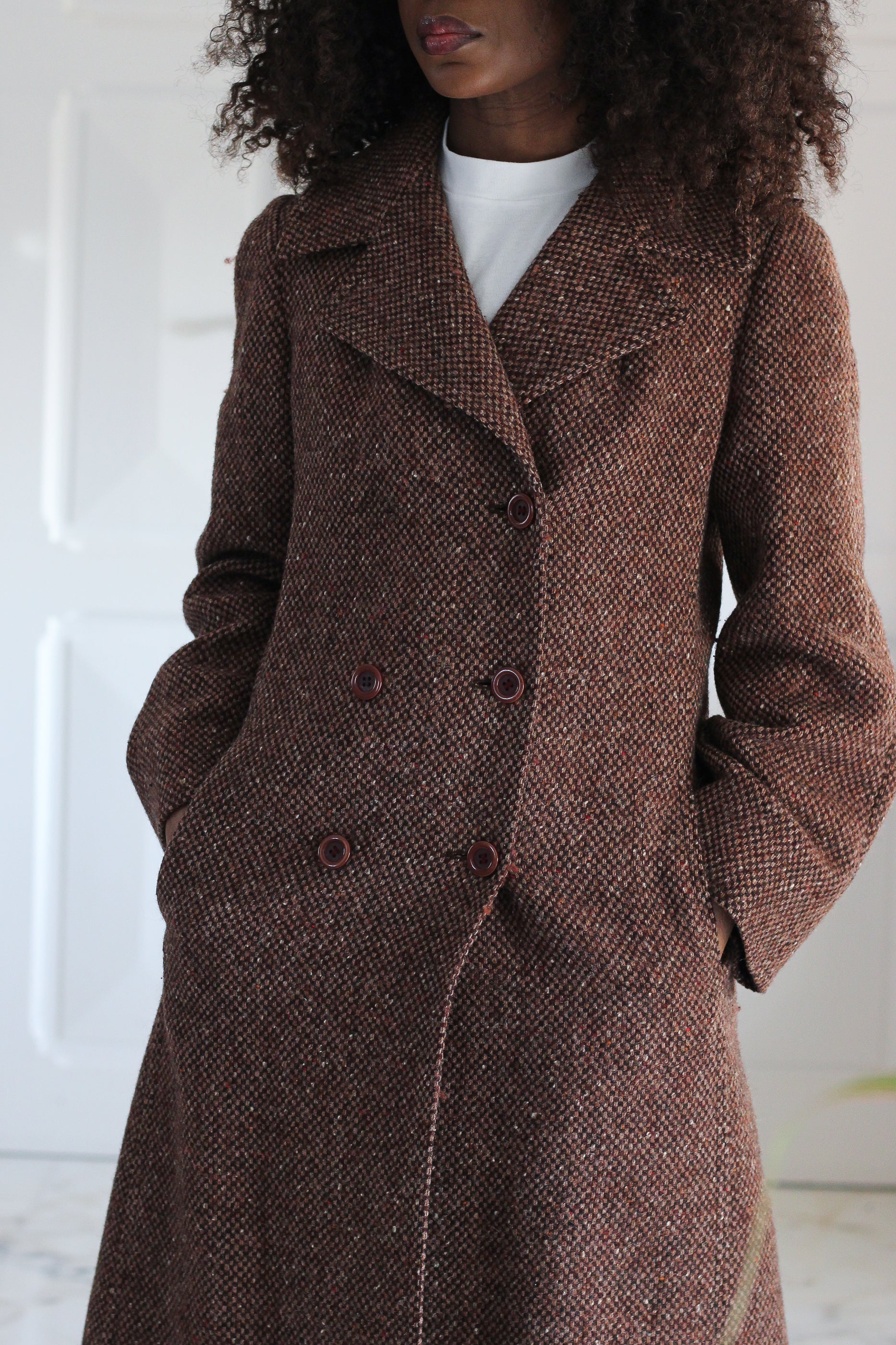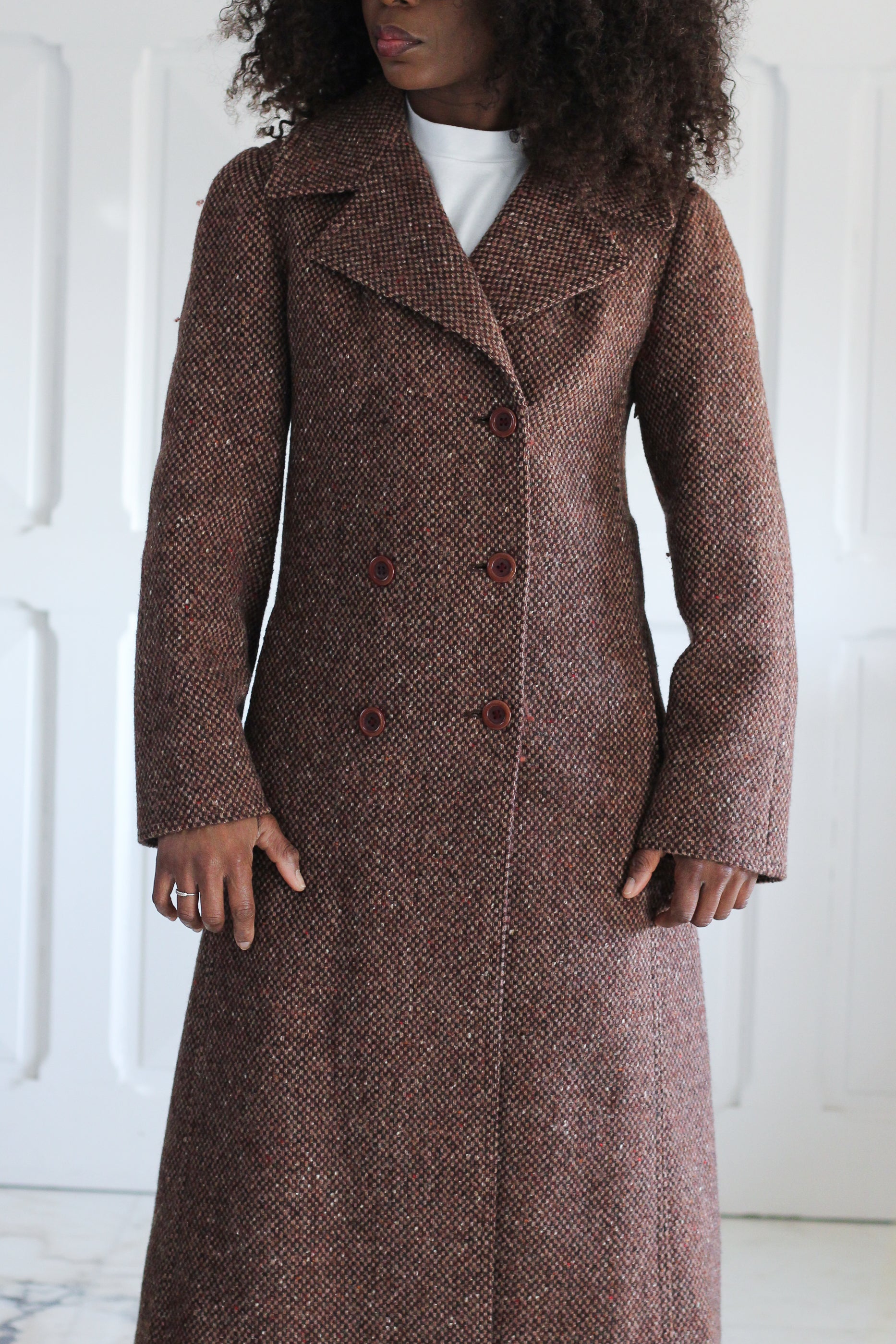 Manteau vintage en laine, des années 1970, confectionné dans un tissu tweed épais et structuré à l’élégant motif . Coupe longue et droite, col tailleur affirmé et fermeture croisée.