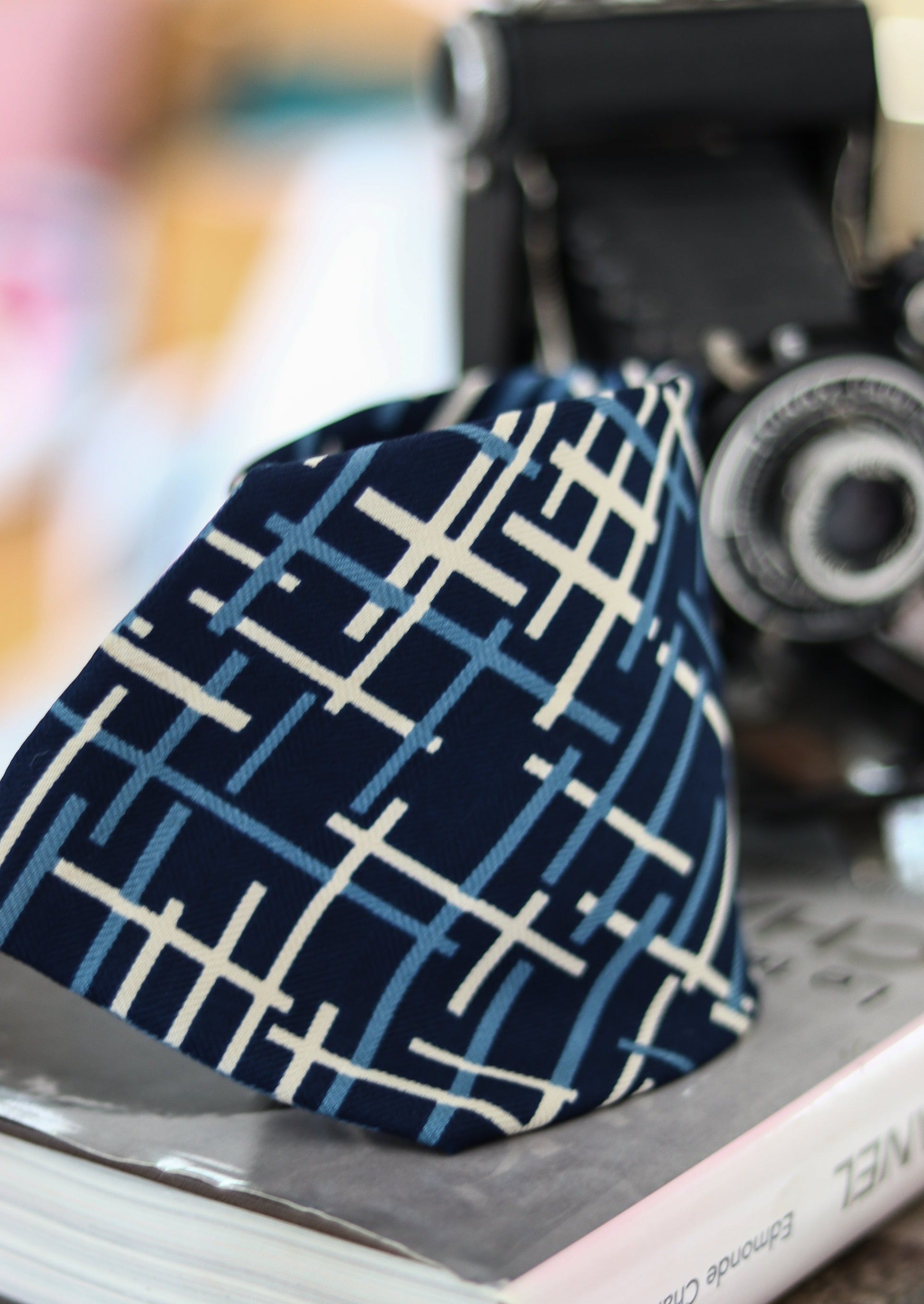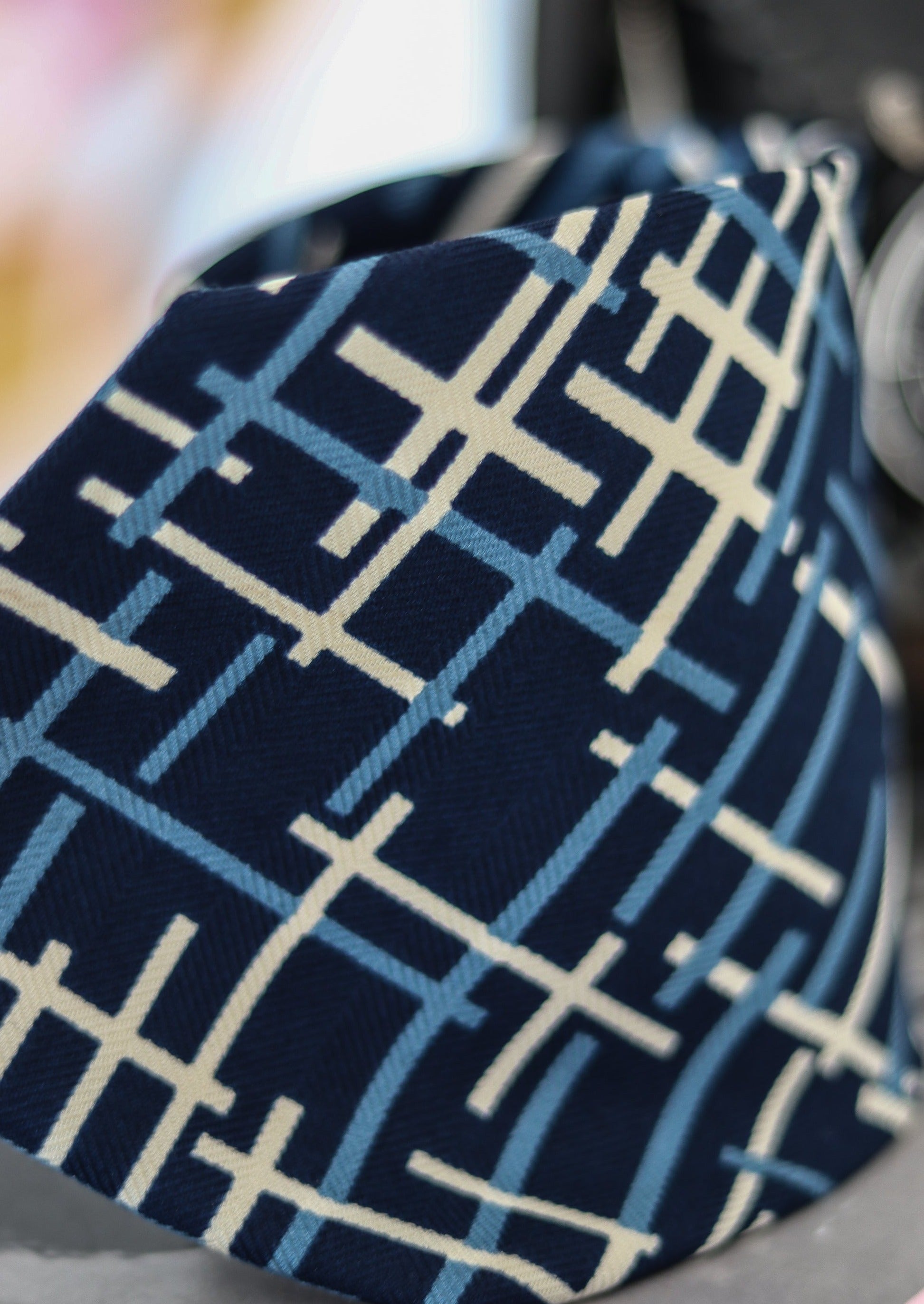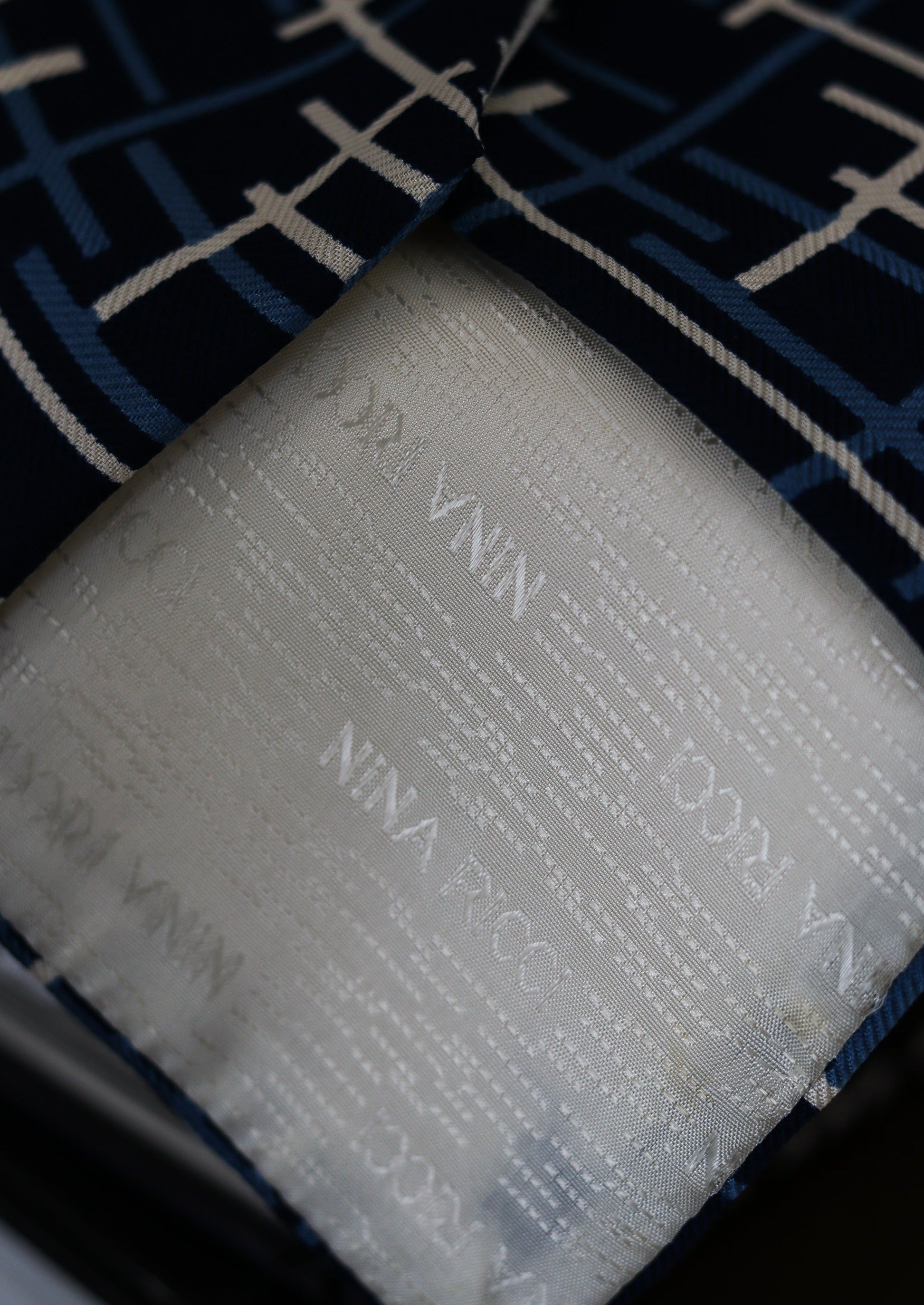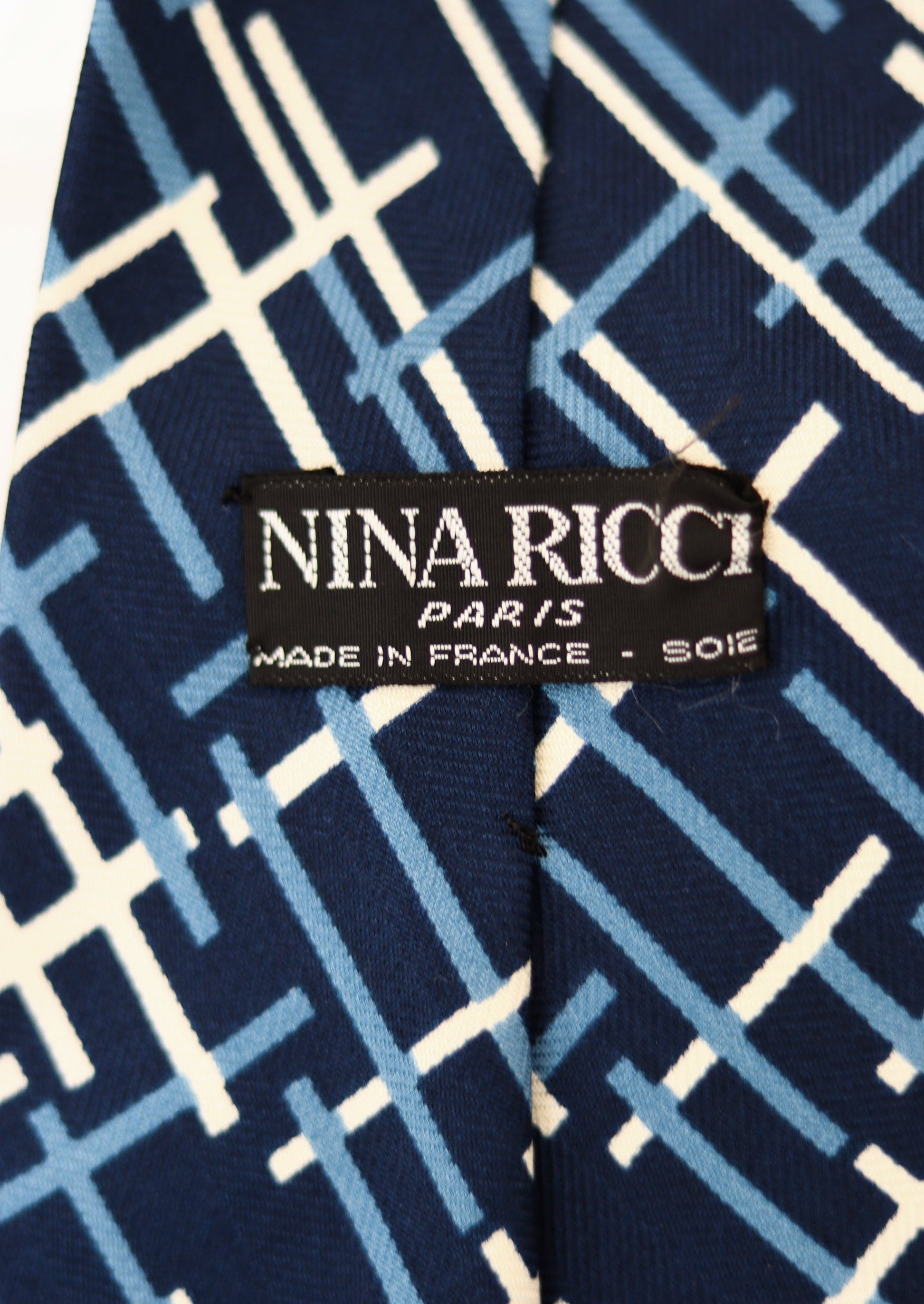 Cravate en soie signée Nina Ricci à motifs, logo imprimé dans la doublure. Fabrication française