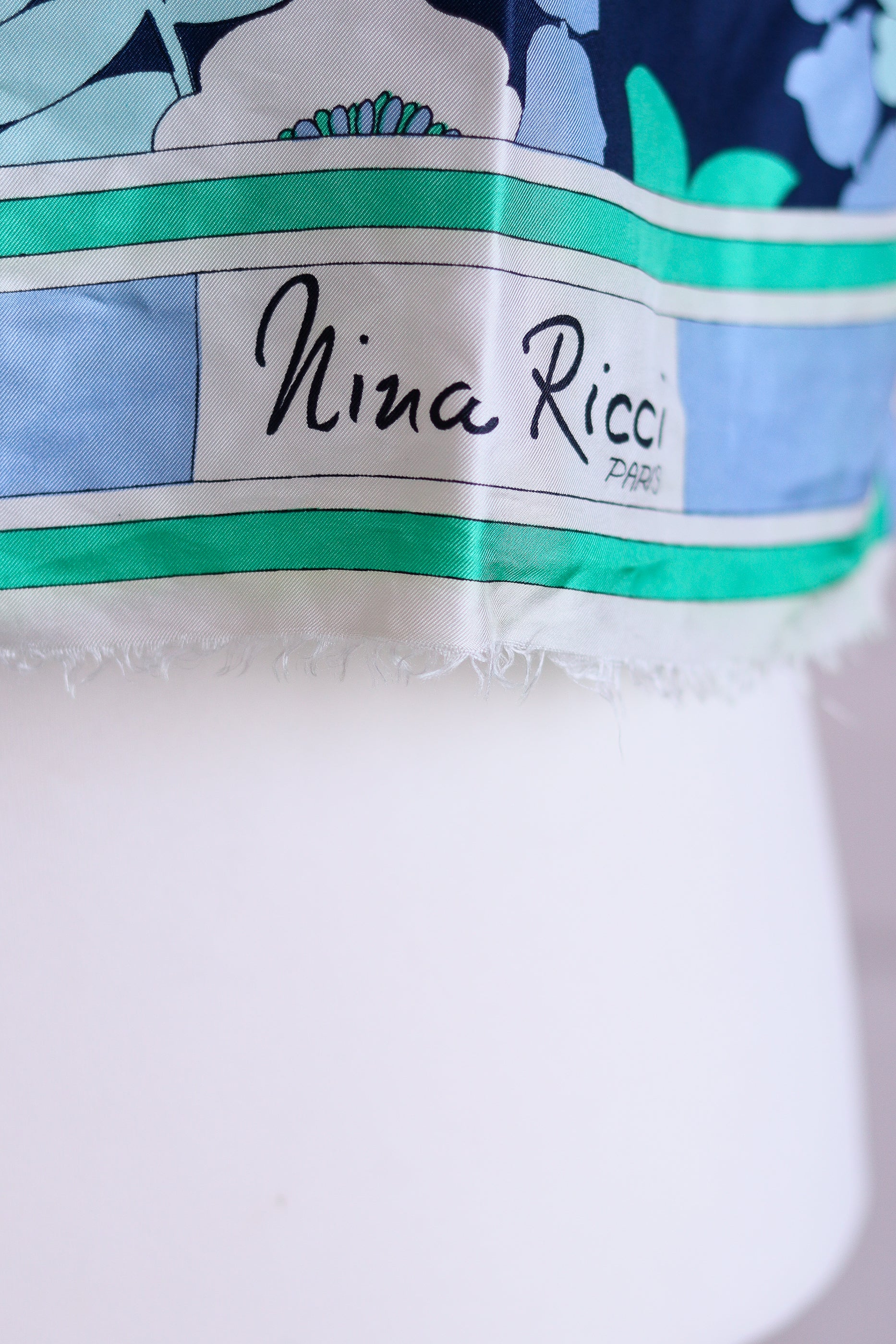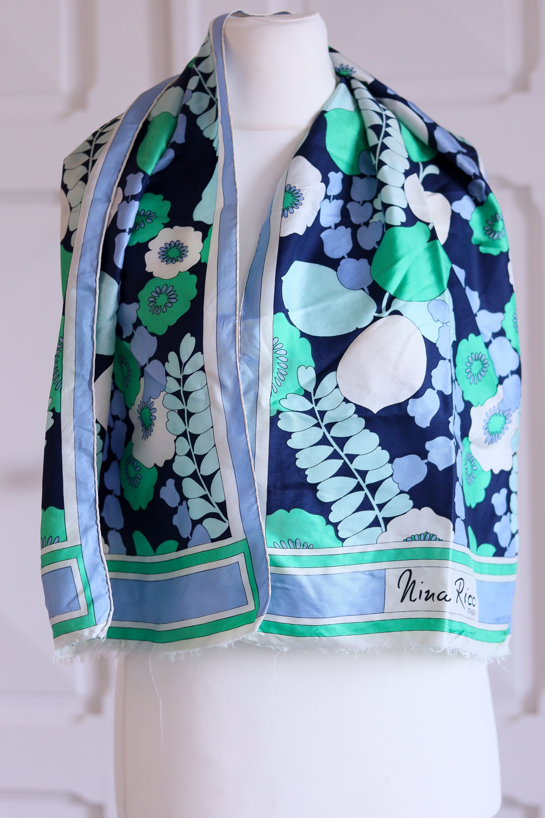 Echarpe imprimé floral signé Nina Ricci. Grand rectangle de soie vintage des années 1970. Bords roulottés à la main