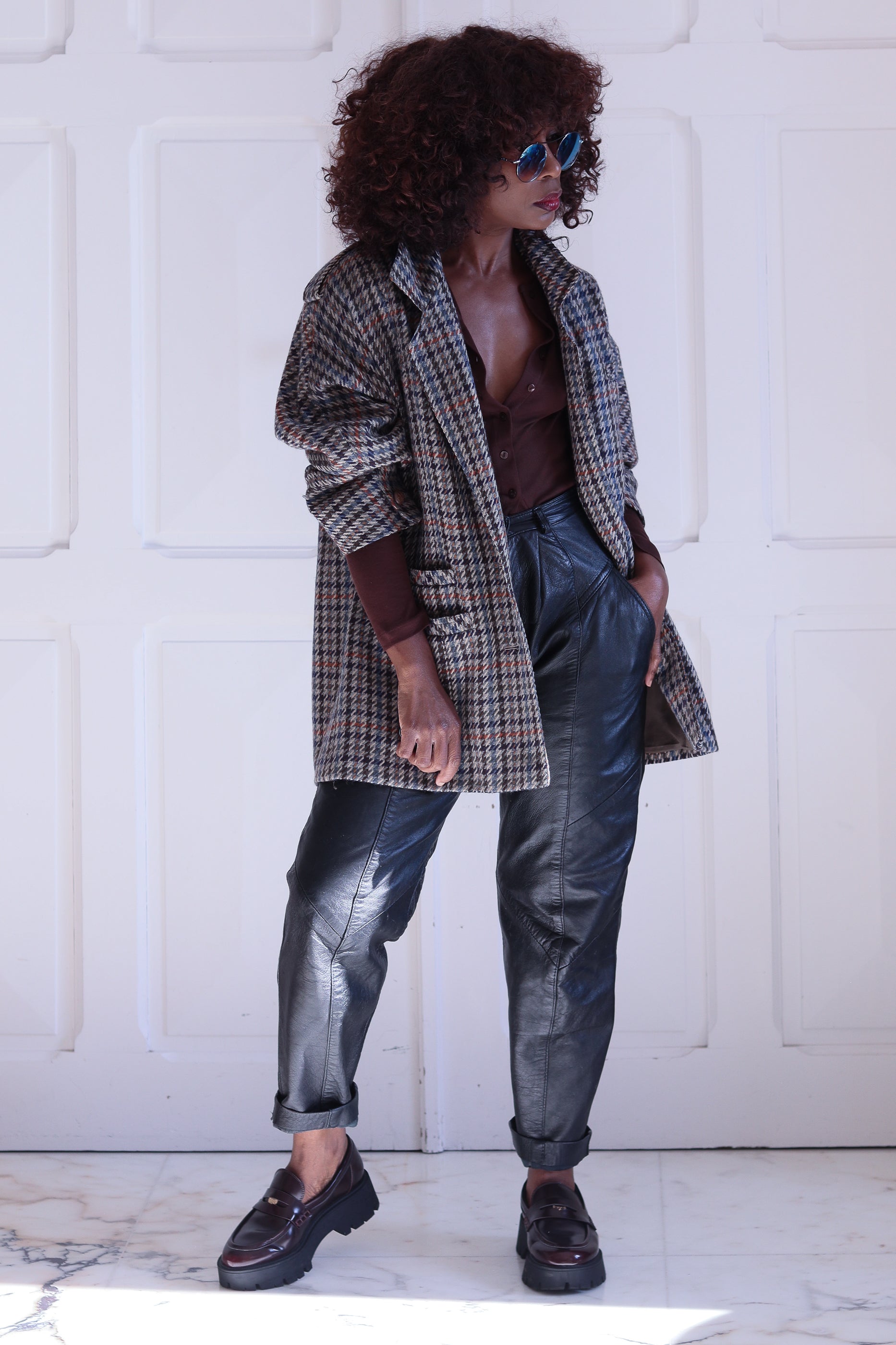 Pantalon en cuir noir, vintage des années 1980. Pantalon taille haute coupe un peu boyfriend. On aime le charme de ses coutures composés de plusieurs panneaux