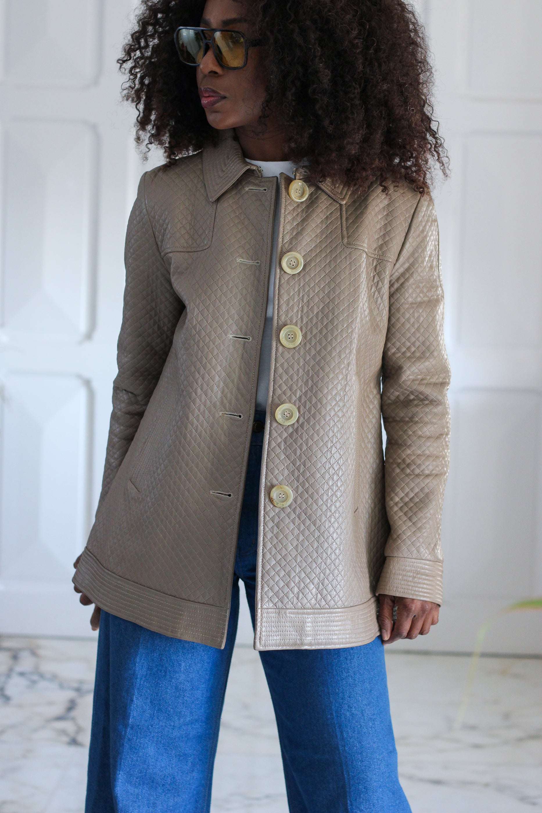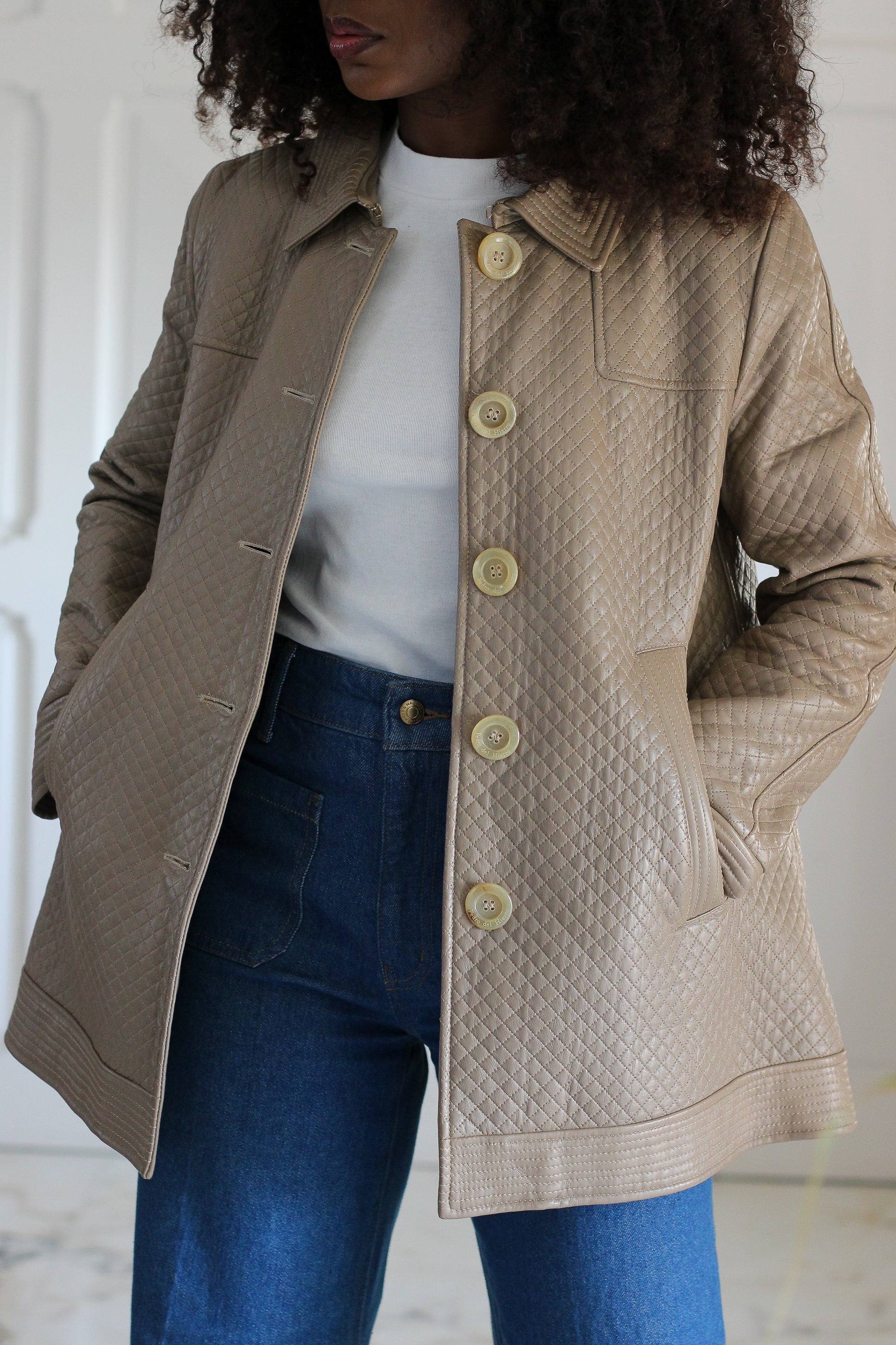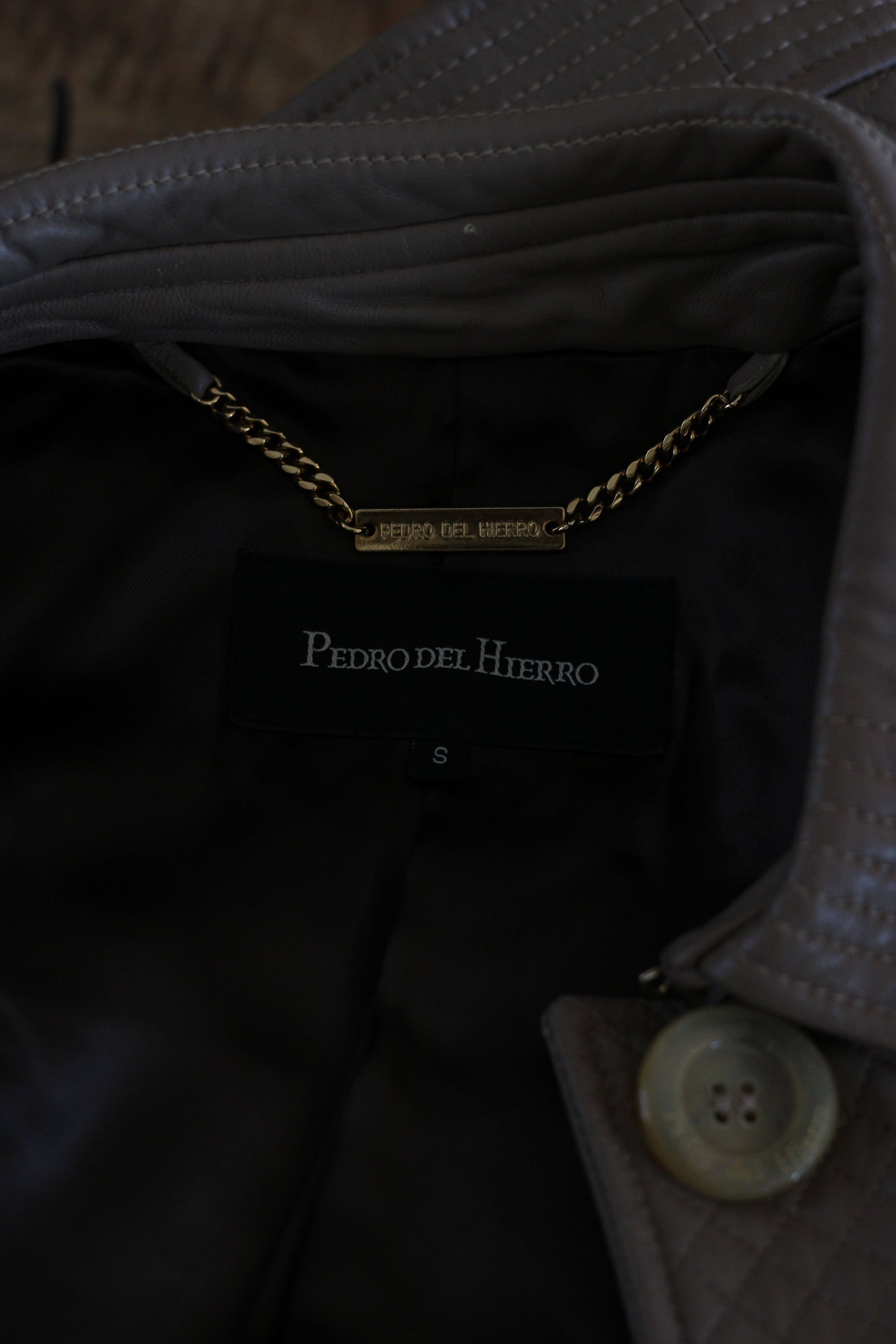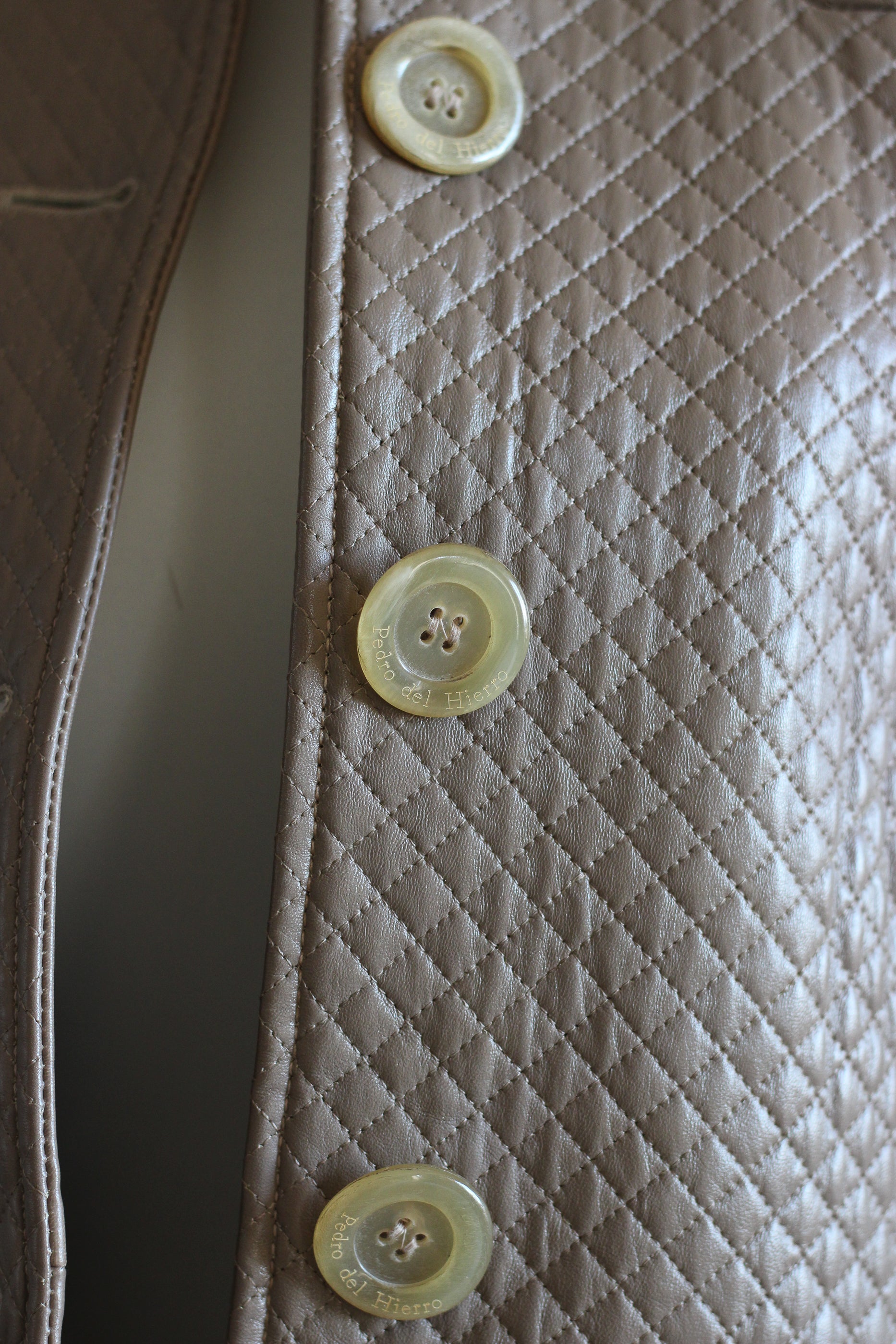 Veste en cuir d'agneau, vintage signée Pedro del Hierro, datant des années fin 1990, confectionnée dans un cuir matelassé taupe à la texture souple et raffinée. Coupe droite légèrement cintrée, soulignée par un matelassage en losanges et de larges boutons nacrés siglés sur le devant. Col structuré, poches discrètes et finitions soignées, avec détail signature à l’intérieur (chaînette griffée). Une pièce élégante et intemporelle, à l’équilibre parfait entre allure chic et modernité, idéale pour structurer un dressing contemporain avec subtilité