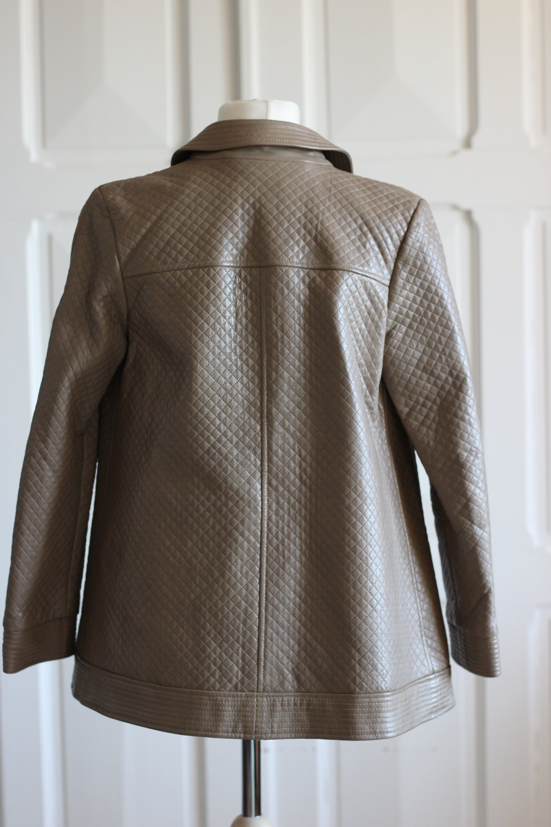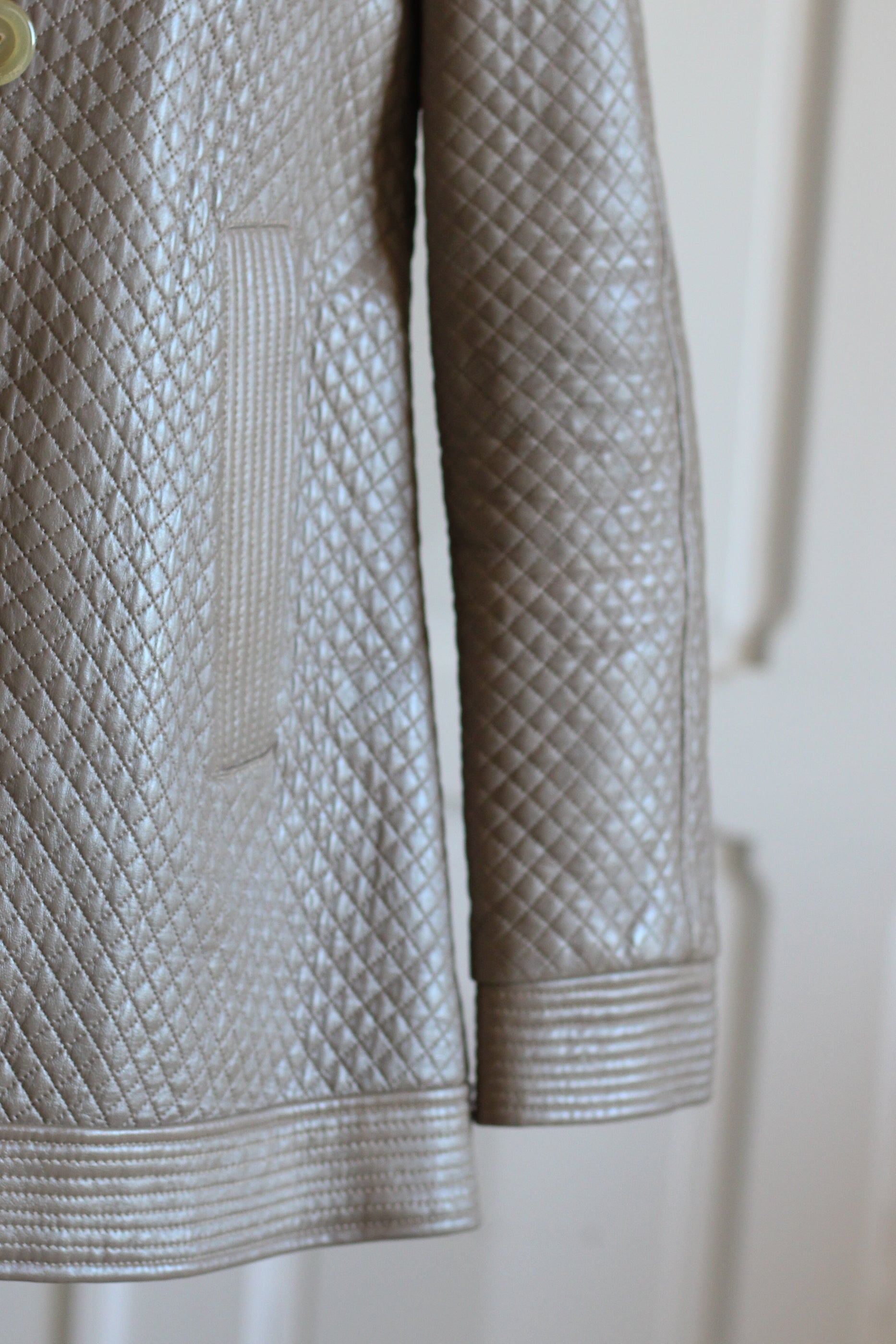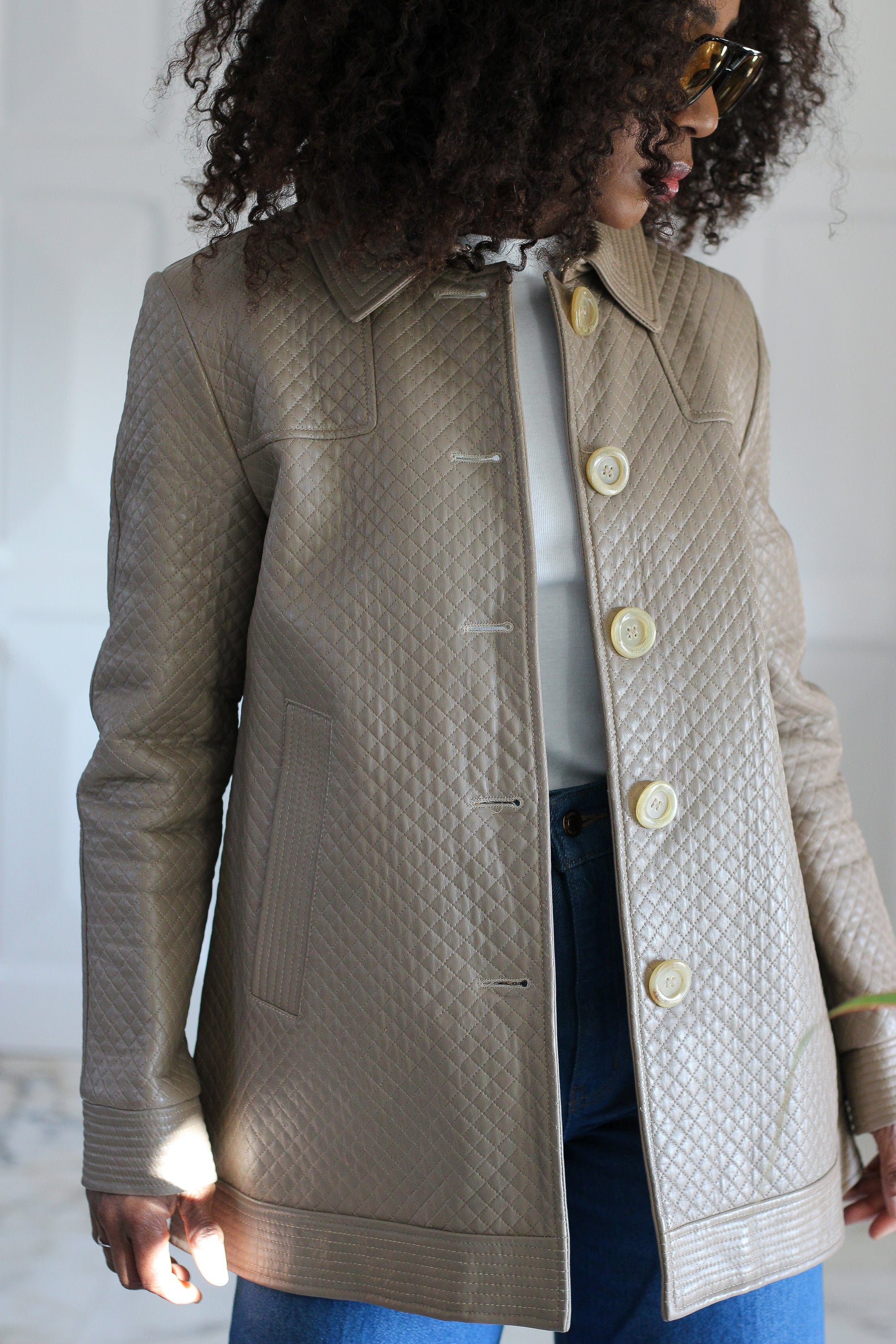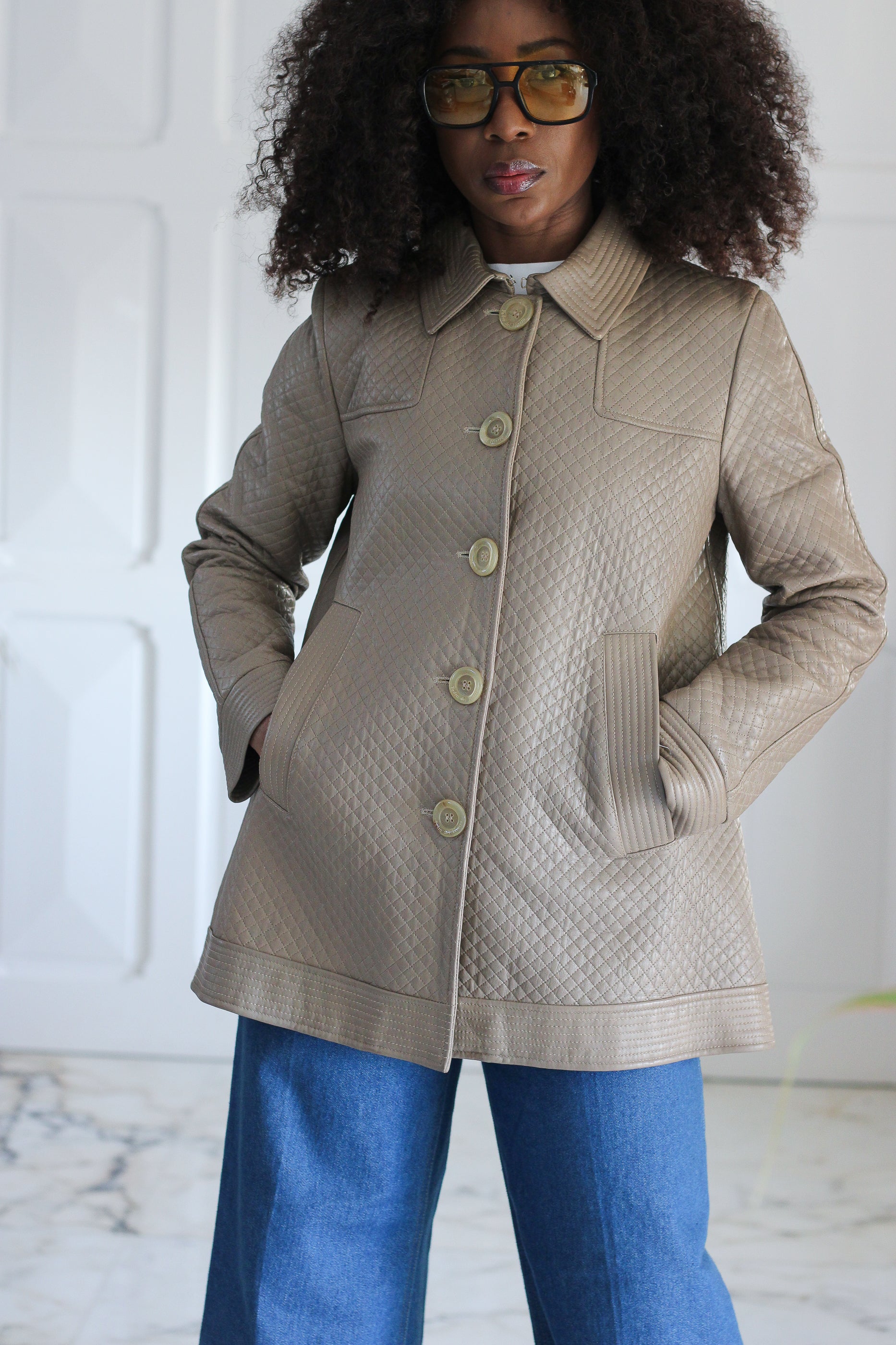Veste en cuir d'agneau, vintage signée Pedro del Hierro, datant des années fin 1990, confectionnée dans un cuir matelassé taupe à la texture souple et raffinée. Coupe droite légèrement cintrée, soulignée par un matelassage en losanges et de larges boutons nacrés siglés sur le devant. Col structuré, poches discrètes et finitions soignées, avec détail signature à l’intérieur (chaînette griffée). Une pièce élégante et intemporelle, à l’équilibre parfait entre allure chic et modernité, idéale pour structurer un dressing contemporain avec subtilité