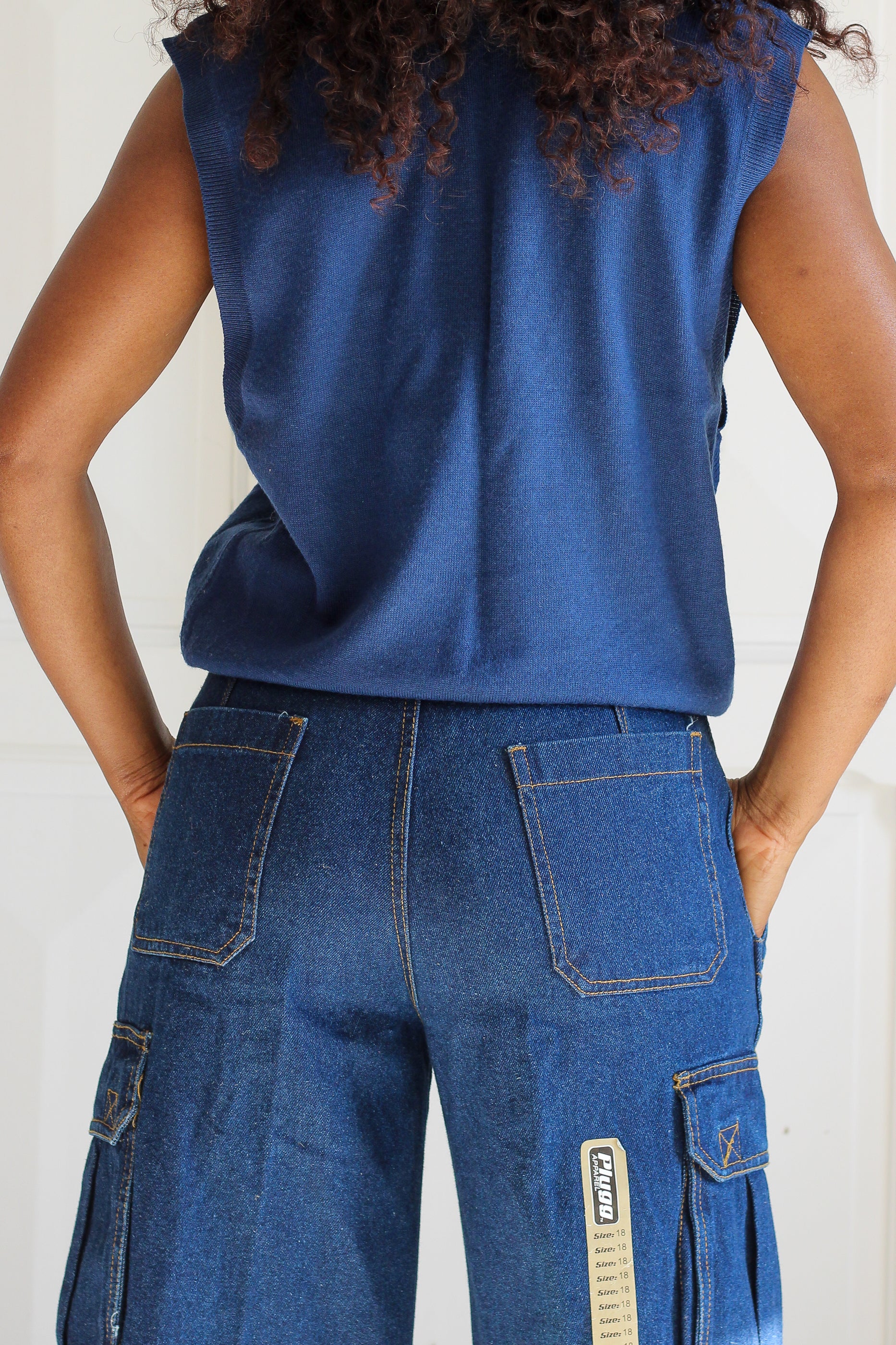 Pantalon en denim bleu avec coupe large et taille haute, très confortable et dans l’air du temps. Détails cargo avec poches latérales qui apportent du caractère et un côté utilitaire affirmé. Surpiqûres apparentes pour une finition robuste.
