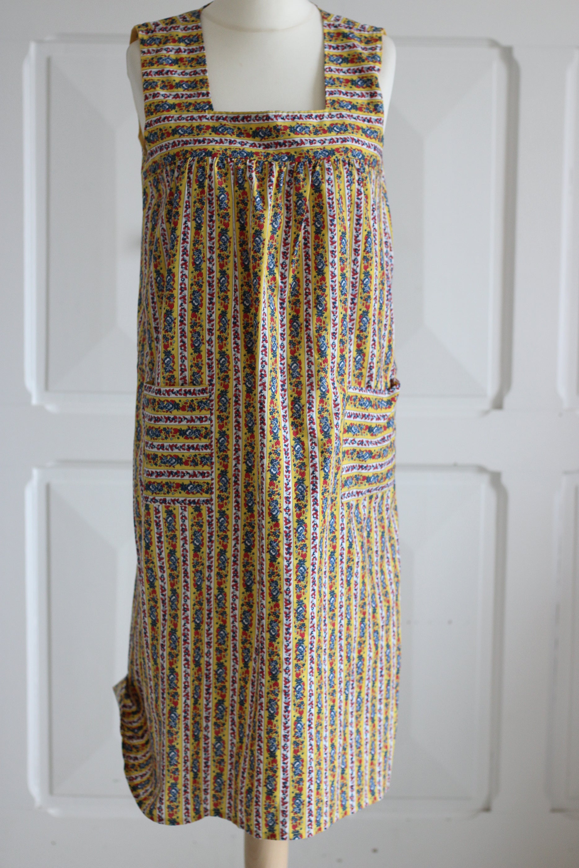 Authentique robe tablier vintage en coton imprimé, une pièce pleine de charme qui évoque le quotidien des maisons françaises dans les années 60 et au début des années 70. Robe datant des années 1970 en coton mélangé composé de 50 % de coton et de 50 % de polyester.