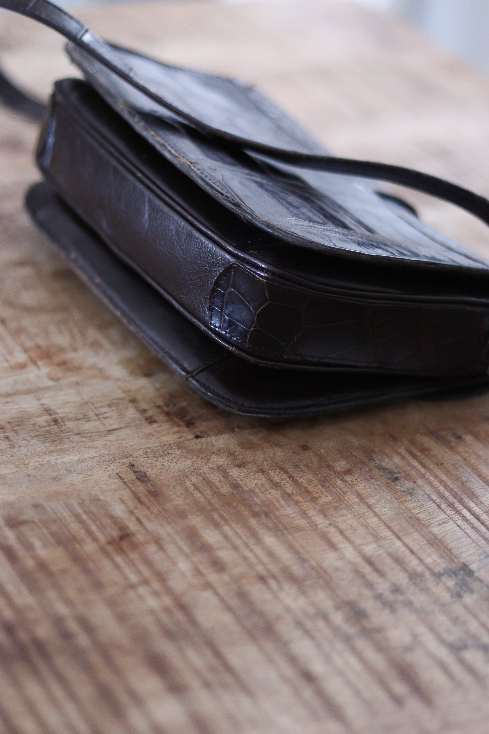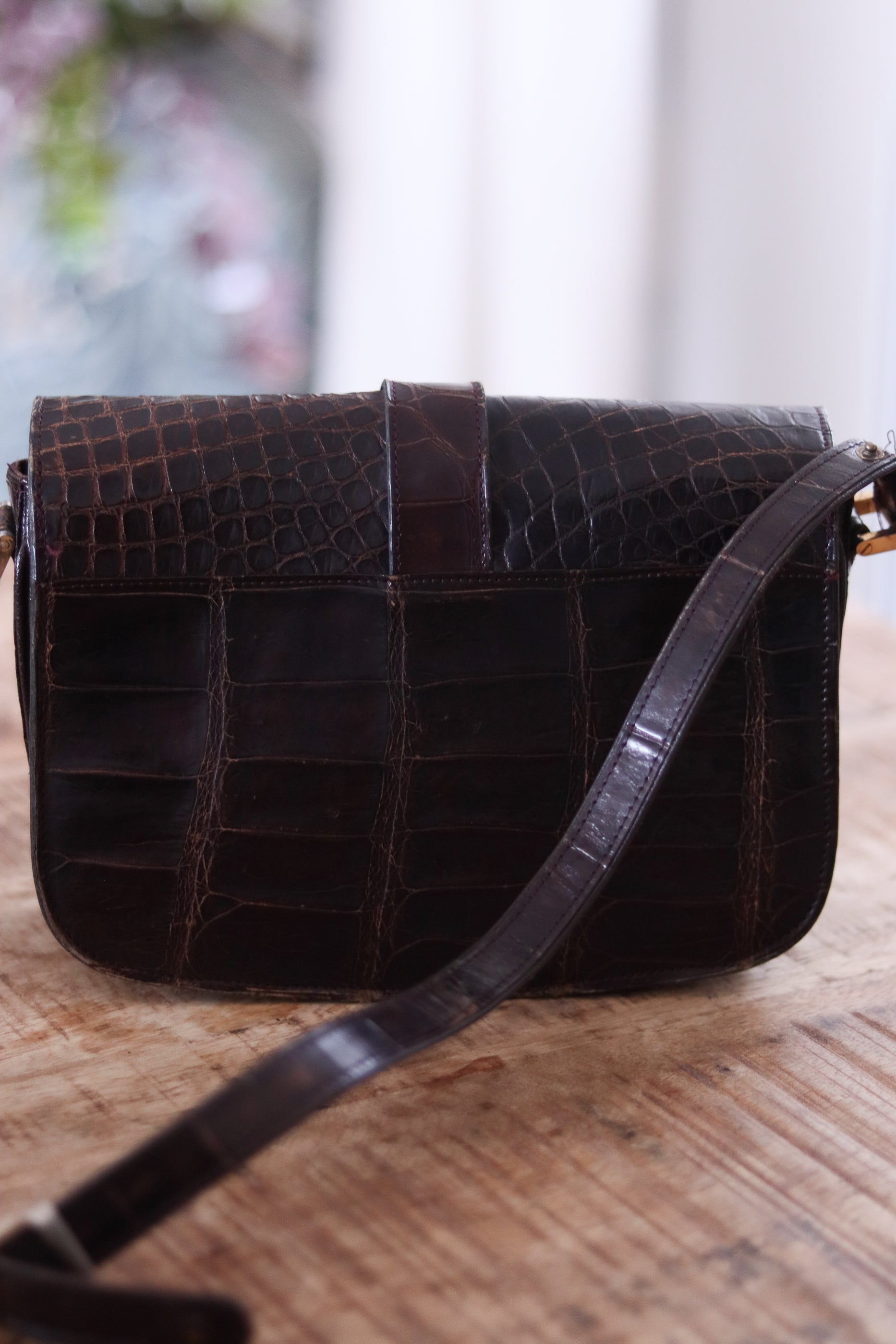 Élégance, structure et savoir-faire français. Sac signé Berma Paris est une pièce emblématique des années 70, confectionnée dans un cuir rigide en croco d’un brun profond. Son fermoir bijou argenté et sa anse courte en font un compagnon raffiné, aussi chic porté à la main qu’à l’épaule. Sangle amovible