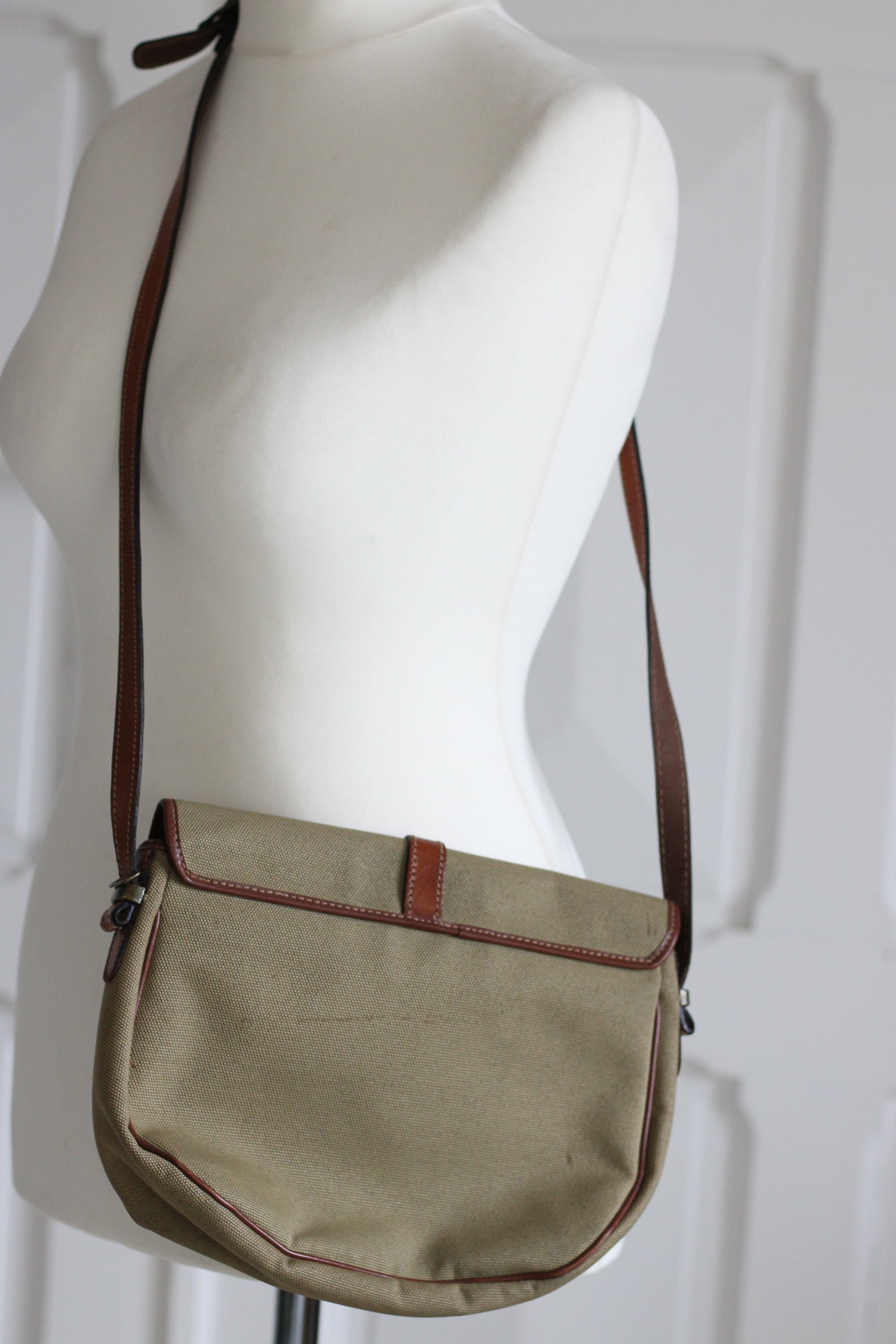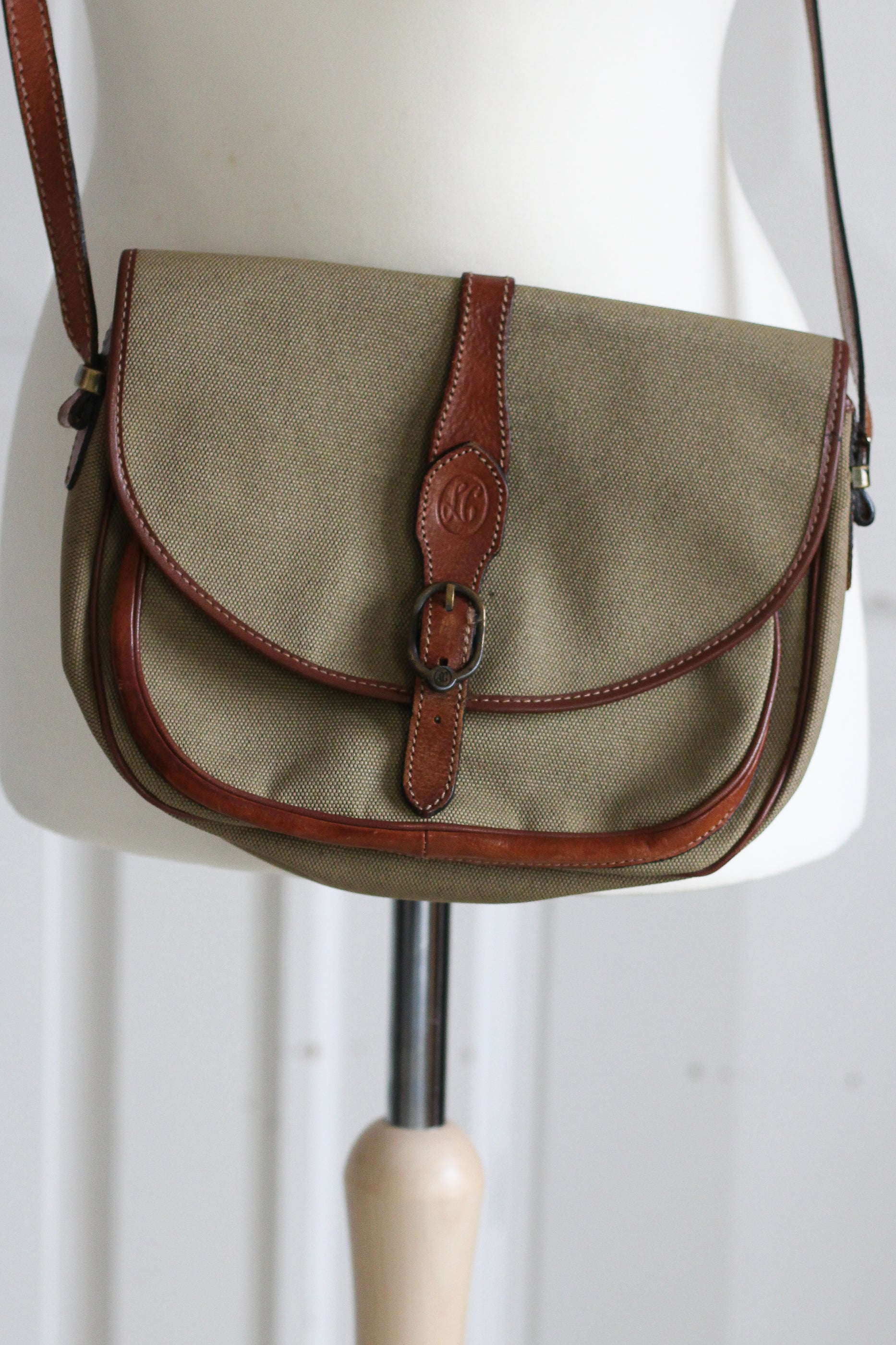 Sac vintage en toile épaisse beige et cuir lisse marron des années 1980, Bordure en simili cuir. Intérieur composé d'un grand compartiment et de deux poches avec fermetures à glissière. Modèle porté épaule ou en bandoulière, rabat arrondi avec lanière en cuir et boucle métallique avec sigle LC.