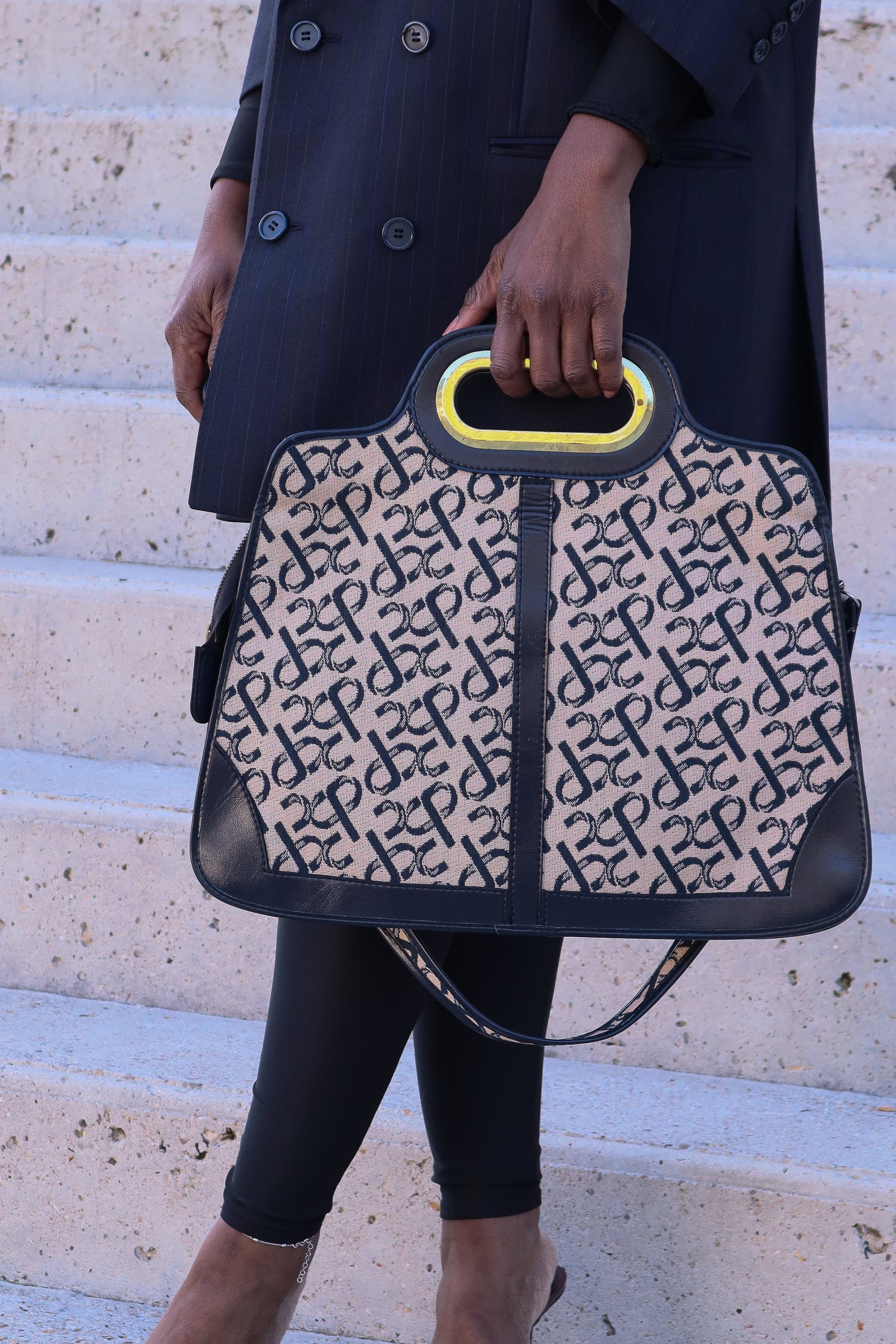 Élégance intemporelle pour ce grand cabas en toile siglée CP. et cuir bleu marine. Les poignées rigides cerclées de doré lui donnent une touche architecturale et luxueuse